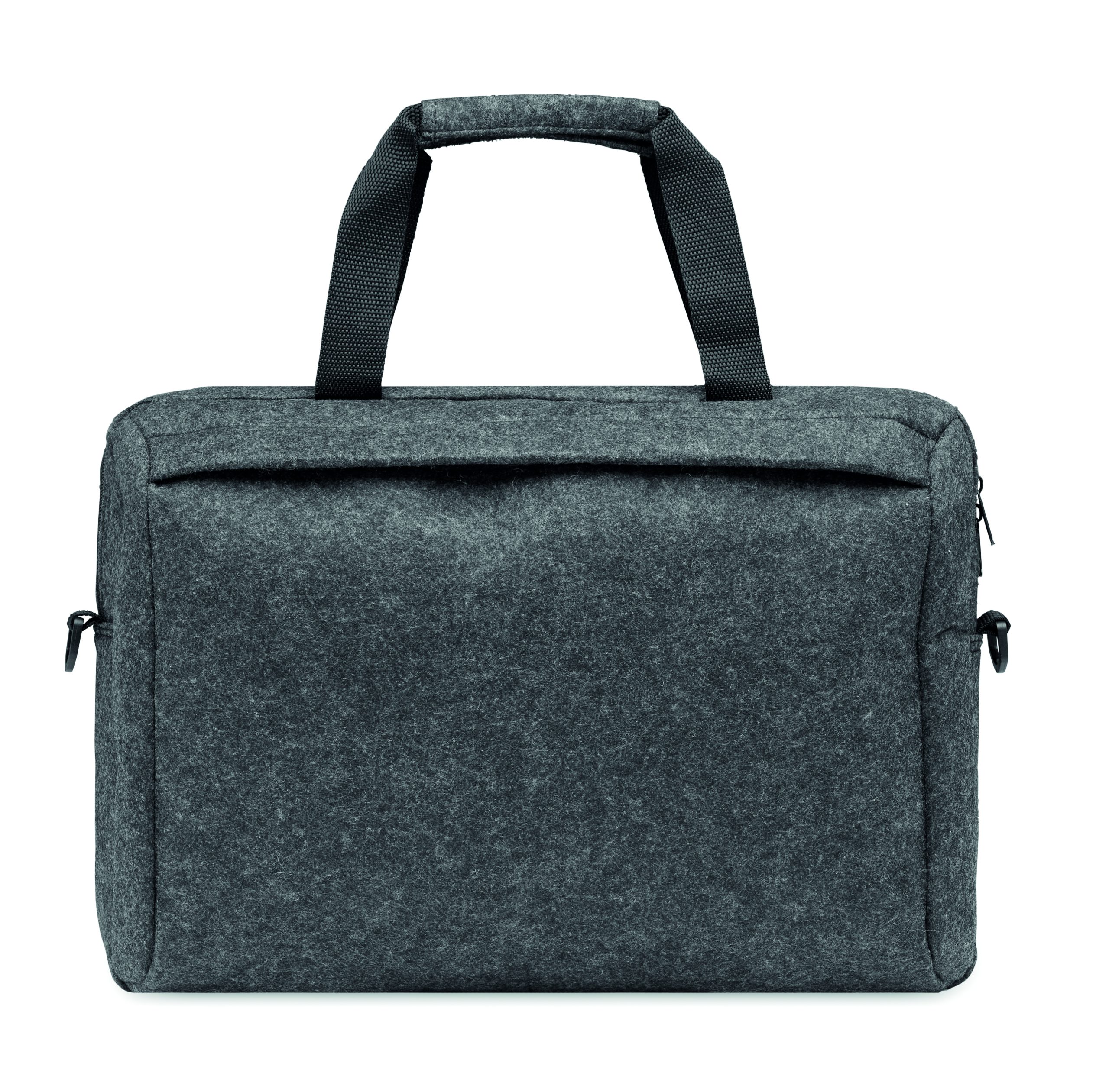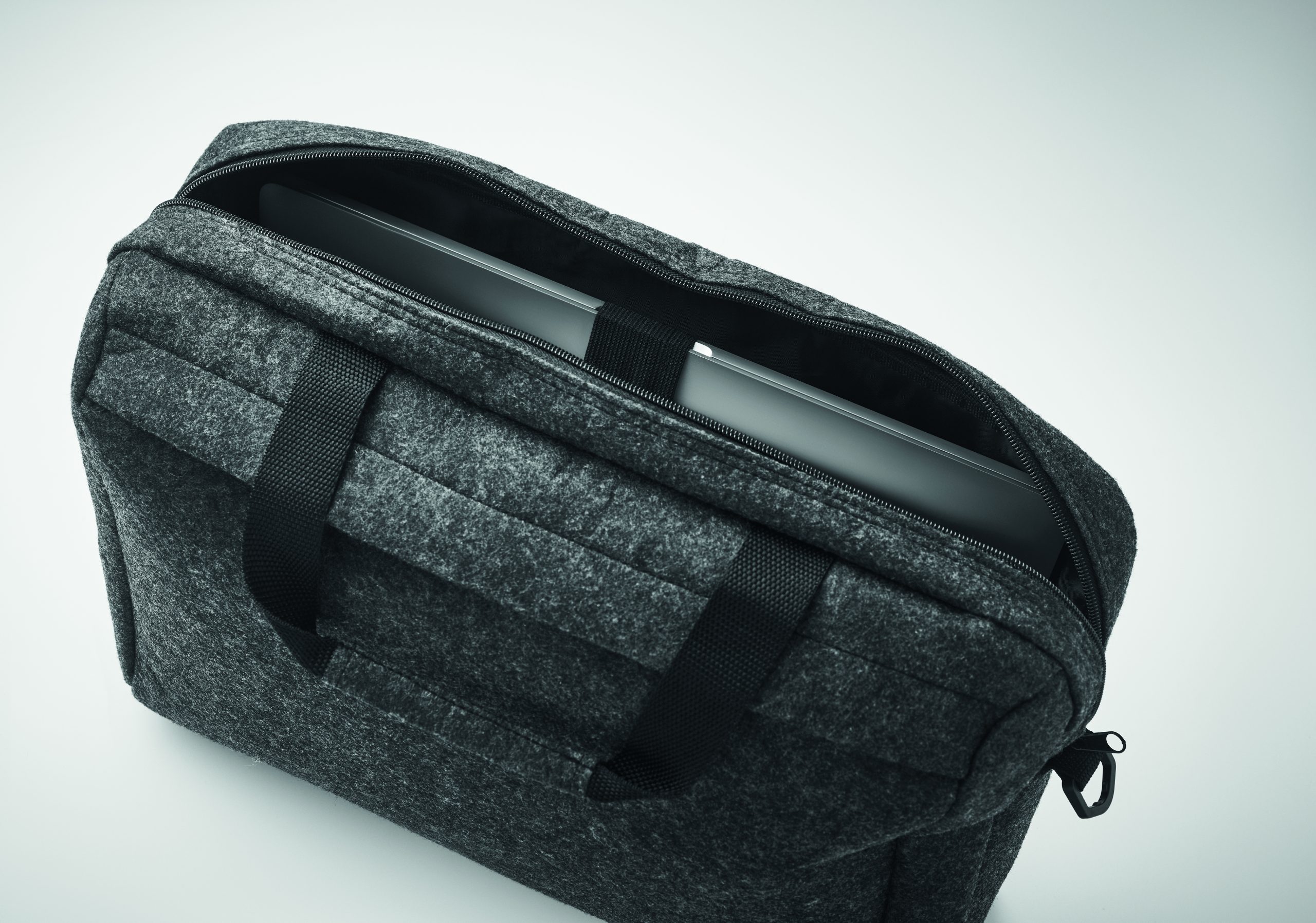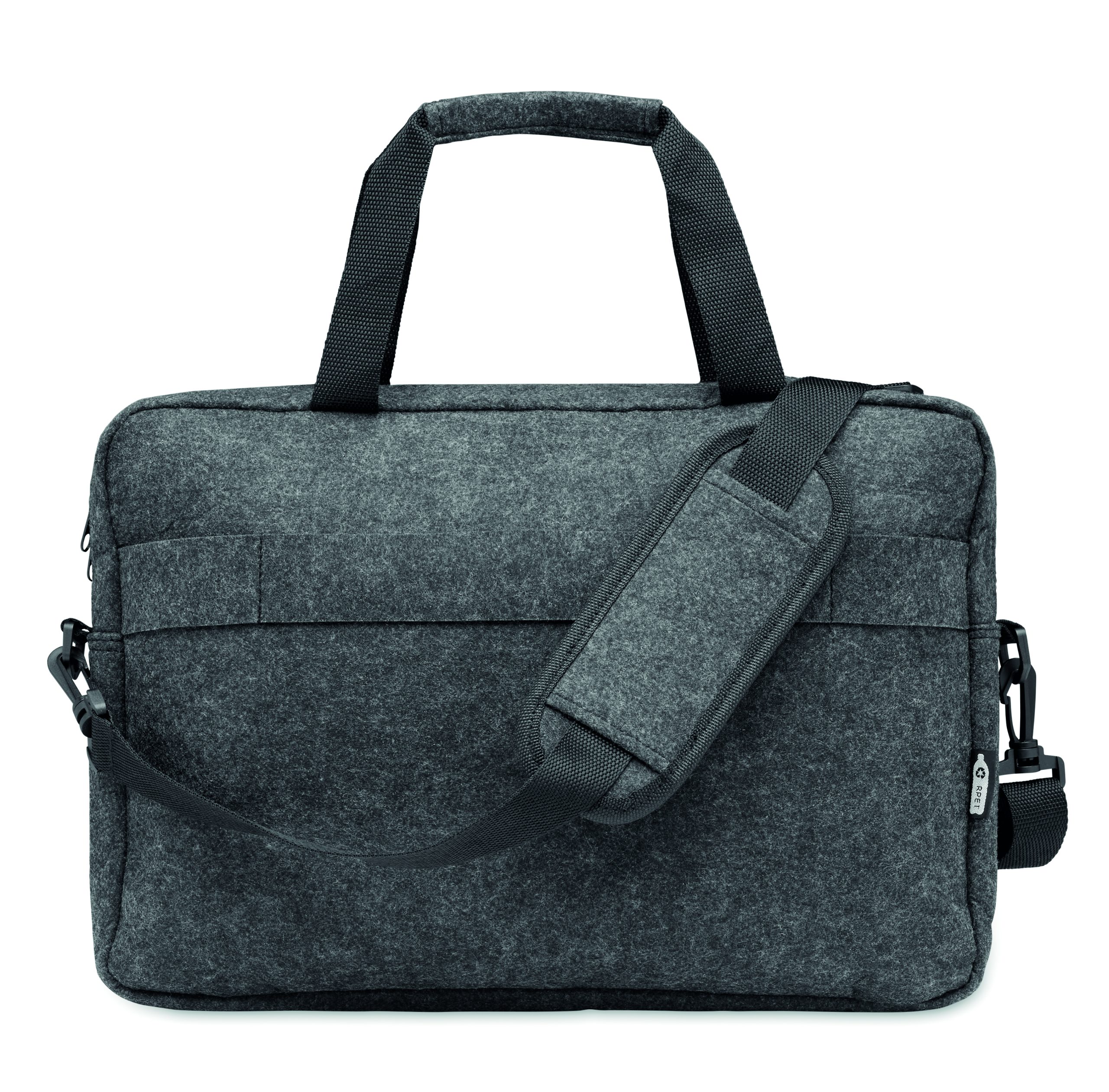 15-calowa torba na laptopa z filcu RPET z jedną główną przegrodą wewnętrzną i jedną zapinaną na zamek kieszenią przednią. Odpinany i regulowany pasek na ramię. Pasek na walizkę z tyłu.