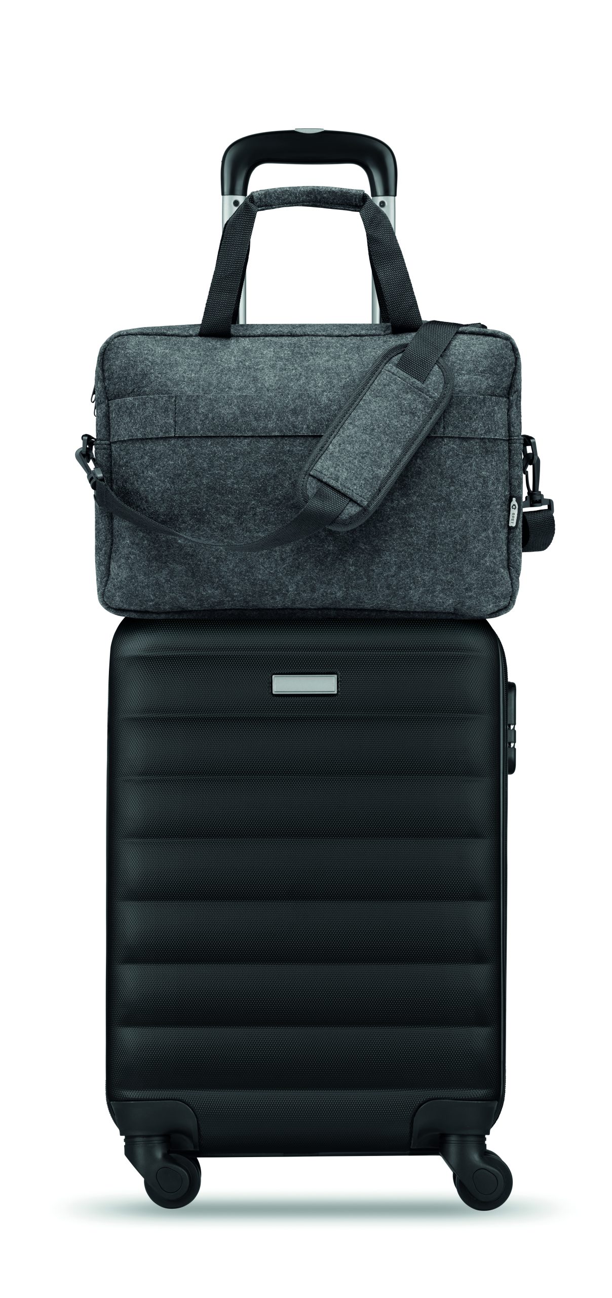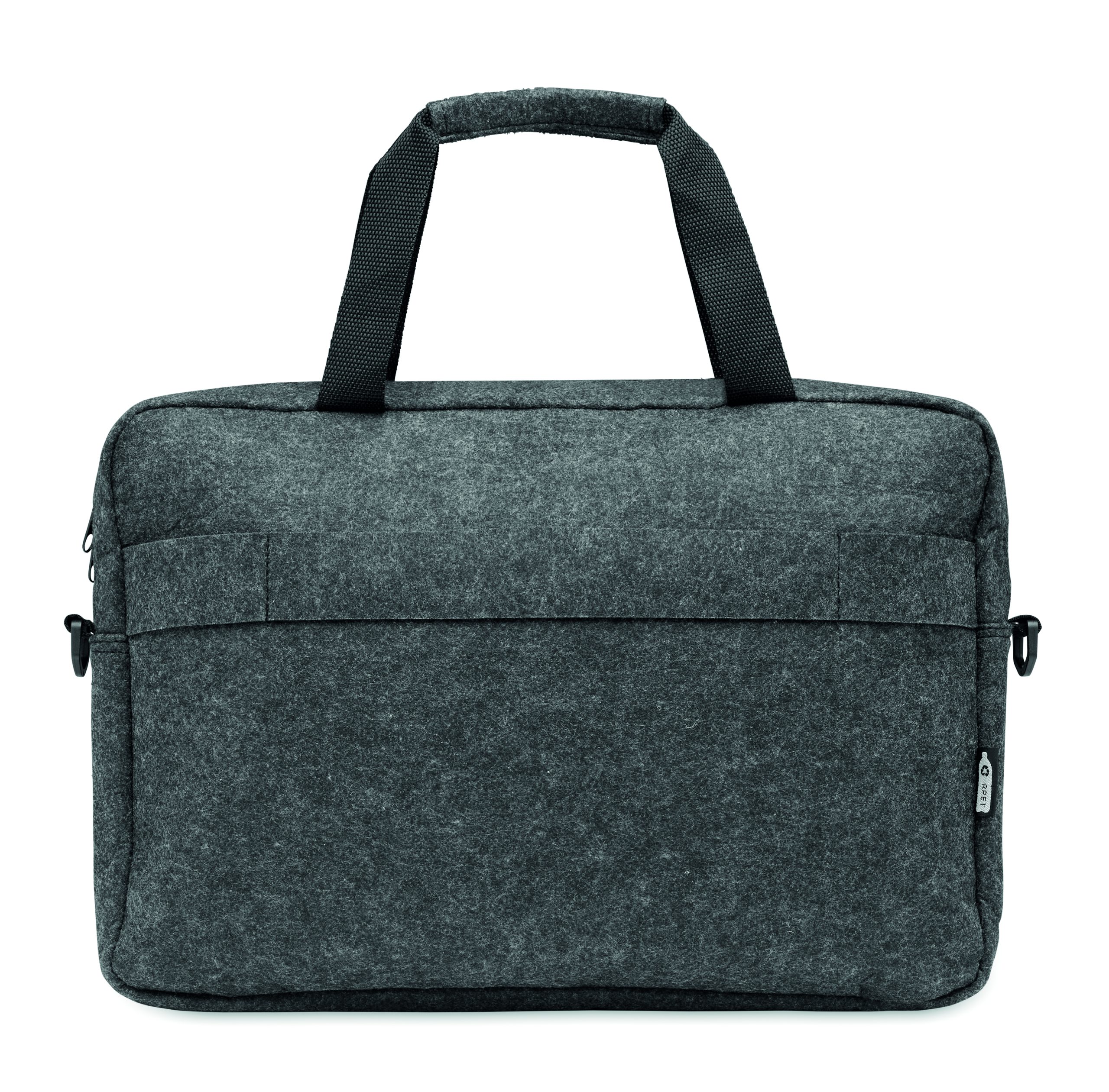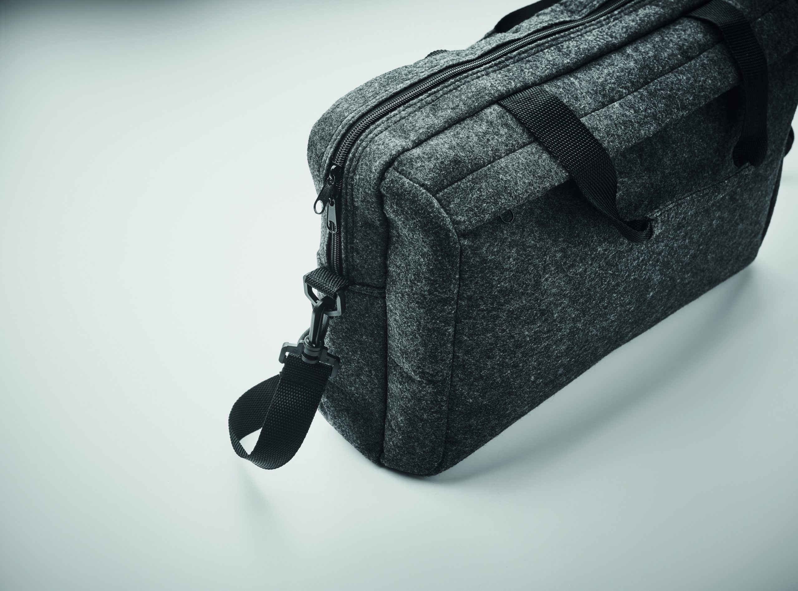 15-calowa torba na laptopa z filcu RPET z jedną główną przegrodą wewnętrzną i jedną zapinaną na zamek kieszenią przednią. Odpinany i regulowany pasek na ramię. Pasek na walizkę z tyłu.