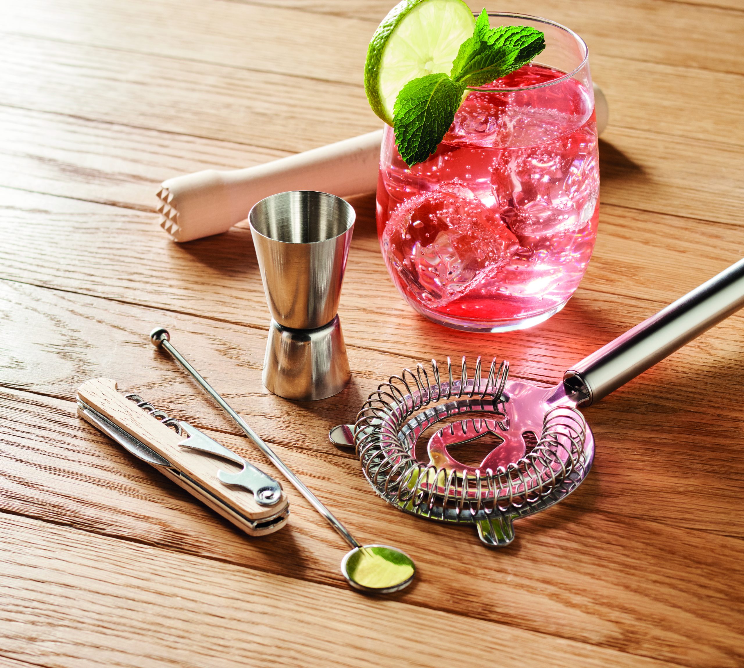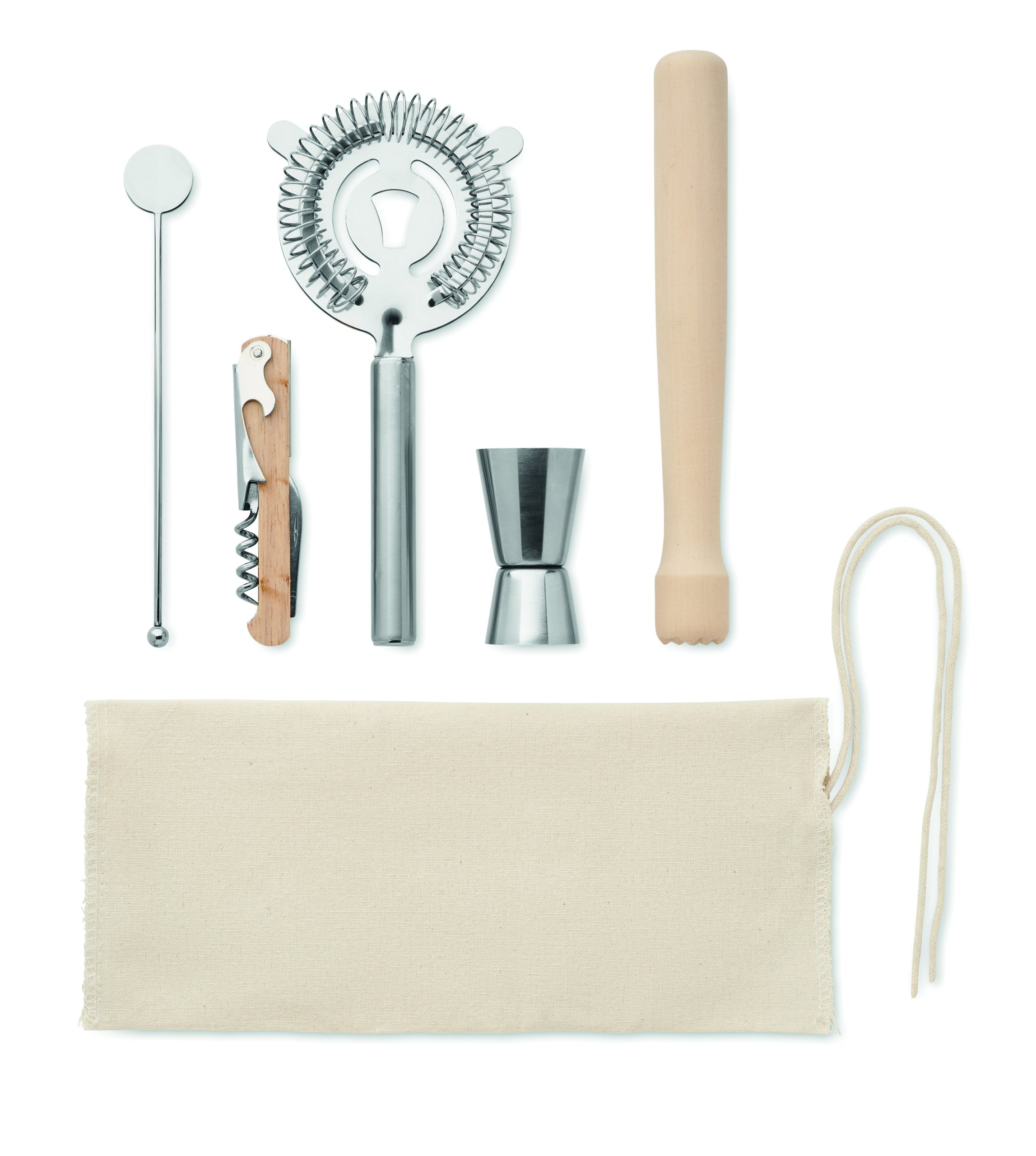 Zestaw koktajlowy w bawełnianym etui ze sznurkiem. Zawiera 5 elementów: dwustronną miarkę (15 i 30 ml), drewniany muddler, sitko do koktajli, mieszadełko do drinków i korkociąg kelnerski.