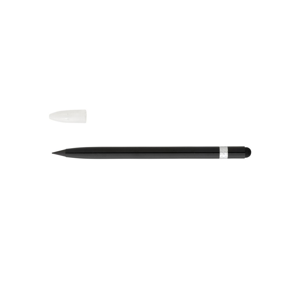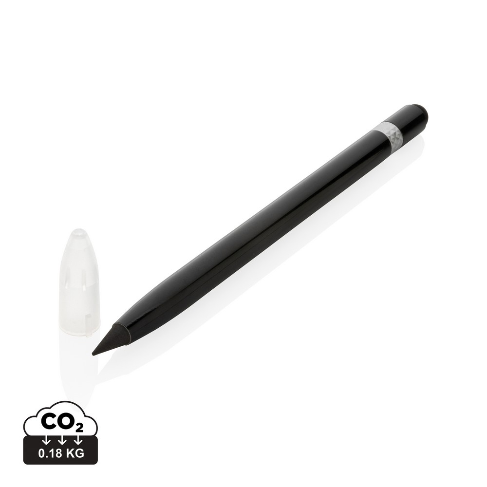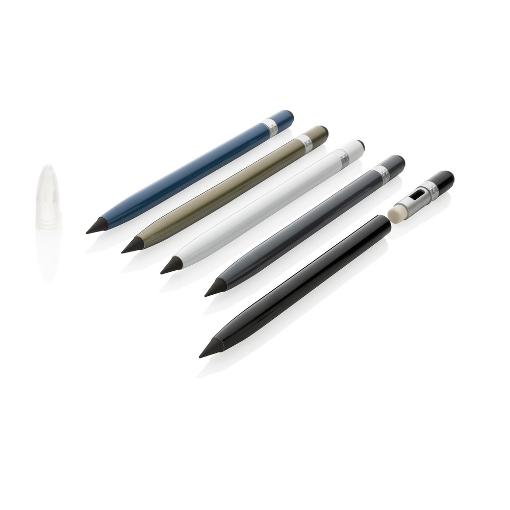 „Wieczny” ołówek z gumką, aluminiuowy trzon, dzięki wykorzystaniu specjalnej wolnościerającej się grafitowej końcówki długość pisania ołówka to około 20 000 metrów, notatki można zmazać standardową gumką do mazania, ślad węglowy produktu: 0,12 kg CO2