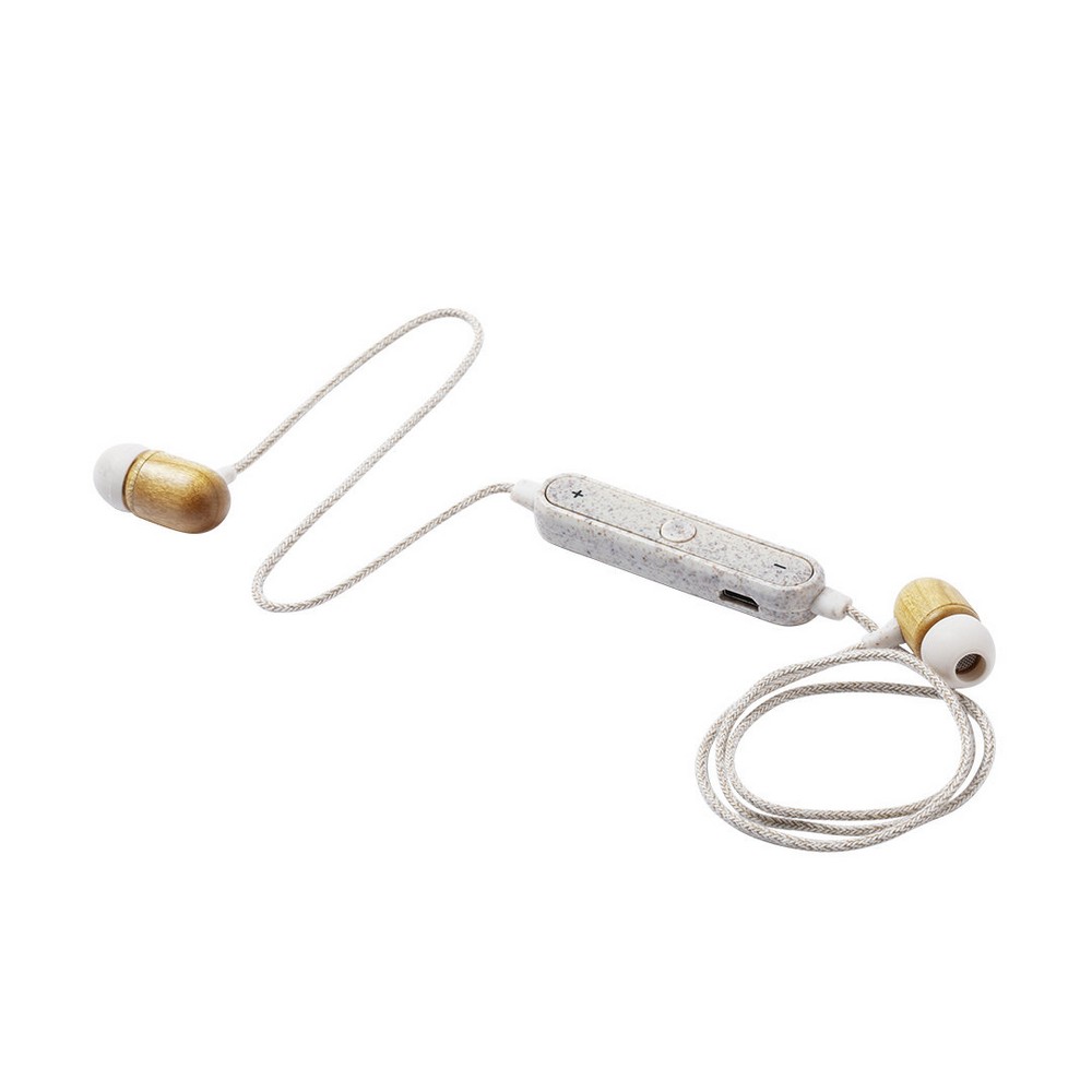 Słuchawki bezprzewodowe BT 5.0, douszne, słuchawki wykonane z bambusa, panel regulacji wykonany ze słomy pszenicznej, kable pokryte materiałem z konopi, funkcja odbierania połączeń, panel regulacji, ładowane przez USB, zasięg do 10 m, bateria 60 mAh, czas pracy: 3h, kabel micro USB w komplecie