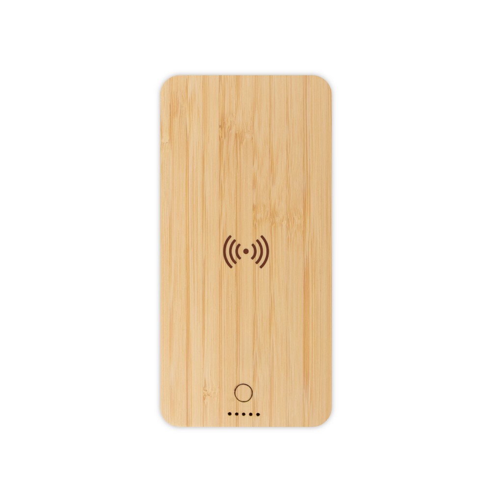 Bambusowy power bank B’RIGHT 8000 mAh, ładowarka bezprzewodowa 15W, działa z urządzeniami posiadającymi możliwość ładowania indukcyjnego, 5 diod wskazujących poziom naładowania, wejście USB-C, 2 wyjścia USB 18W, wyjście USB-C 19W, kabel USB-C w komplecie