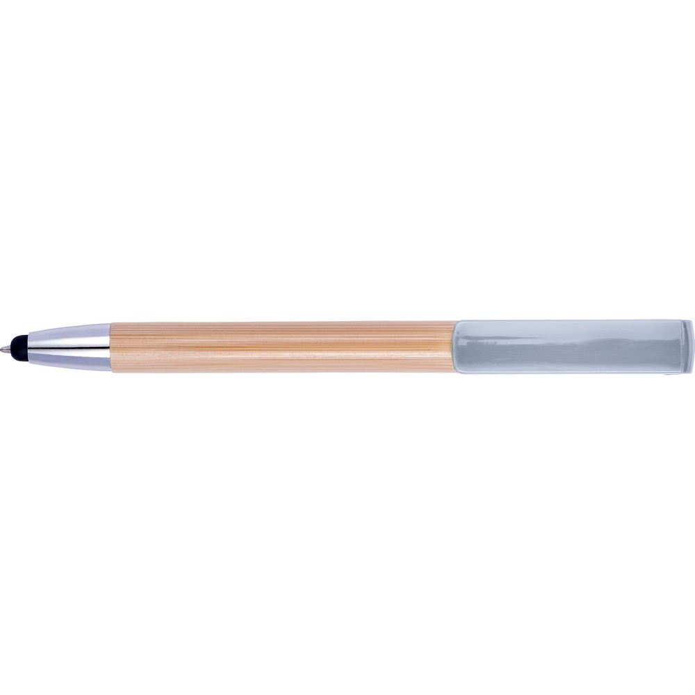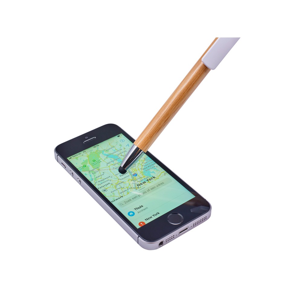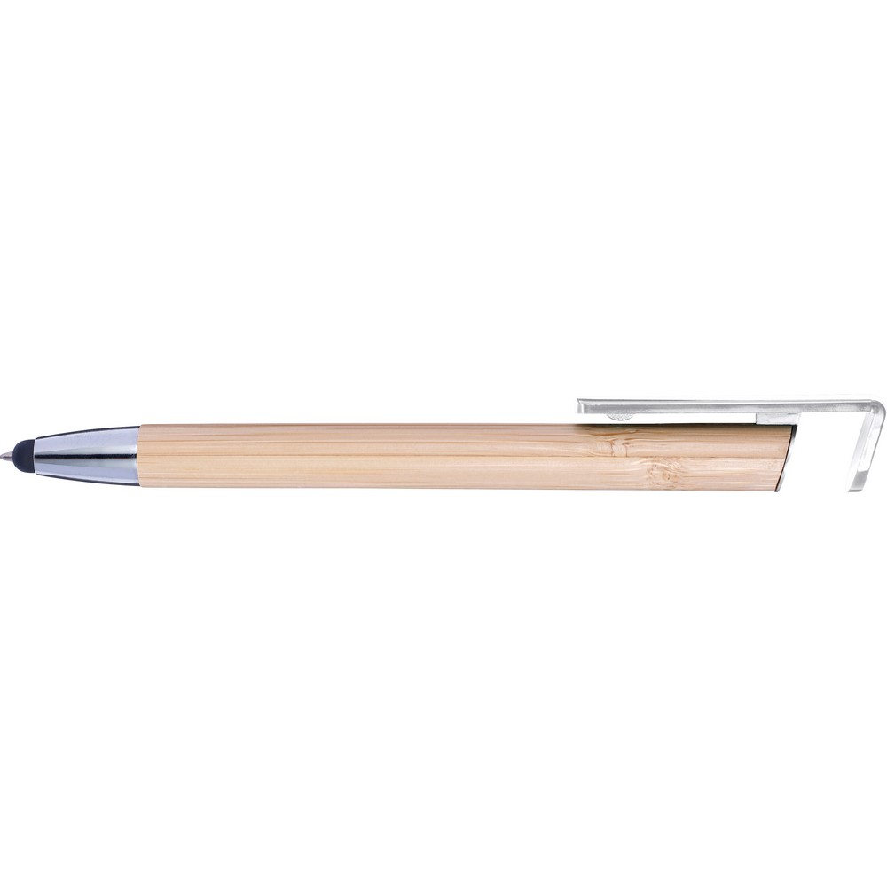 Długopis, touch pen, specjalny klip może służyć jako stojak na telefon, bambusowy trzon, kolorowe plastikowe elementy korpusu