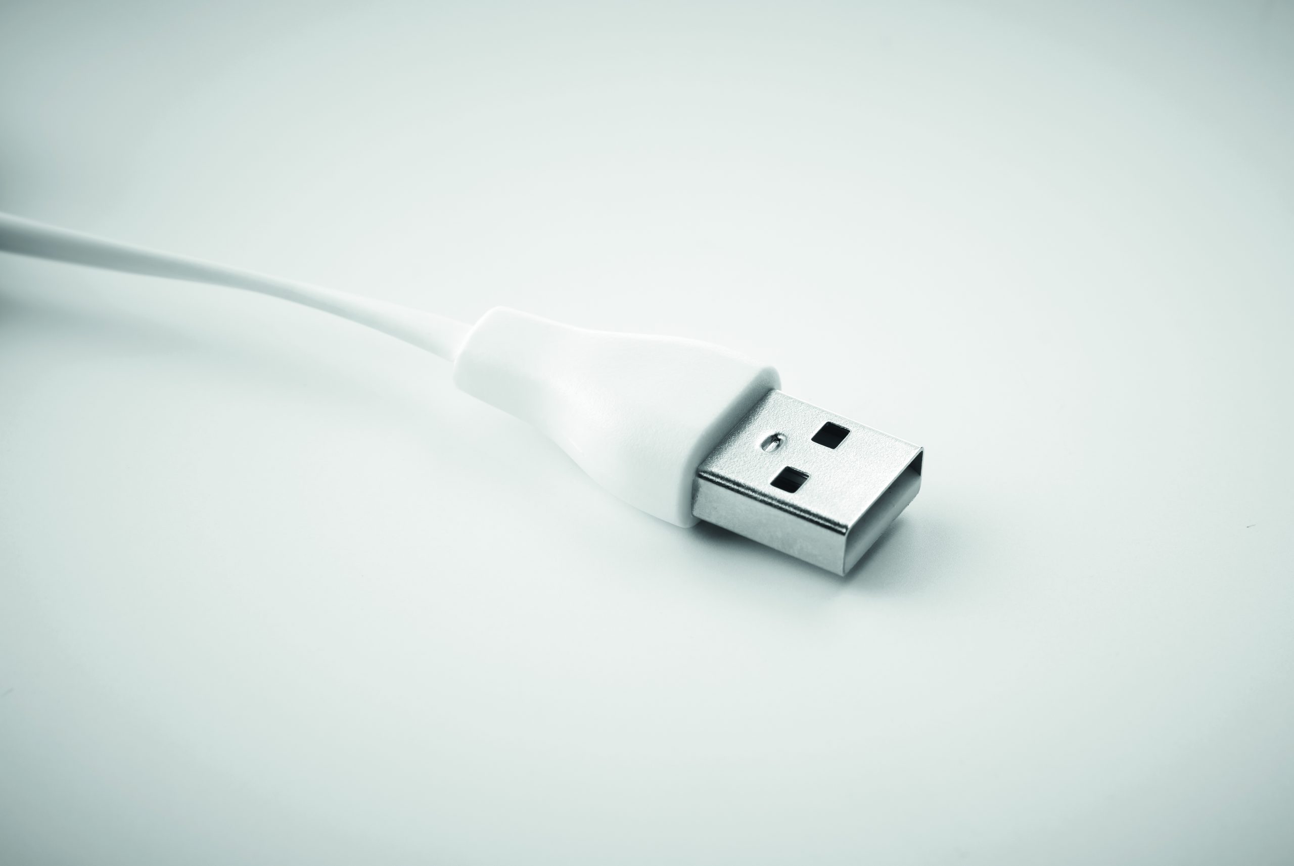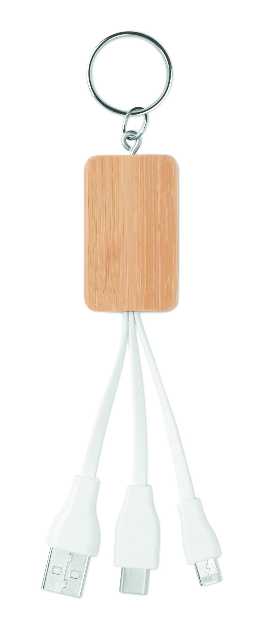 Brelok bambusowy z kablami do ładowania z USB-A na Micro-B (2 w 1) i typ C. Bambus jest produktem naturalnym, dlatego mogą wystąpić nieznaczne różnice w kolorze, wzorze i rozmiarze.