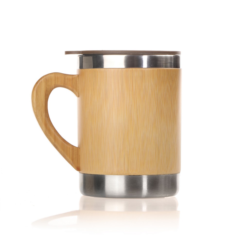 Kubek termiczny 300 ml z rączką, bambusowe elementy na zewnątrz, wnętrze ze stali nierdzewnej, plastikowe wieczko, utrzymuje temperaturę napojów gorących do 4 godzin