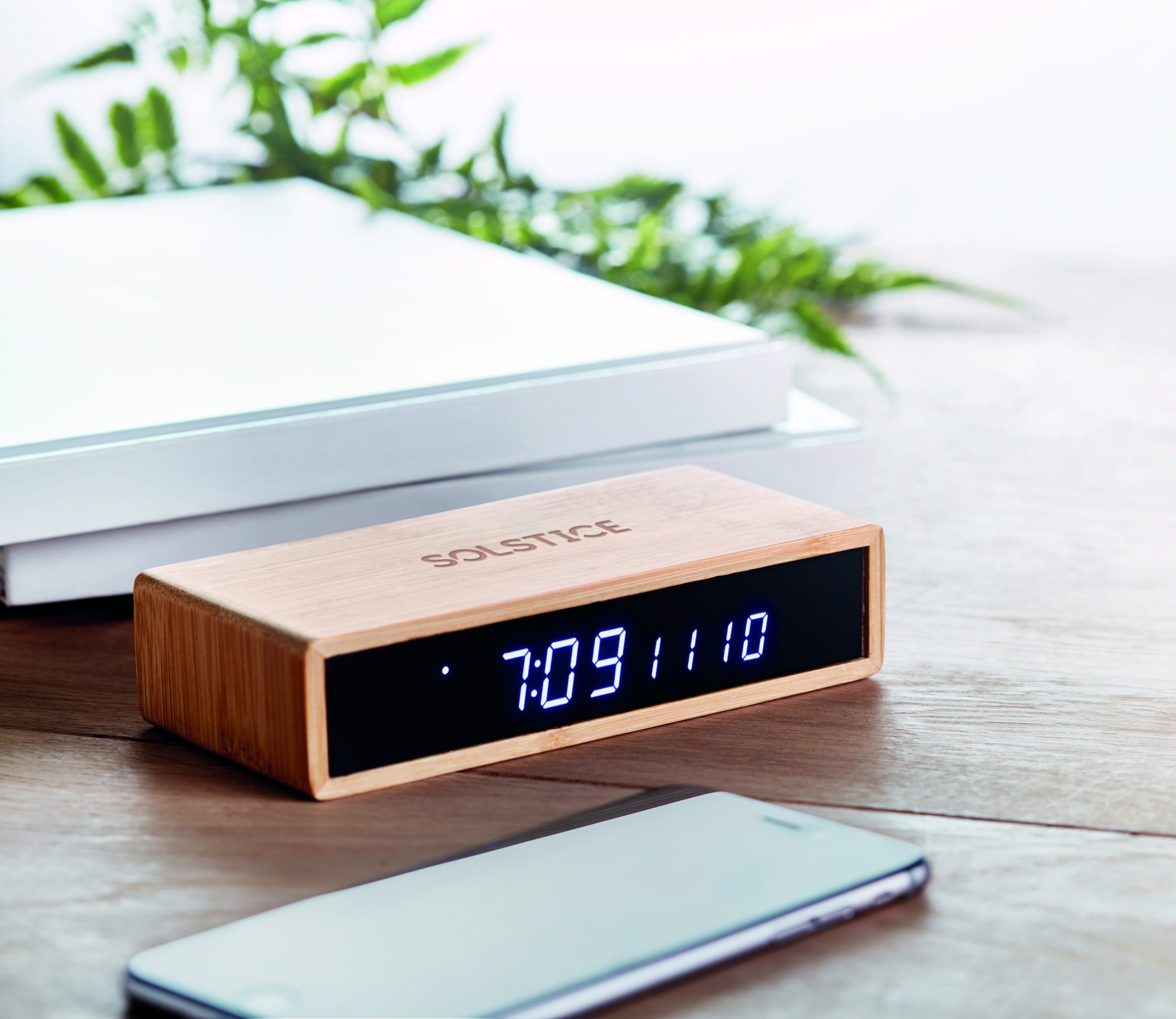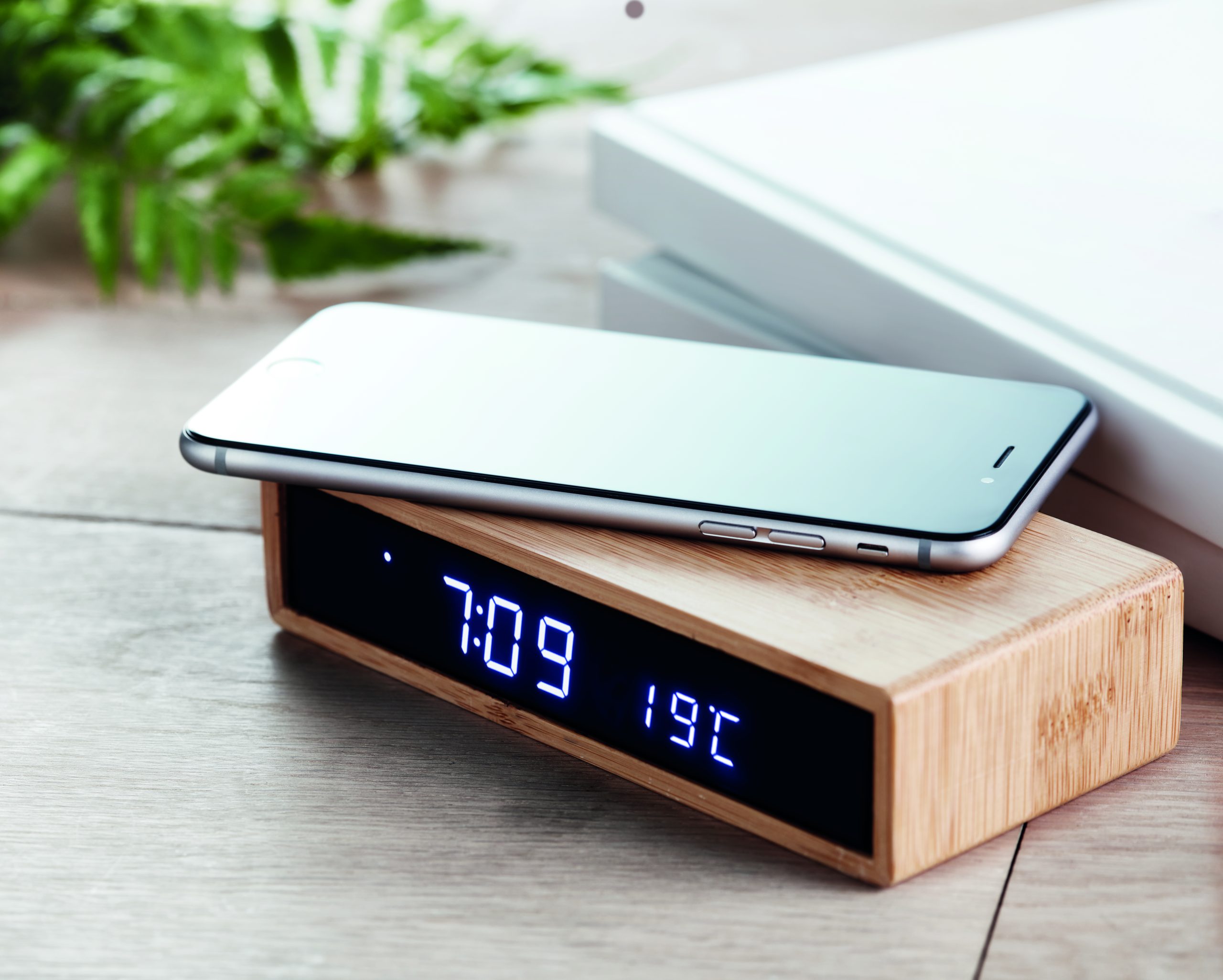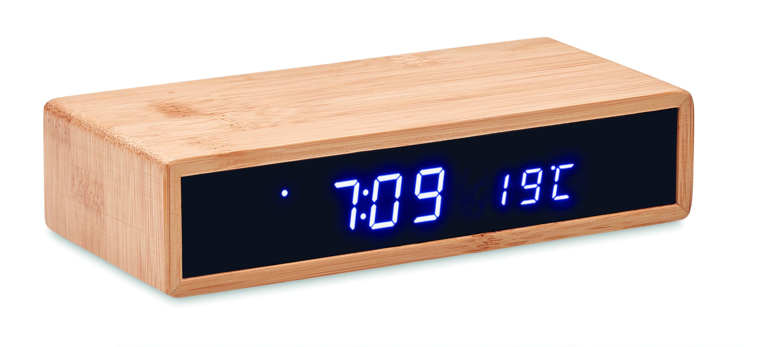 Bezprzewodowa ładowarka z niebieskim wyświetlaczem LED, budzikiem i funkcją termometru w bambusowej obudowie. W zestawie adapter AC-DC 2- pinowy . Wyjście bezprzewodowe: DC5V/1A (5W). Nie nadaje się do użytku w Wielkiej Brytanii. Bambus jest produkte