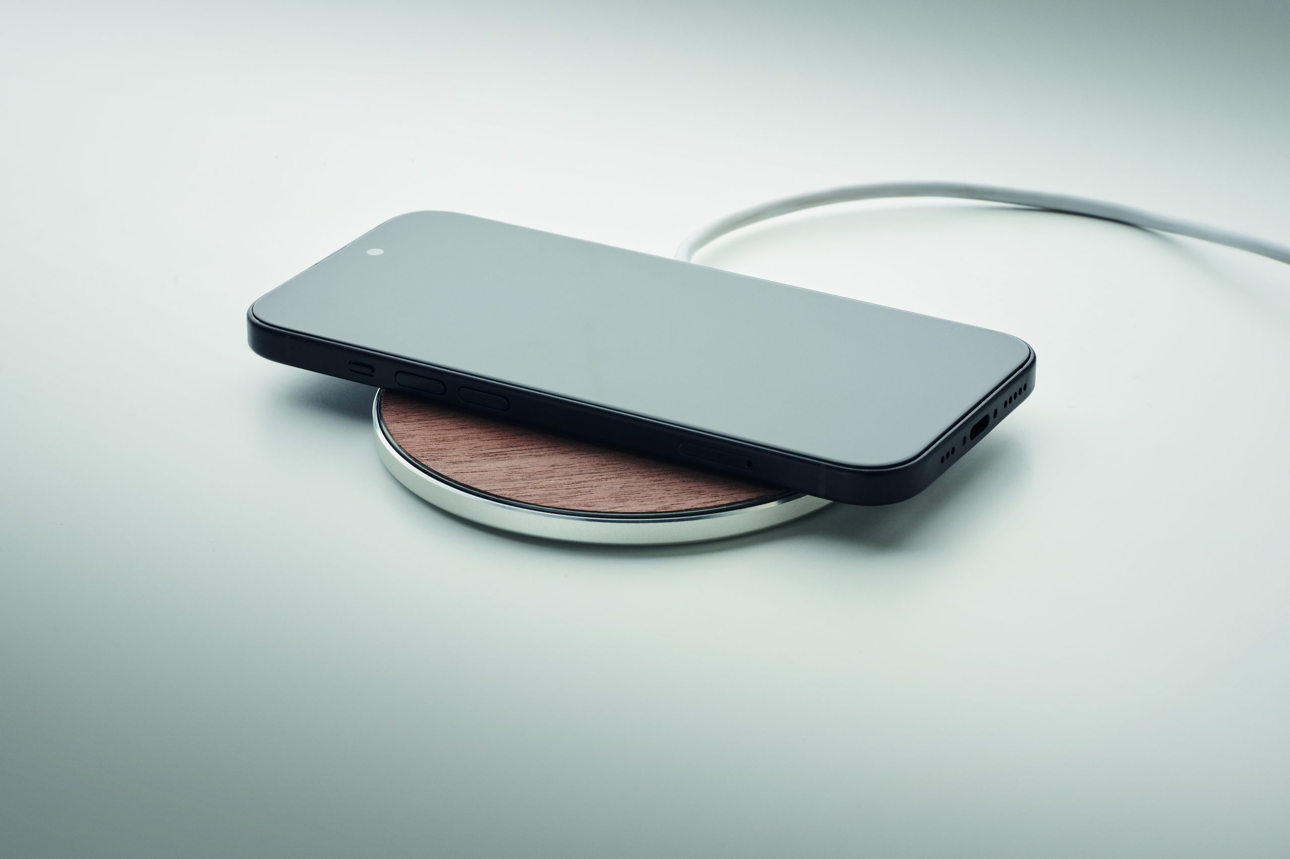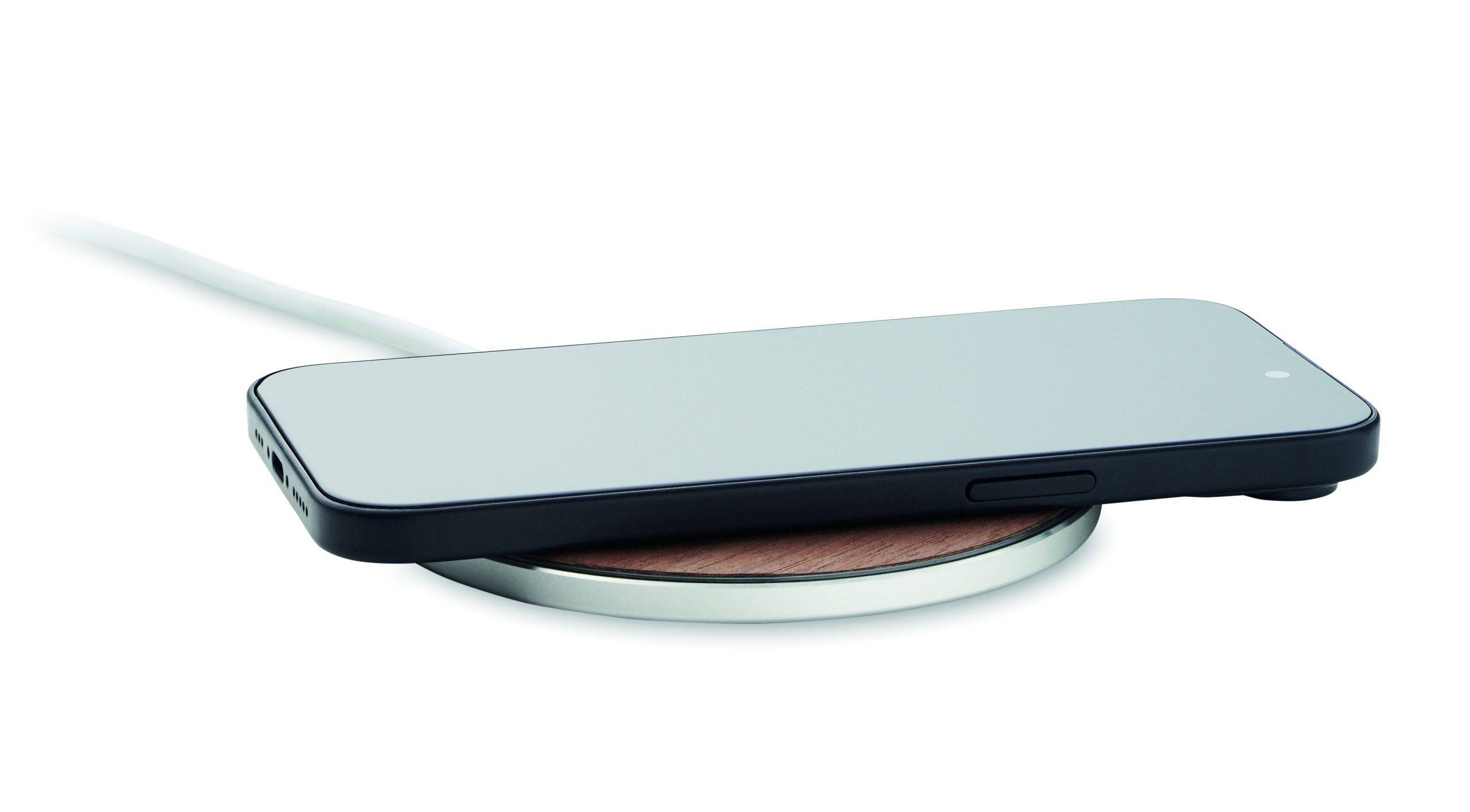 Bezprzewodowa ładowarka wykonana z aluminium pochodzącego z recyklingu z orzechowymi detalami. Podłącz urządzenie do komputera, umieść na nim smartfon i pozwól mu się naładować. Wyjście: DC 9V/1.67A (15W).