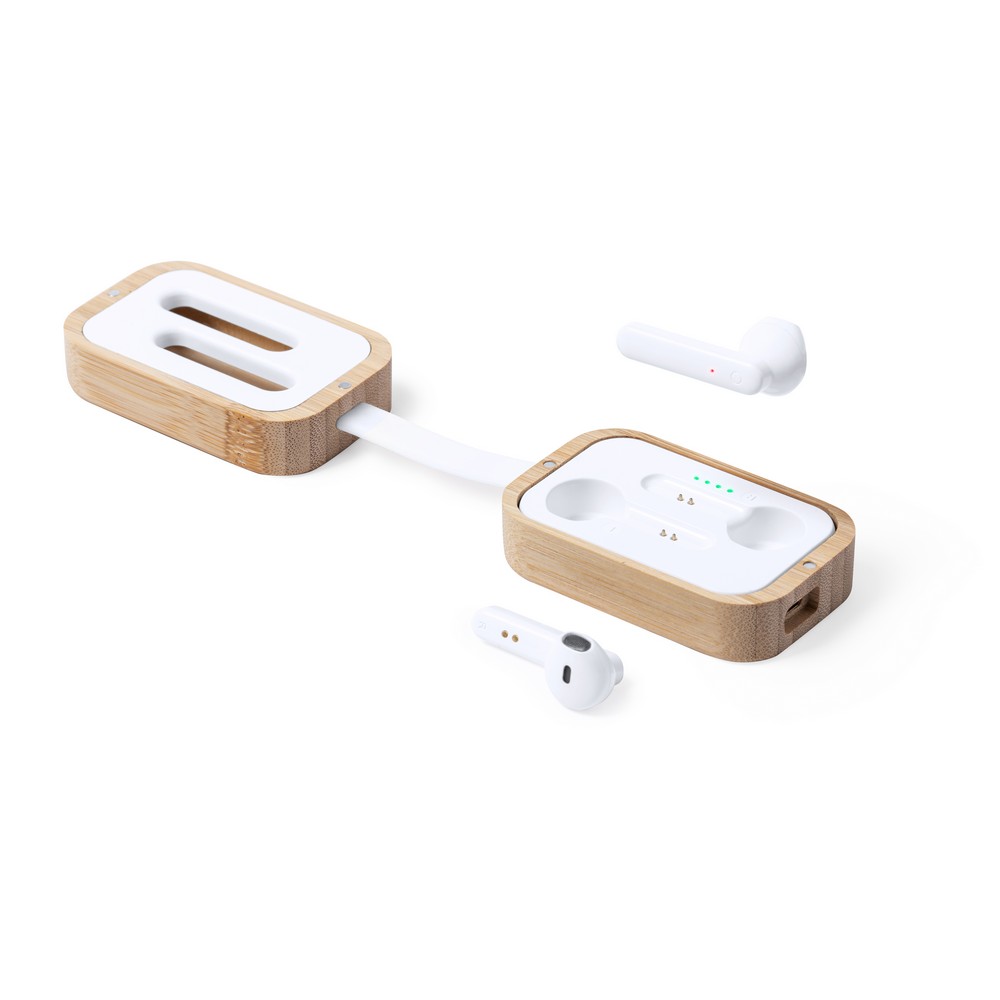 Słuchawki bezprzewodowe BT 5.0 w bambusowym magnetycznym etui ładującym, douszne, bateria stacji ładującej 400 mAh, bateria słuchawek 35 mAh, czas pracy: ok. 2.5h, funkcja odbierania połączeń, wbudowany mikrofon, zasięg do 10 m, ładowane przez USB, kabel micro USB w komplecie
