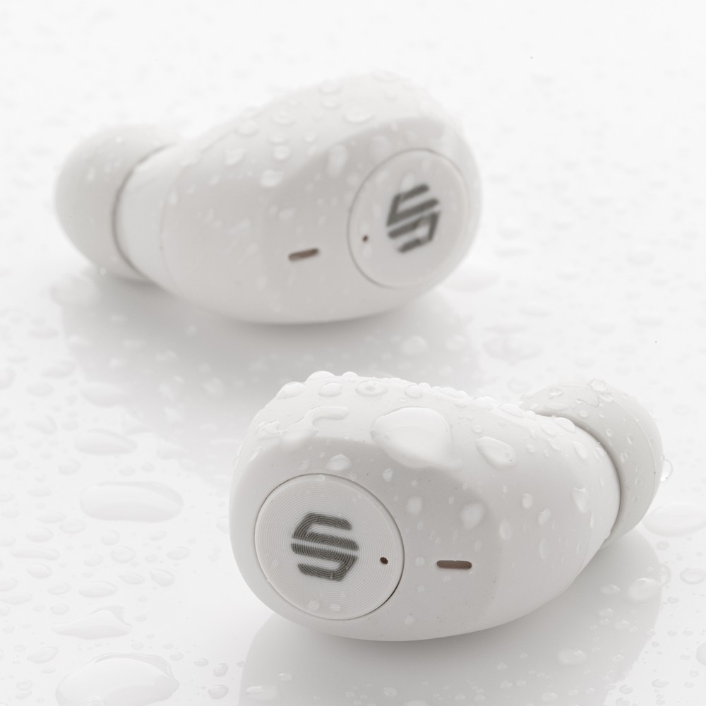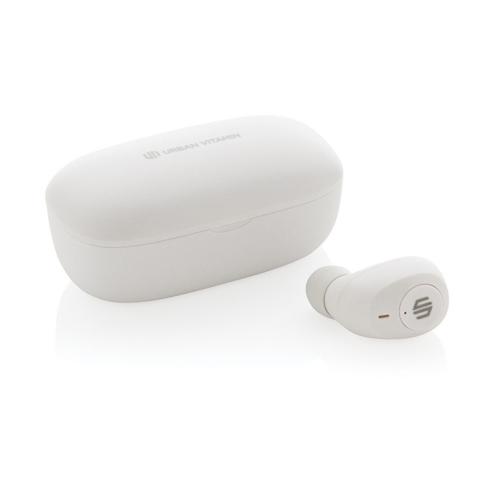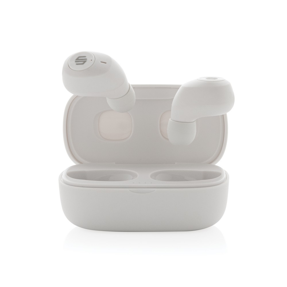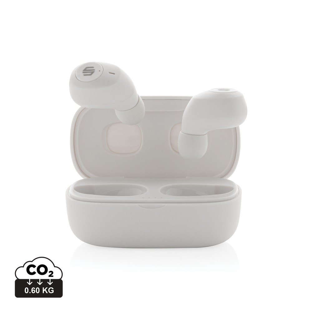 Bezprzewodowe słuchawki douszne, wykonane z ABS z recyklingu z certyfikatem RCS, całkowita zawartość materiałów z recyklingu obliczone na podstawie wagi całkowitej przedmiotu: 55%, funkcja redukcji szumów otoczenia podczas rozmów (ENC), wbudowane 2 mikrofony, funkcja odbierania połączeń, wodoodporne IPX4 (całkowita ochrona przed spryskiwaniem i zachlapaniem wodą z różnych kierunków z natężeniem do 10 litrów na minutę), dotykowy panel sterowania, do 6 godzin odtwarzania na jednym ładowaniu, etui ładujące zapewnia 20 godzin odtwarzania, nie zawiera PVC, opakowanie o zmniejszonej zawartości plastiku, ślad węglowy produktu: 0,66 kg CO2