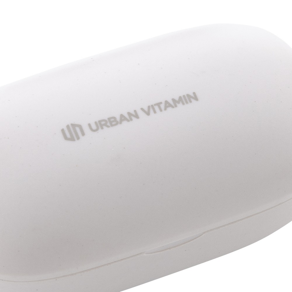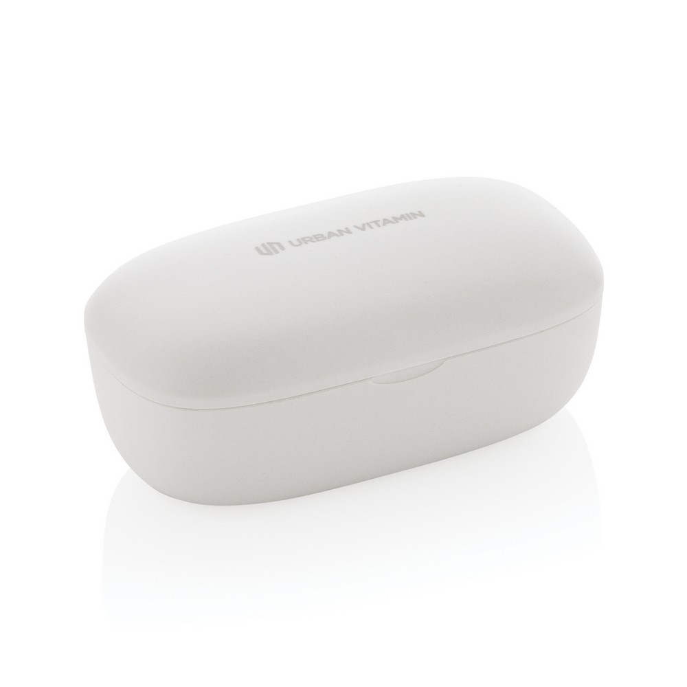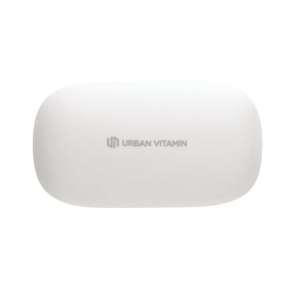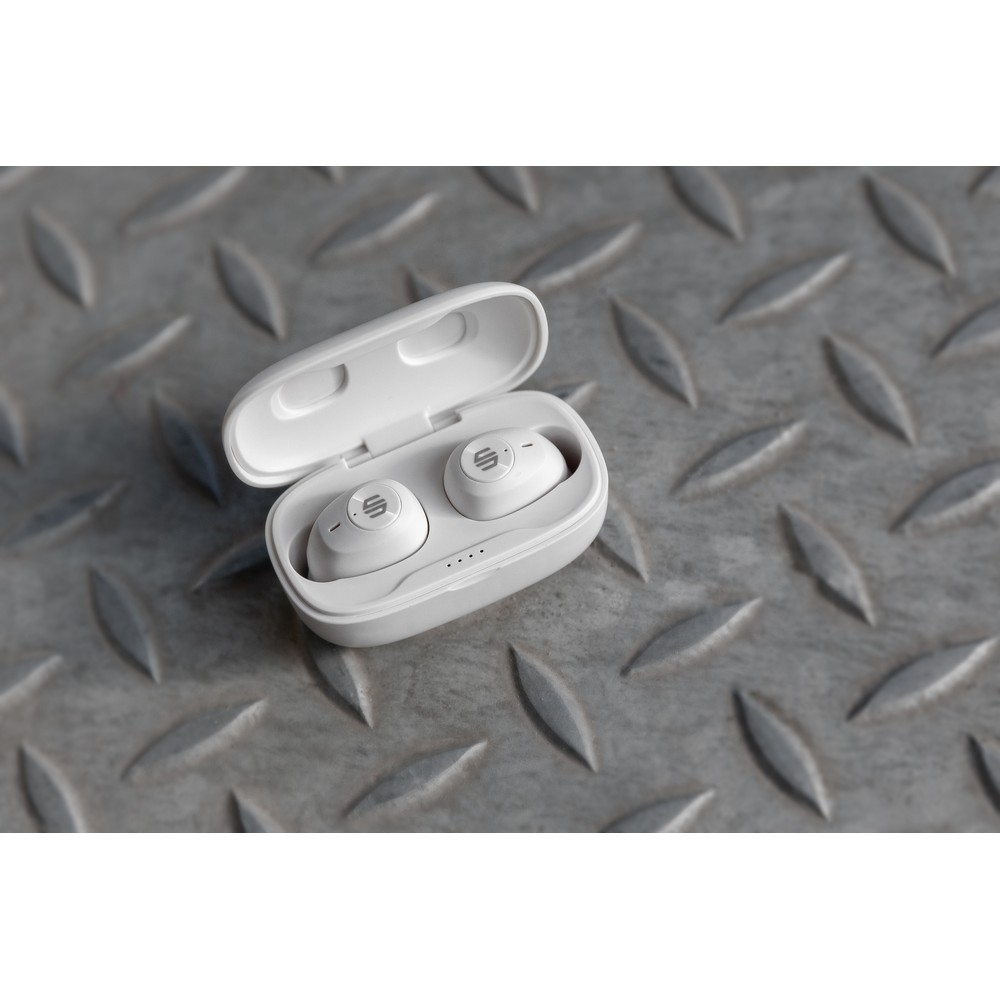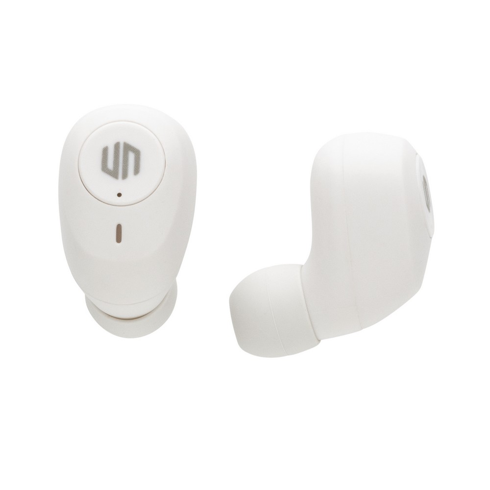 Bezprzewodowe słuchawki douszne, wykonane z ABS z recyklingu z certyfikatem RCS, całkowita zawartość materiałów z recyklingu obliczone na podstawie wagi całkowitej przedmiotu: 55%, funkcja redukcji szumów otoczenia podczas rozmów (ENC), wbudowane 2 mikrofony, funkcja odbierania połączeń, wodoodporne IPX4 (całkowita ochrona przed spryskiwaniem i zachlapaniem wodą z różnych kierunków z natężeniem do 10 litrów na minutę), dotykowy panel sterowania, do 6 godzin odtwarzania na jednym ładowaniu, etui ładujące zapewnia 20 godzin odtwarzania, nie zawiera PVC, opakowanie o zmniejszonej zawartości plastiku, ślad węglowy produktu: 0,66 kg CO2