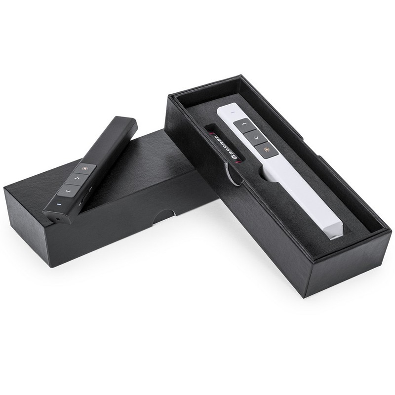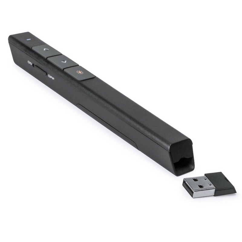 Bezprzewodowy wskaźnik laserowy 1 LED, posiada przyciski poprzedni/następny do przełączania slajdów prezentacji, odbiornik USB w komplecie, w pudełku podarunkowym