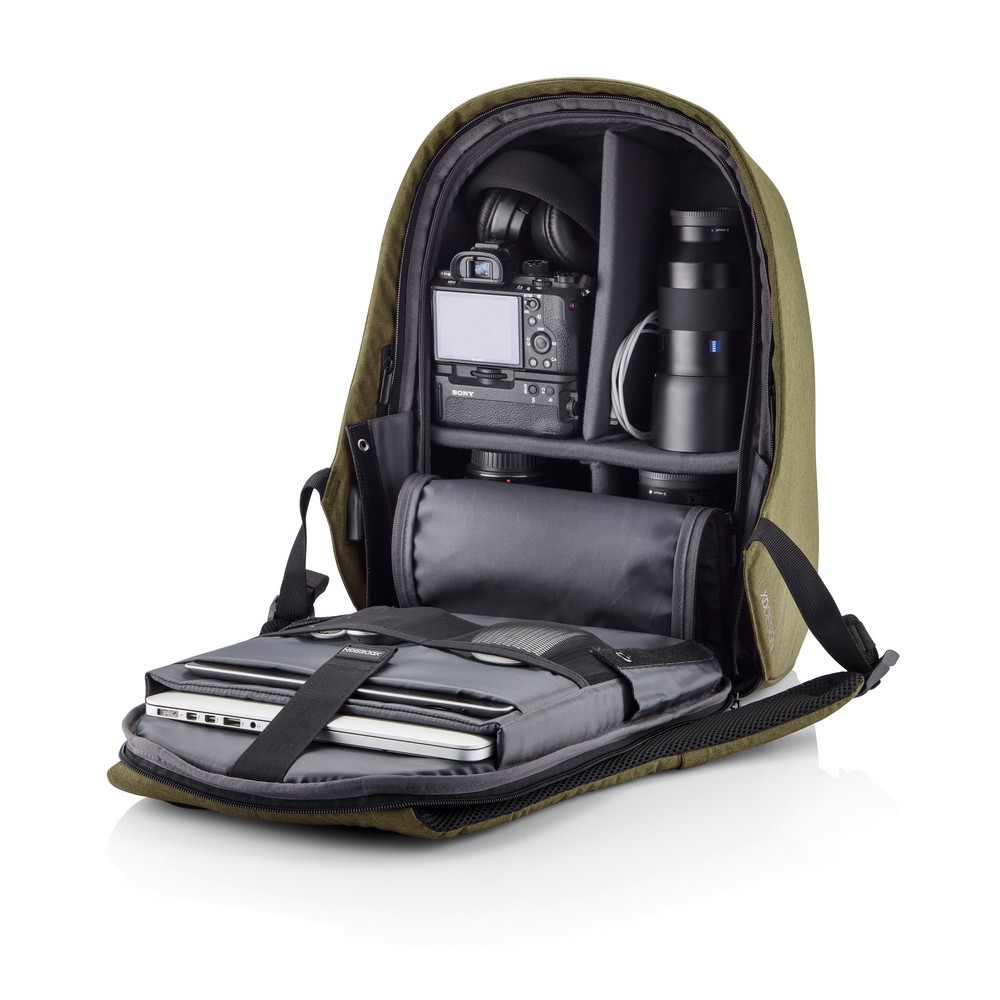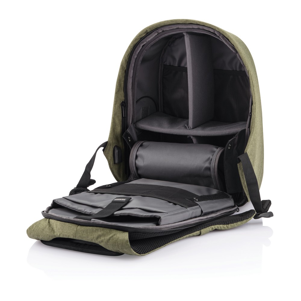 Plecak chroniący przed kieszonkowcami Bobby Hero Regular, wodoodporny i odporny na przecięcia materiał, wykonany z materiału RPET, ukryte zamki i kieszenie, wewnątrz miękkie przegrody na laptopa 15,6″ i tablet do 12,9″, zintegrowany port USB do ładowania telefonów (power-bank nie jest dołączony), odblaskowe paski zwiększające widoczność, pasek do zamocowania na walizce, wzór zastrzeżony®, ślad węglowy produktu: 6,68 kg CO2