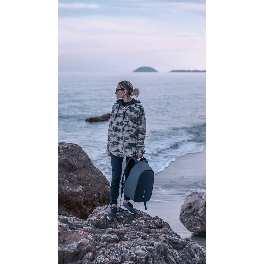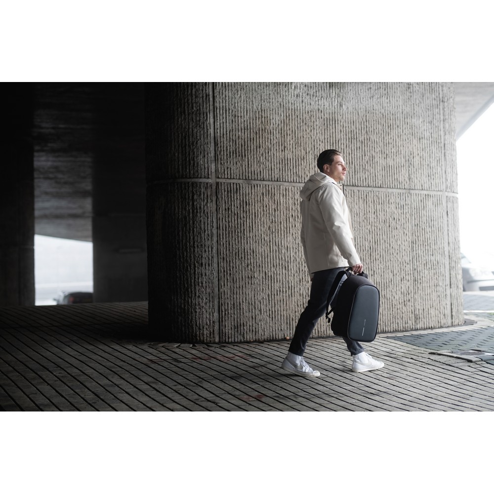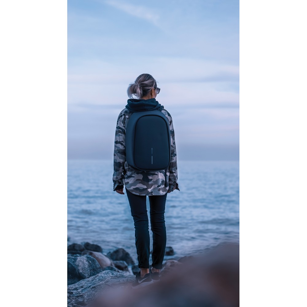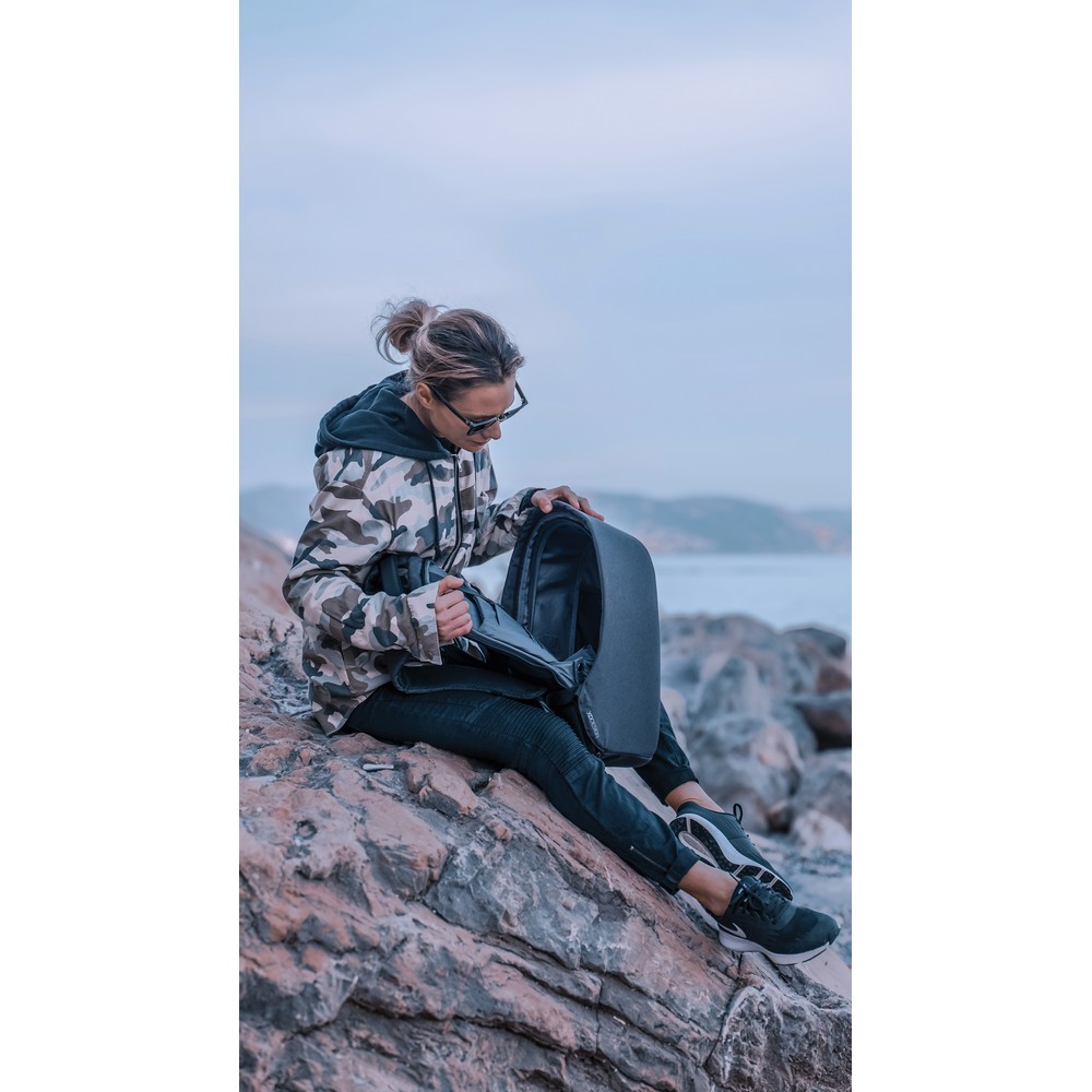 Plecak chroniący przed kieszonkowcami Bobby Hero Regular, wodoodporny i odporny na przecięcia materiał, wykonany z materiału RPET, ukryte zamki i kieszenie, wewnątrz miękkie przegrody na laptopa 15,6″ i tablet do 12,9″, zintegrowany port USB do ładowania telefonów (power-bank nie jest dołączony), odblaskowe paski zwiększające widoczność, pasek do zamocowania na walizce, wzór zastrzeżony®, ślad węglowy produktu: 6,68 kg CO2