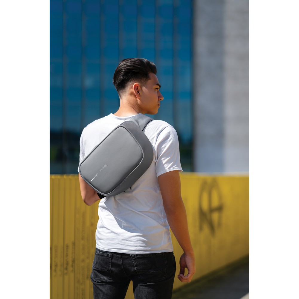 Plecak chroniący przed kieszonkowcami Bobby Sling z miękkim paskiem na ramię, wodoodporny i odporny na przecięcia materiał, 3 punktowa klamra bezpieczeństwa, zintegrowany port USB do ładowania telefonów (power-bank nie jest dołączony), kieszeń RFID, ukryte zamki i kieszenie, ślad węglowy produktu: 3,38 kg CO2