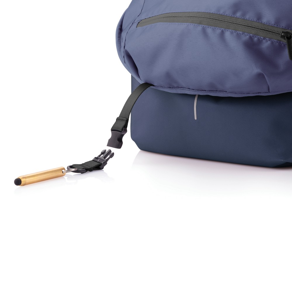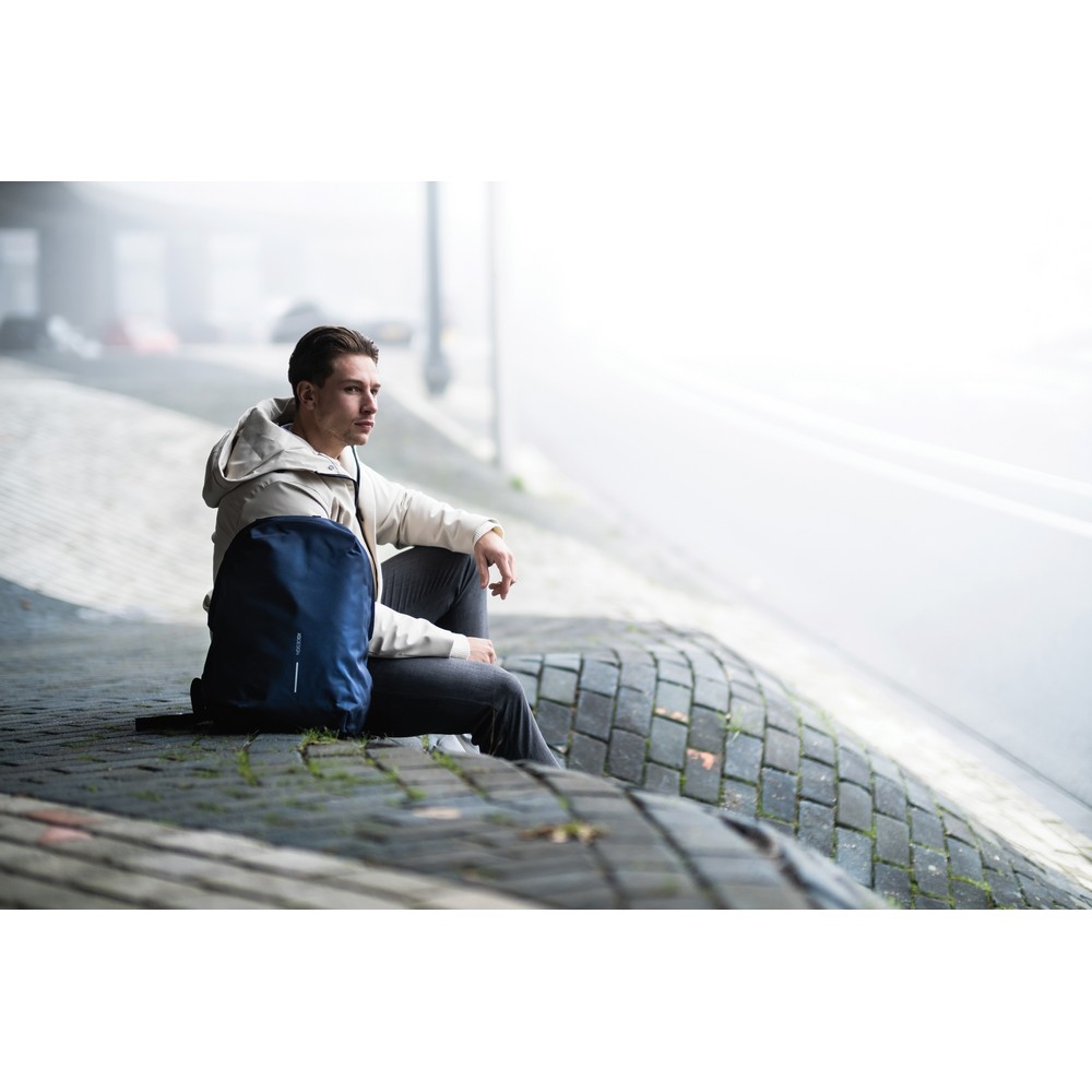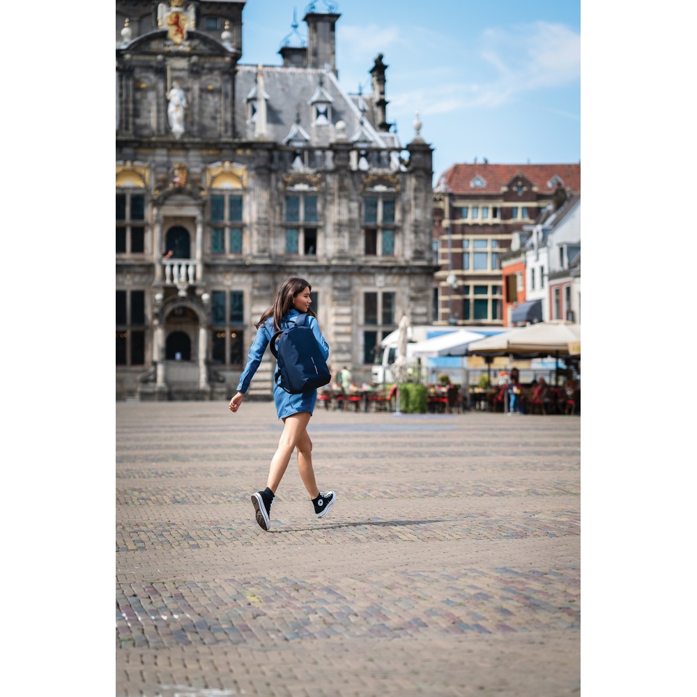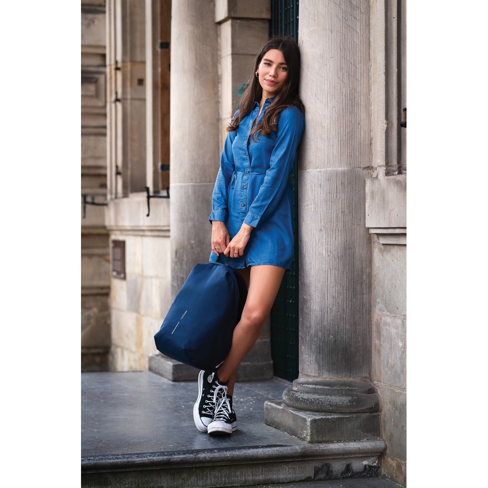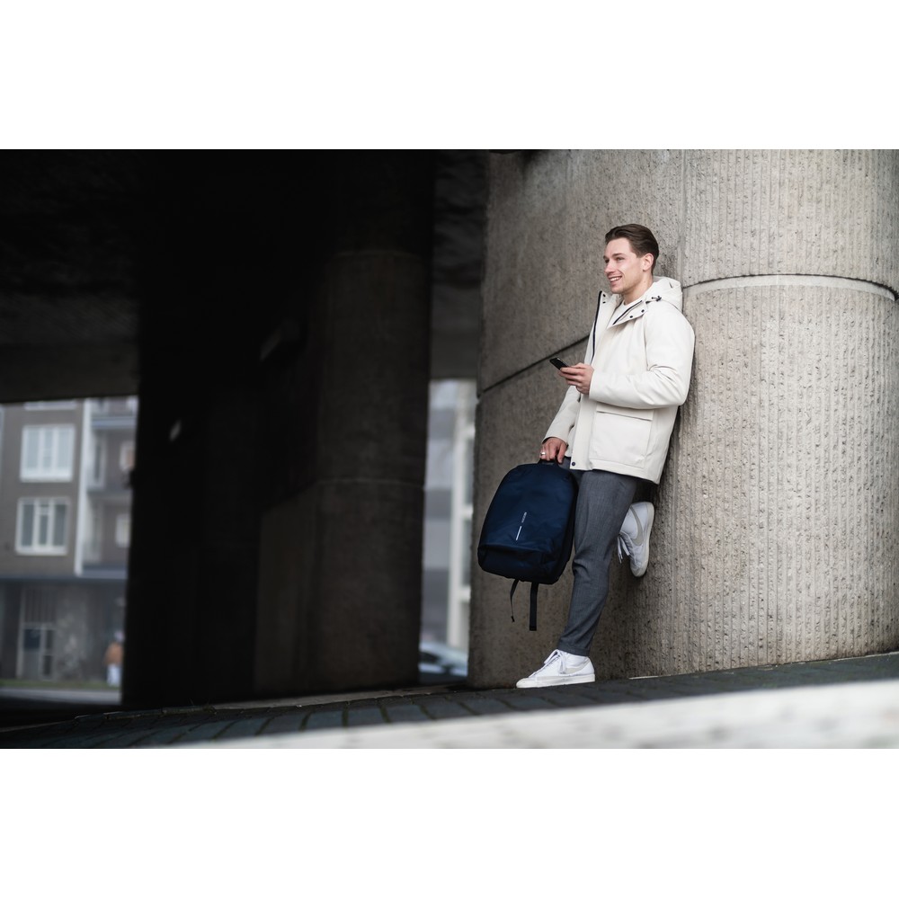 Plecak chroniący przed kieszonkowcami Bobby Soft, wodoodporny materiał, wykonany z przyjaznego środowisku materiału rPET, ukryte zamki i kieszenie, kieszenie z ochroną RFID, przestronna przegroda główna z kieszeniami wewnątrz i miękką przegrodą na laptopa do 15,6″, zintegrowany port USB do ładowania telefonów (power-bank nie jest dołączony), rozszerzalna górna część plecaka, ślad węglowy produktu: 5,1 kg CO2