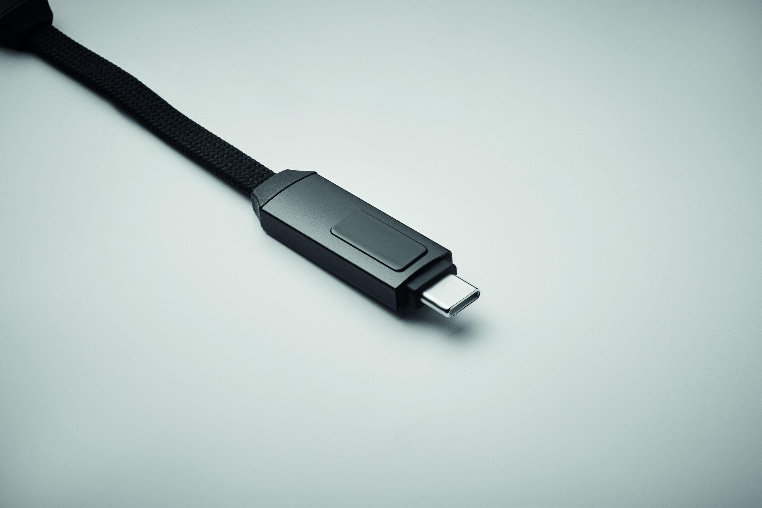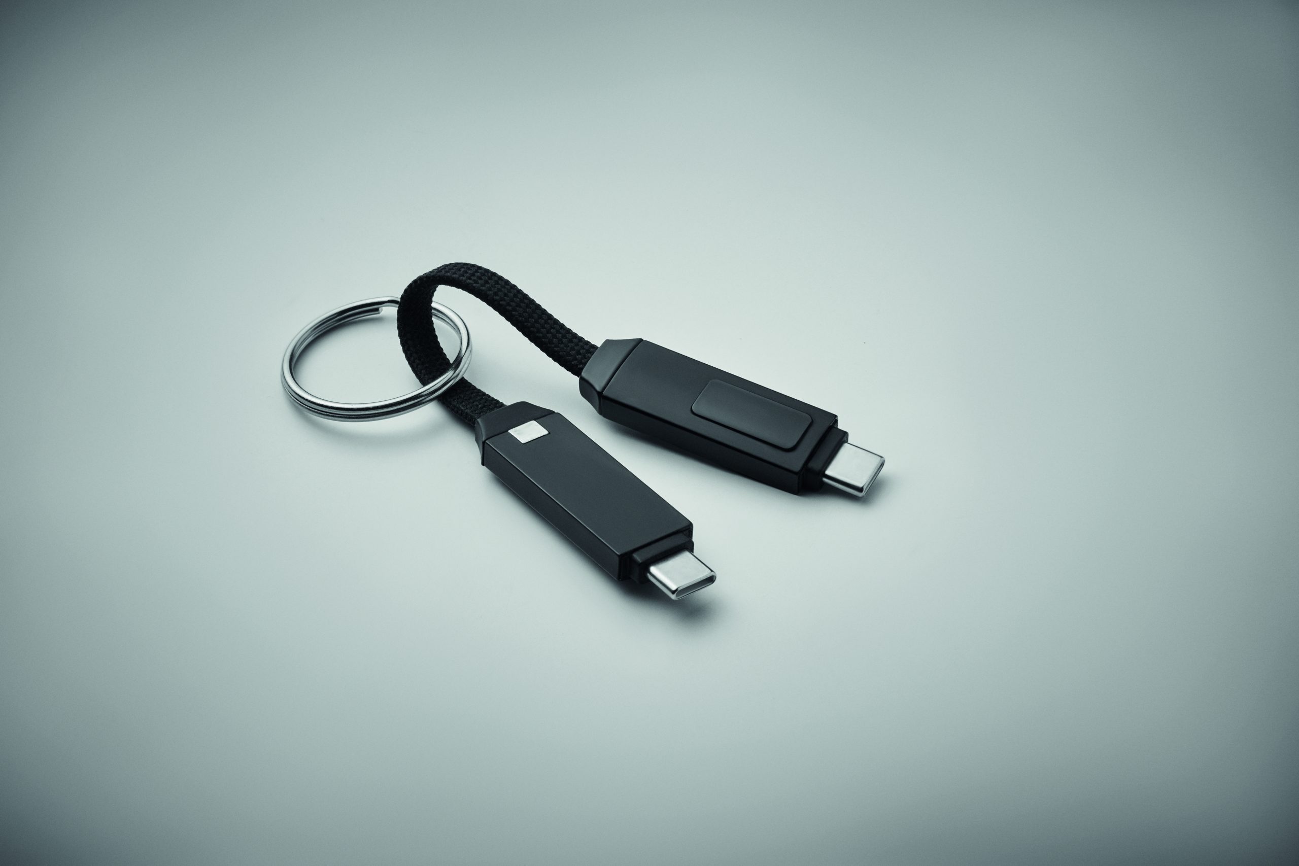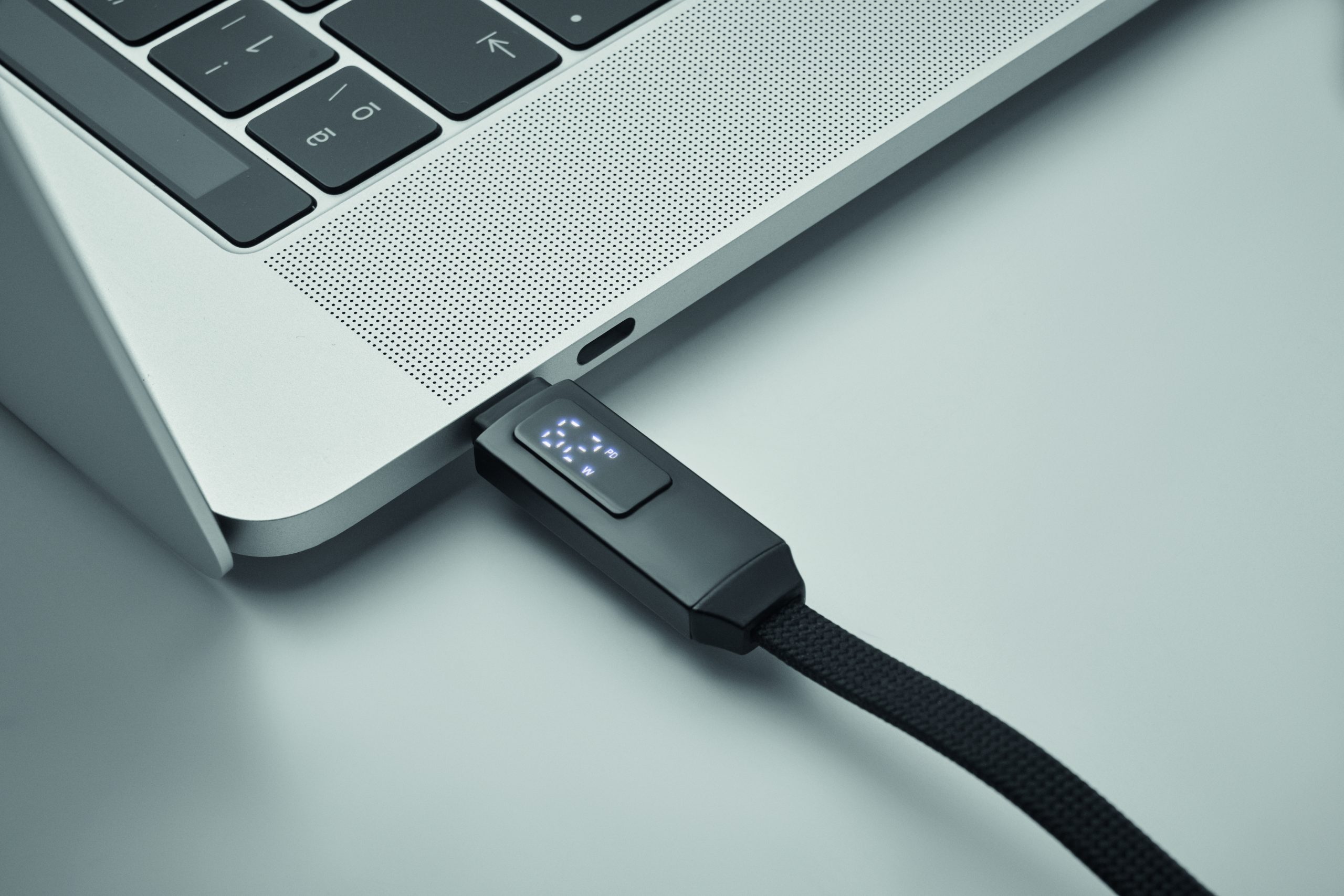 Brelok z kablem do ładowania i transmisji danych o mocy 60 W. Złącze typu C do typu C z ekranem LED z funkcją wyświetlania mocy ładowania. Zapięcie na magnes.