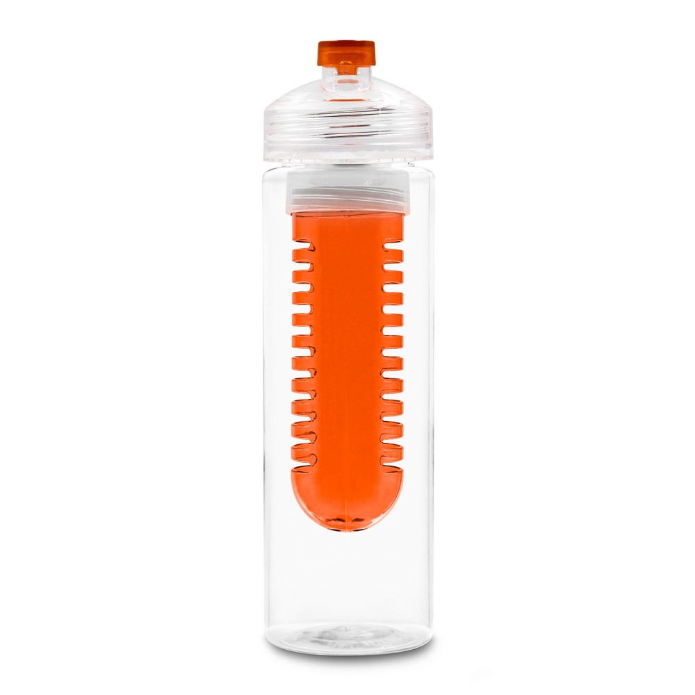 Butelka sportowa 650 ml, posiada pojemnik na lód lub owoce umożliwiający nadanie wodzie smaku według własnych preferencji, zakrętka z kolorowym zamknięciem, butelka przeznaczona wyłącznie do zimnych i niegazowanych napojów, produkt wykonany z plastiku
