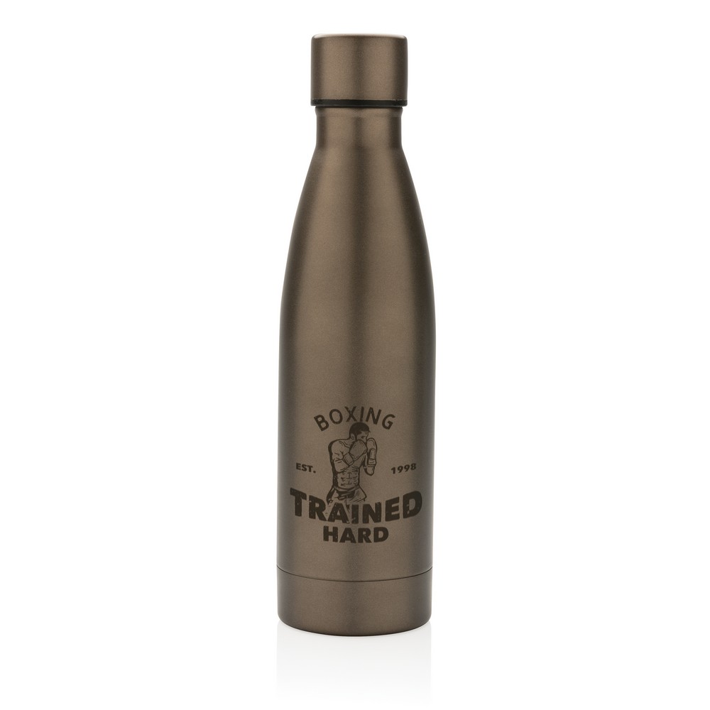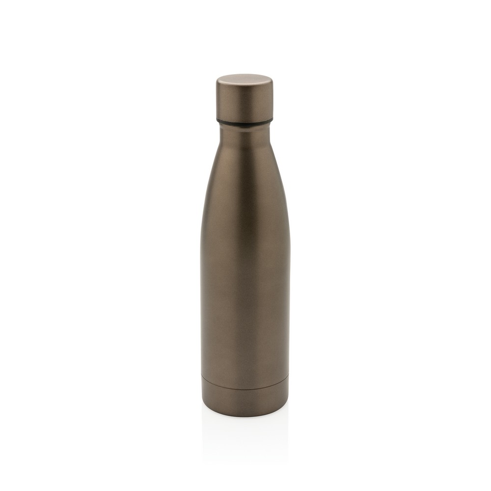 Butelka termiczna 500 ml, podwójne ścianki z próżnią pomiędzy, wykonana ze stali nierdzewnej z recyklingu z certyfikatem RCS (Recycled Claim Standard) który gwarantuje, że wykorzystane materiały pochodzą z recyklingu, całkowita zawartość materiału z recyklingu obliczona w oparciu o wagę całkowitą przedmiotu: 93%, pasuje do większości uchwytów samochodowych, w pudełku z papieru kraftowego z certyfikatem FSC® (Forest Stewardship Council), utrzymuje temperaturę napojów gorących do 20 godzin oraz zimnych do 15 godzin