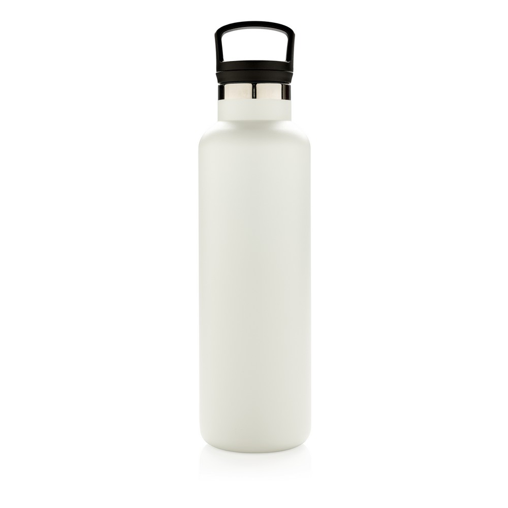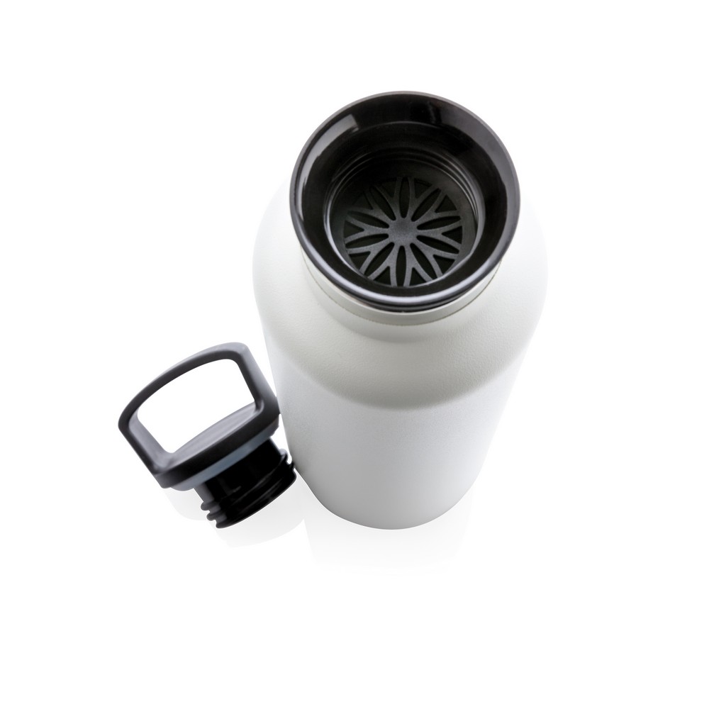 Butelka termiczna 600 ml, proszkowa powłoka, podwójne ścianki, zakrętka 2 w 1 z wyjmowanym sitkiem do zaparzania herbaty lub dodawania do wody owoców i ziół, ustnik do sączenia napojów i dodawania kostek lodu, wewnątrz stal nierdzewna 304, stal nierdzewna 201 na zewnątrz, utrzymuje temperaturę napojów gorących do 20 godzin oraz zimnych do 15 godzin