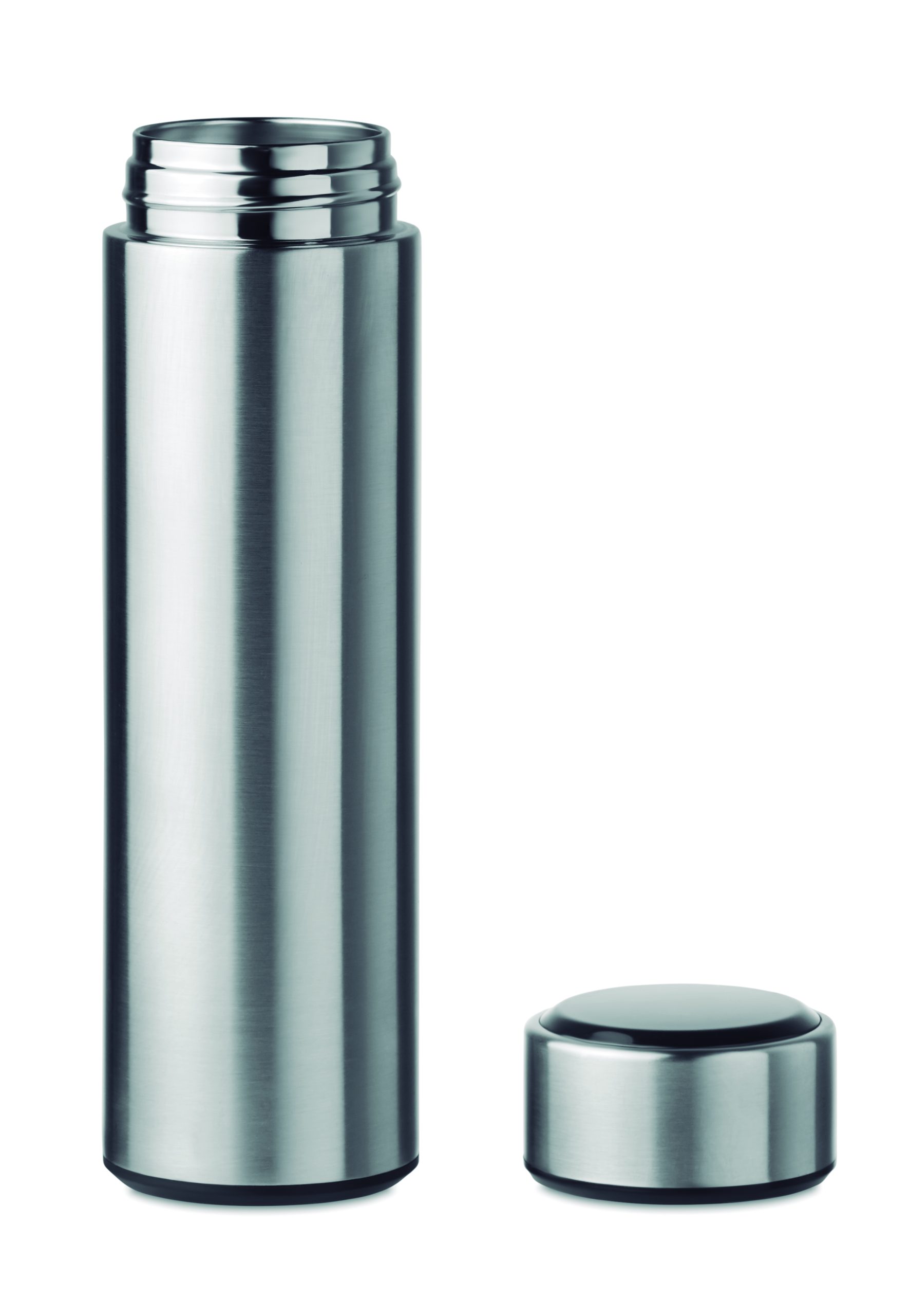 Butelka ze stali nierdzewnej, posiada podwójne ścianki z izolacyjną komorą próżniową. Wbudowany dotykowy termometr LED na pokrywie i zaparzacz do herbaty.Zawiera 1 wymienną bateria CR2032. Szczelna. Poj. 450 ml. Szczelna.