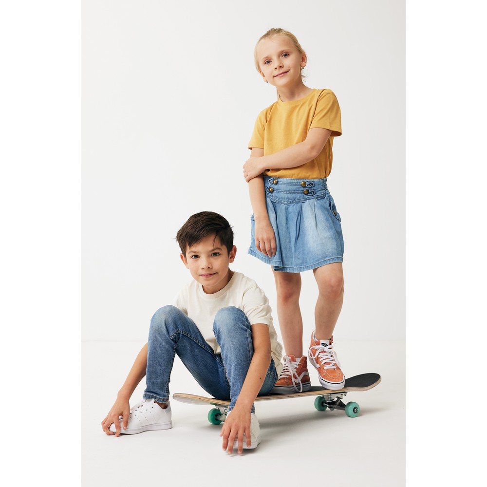 Koszulka dziecięca, regularny krój, okrągły dekolt, krótkie rękawy, wykonana w 30% z bawełny z recyklingu i w 70% z bawełny organicznej o gramaturze 160 g/m2, posiada wbudowany znacznik AWARE™, który potwierdza wykorzystanie materiałów z recyklingu, posiada kod QR na metce, który prowadzi do cyfrowego paszportu produktu, 2% wpływów z każdego sprzedanego produktu z kolekcji Impact jest przekazywane na rzecz Water.org, ślad węglowy produktu: 2,81 kg CO2