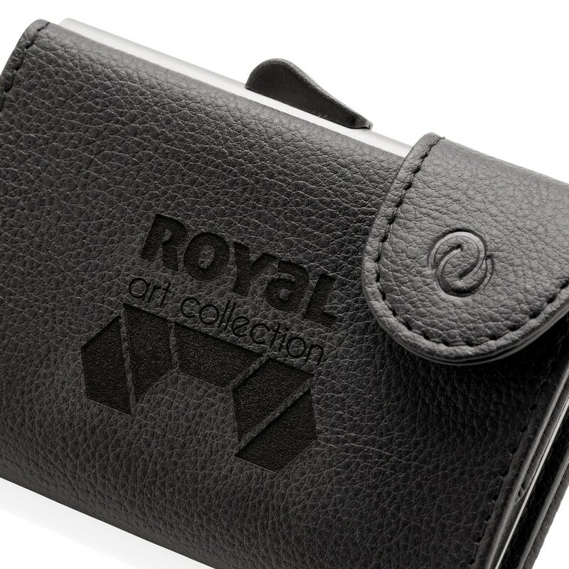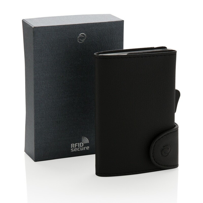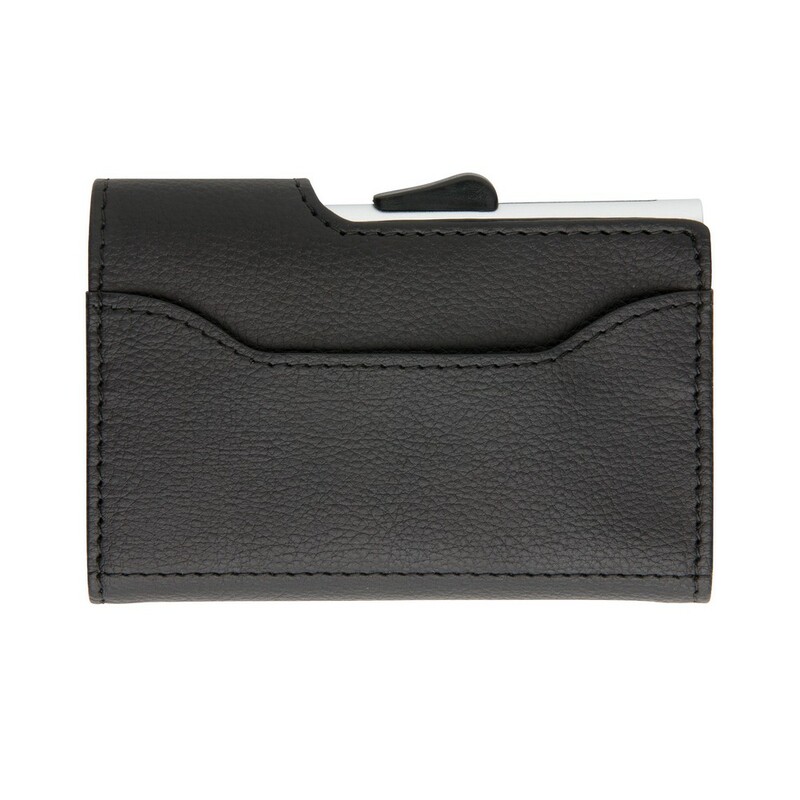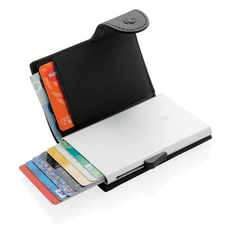 Portfel, etui na karty kredytowe z ochroną RFID, wykonany z wytrzymałego aluminium, mieści do 7 kart lub do 5 z tłoczeniem, posiada suwak boczny do wysuwania kart, miejsce na gotówkę w portfelu, ślad węglowy produktu: 0,82 kg CO2