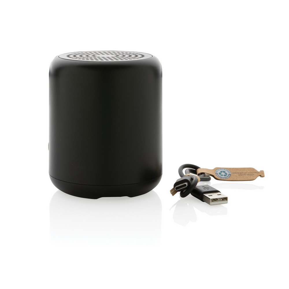 Głośnik bezprzewodowy 5W, BT 5.0, wykonany z ABS i PET pochodzącego z recyklingu z certyfikatem RCS (Recycled Claim Standard), całkowita zawartość materiałów z recyklingu obliczona na podstawie wagi całkowitej przedmiotu: 38%, akumulator o pojemności 300 mAh umożliwia odtwarzanie muzyki do 5 godzin, zasięg do 10m, wbudowany mikrofon, funkcja odbierania połączeń, w pudełku kraftowym z certyfikatem FSC® mix, kabel wykonany z TPE z recyklingu w komplecie, nie zawiera PVC, ślad węglowy produktu: 3,75 kg CO2