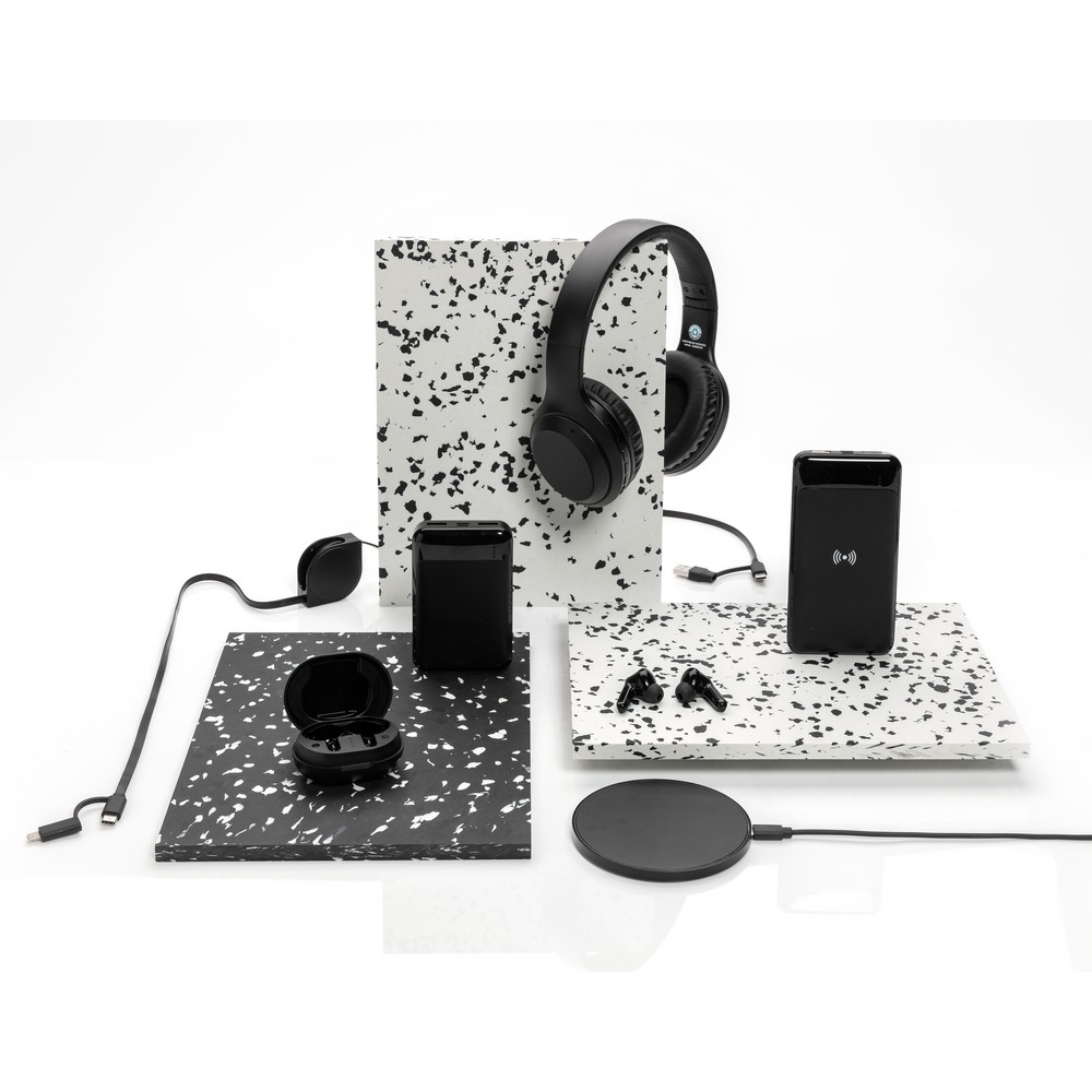 Zwijany kabel do ładowania z 4 końcówkami: USB, 2 x typu C i 2 w 1 (micro USB oraz kompatybilną z urządzeniami iOS), obudowa wykonana z ABS pochodzącego z recyklingu, posiadają certyfikat RCS (Recycled Claim Standard), który jest stosowany gdy produkt jest wykonany częściowo lub w całości z materiałów pochodzących z recyklingu, nie zawiera PVC, ślad węglowy produktu: 0,16 kg CO2
