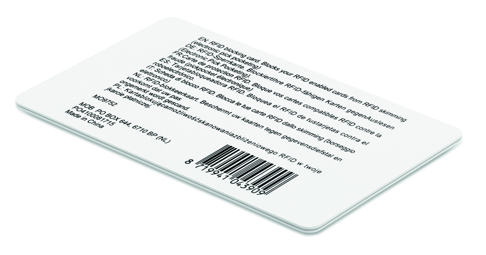 Karta blokująca RFID. Warstwa aluminium wewnątrz tej karty blokuje wszystkie częstotliwości radiowe przechodzące przez nią. Wszystkie inne karty za tą kartą blokującą będą chronione przed skanowaniem. (0,76 mm).