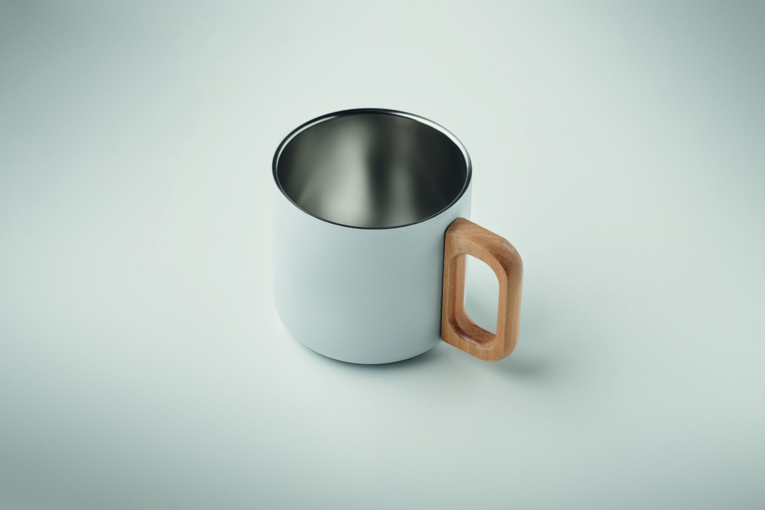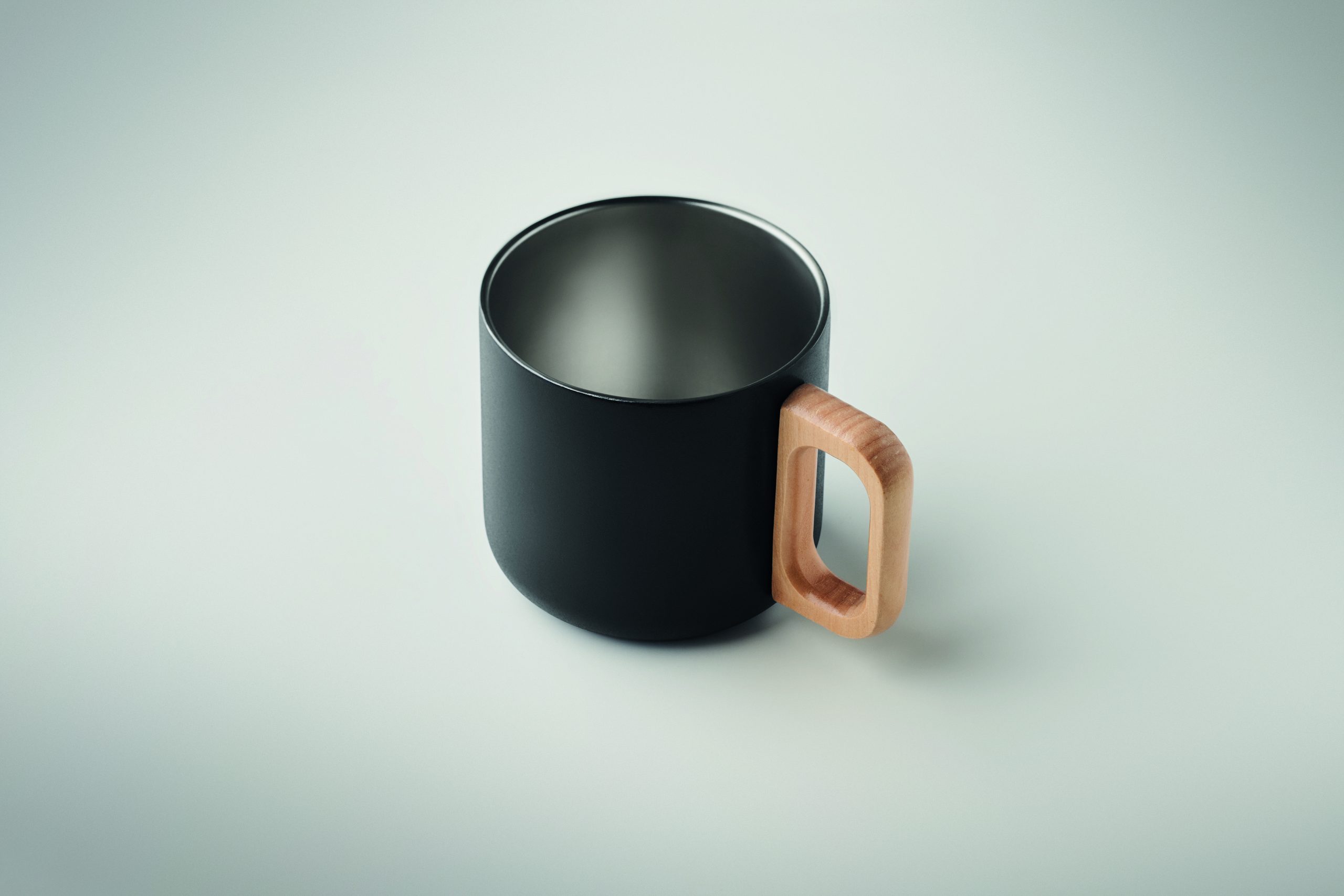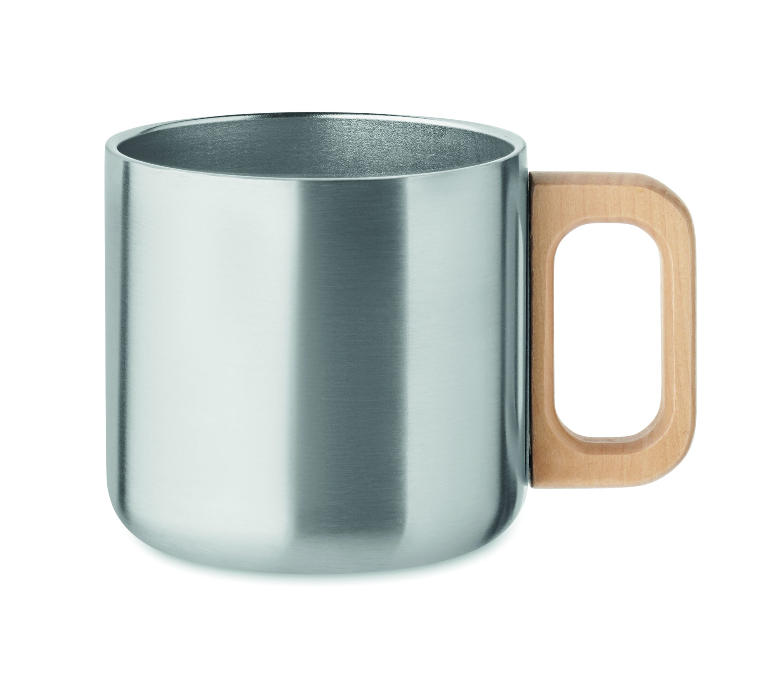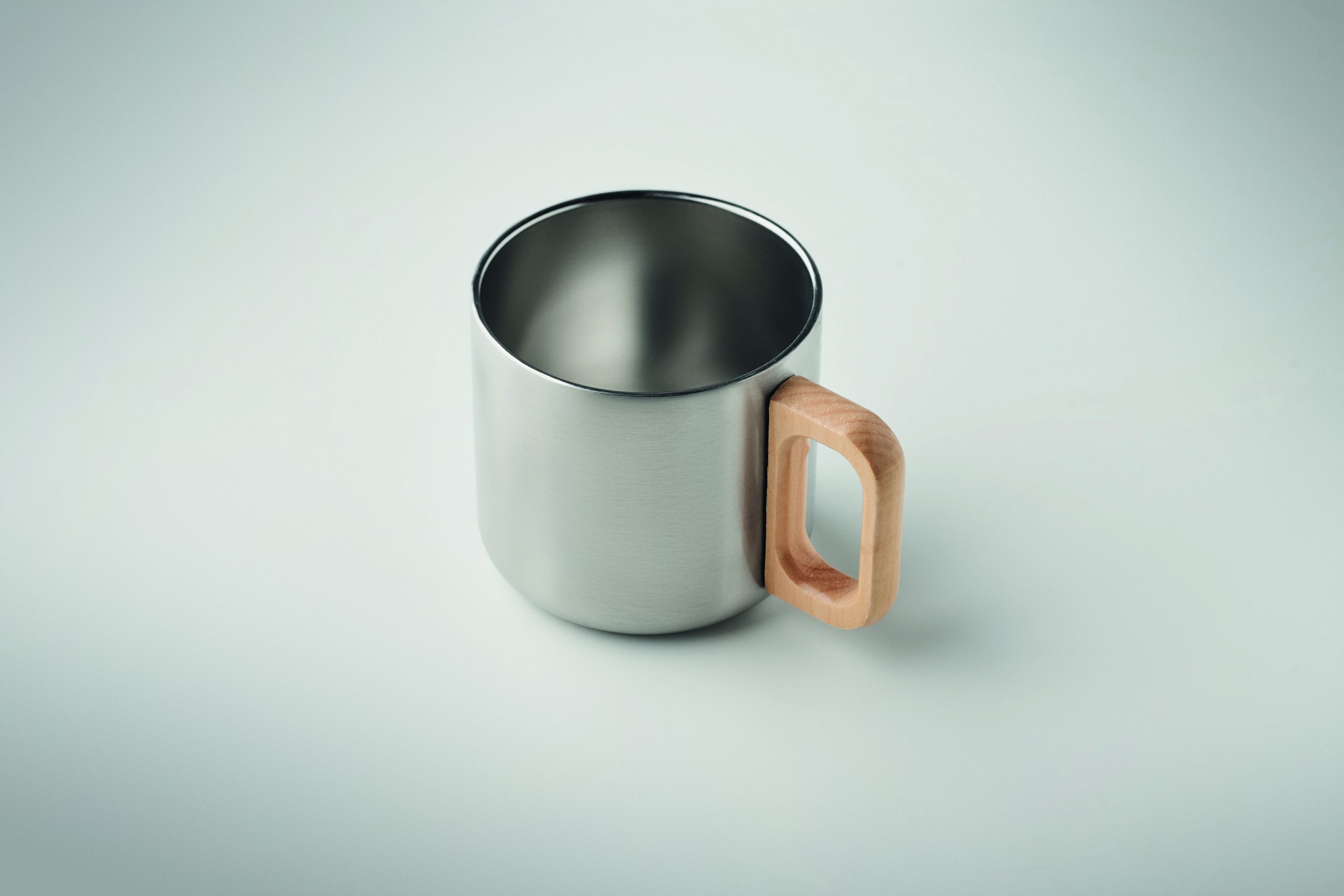 Kubek z podwójnymi ściankami z przetworzonej stali nierdzewnej (90% przetworzonej stali nierdzewnej i 10% stali nierdzewnej) z drewnianym uchwytem. Pojemność: 350 ml.