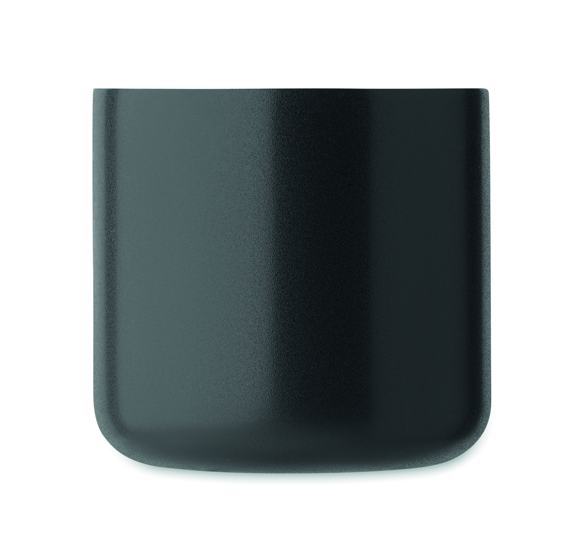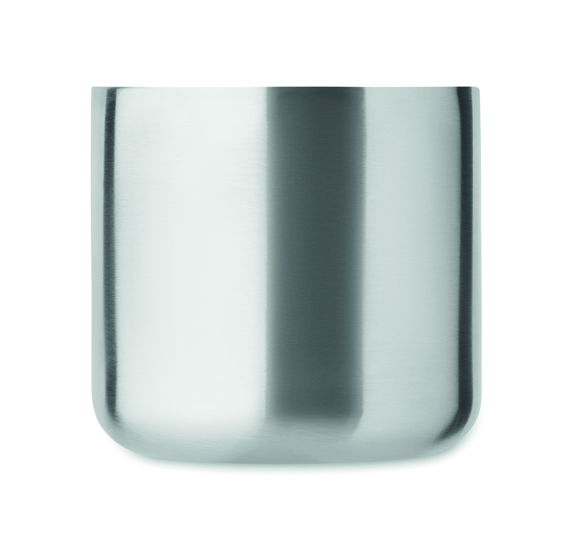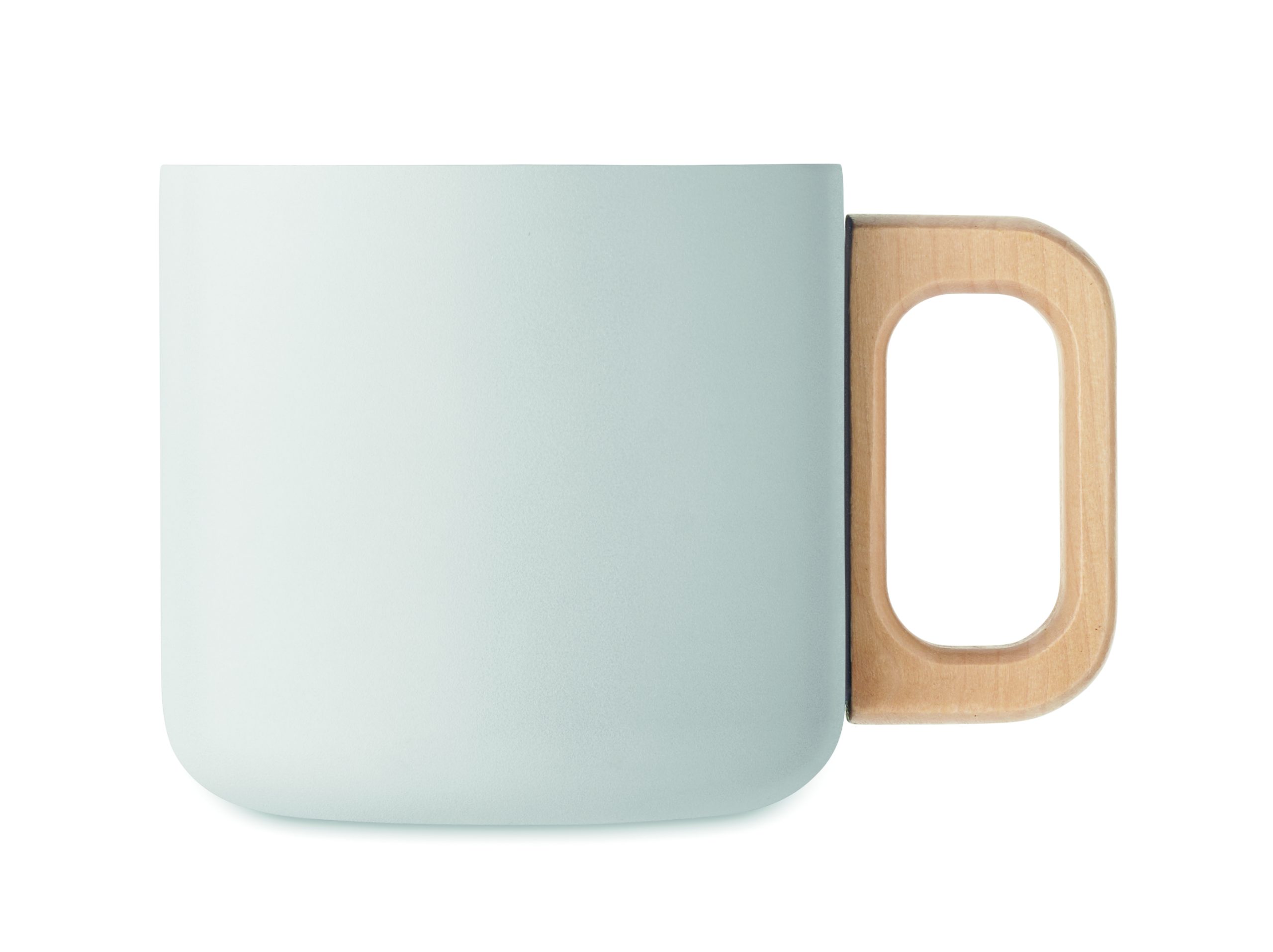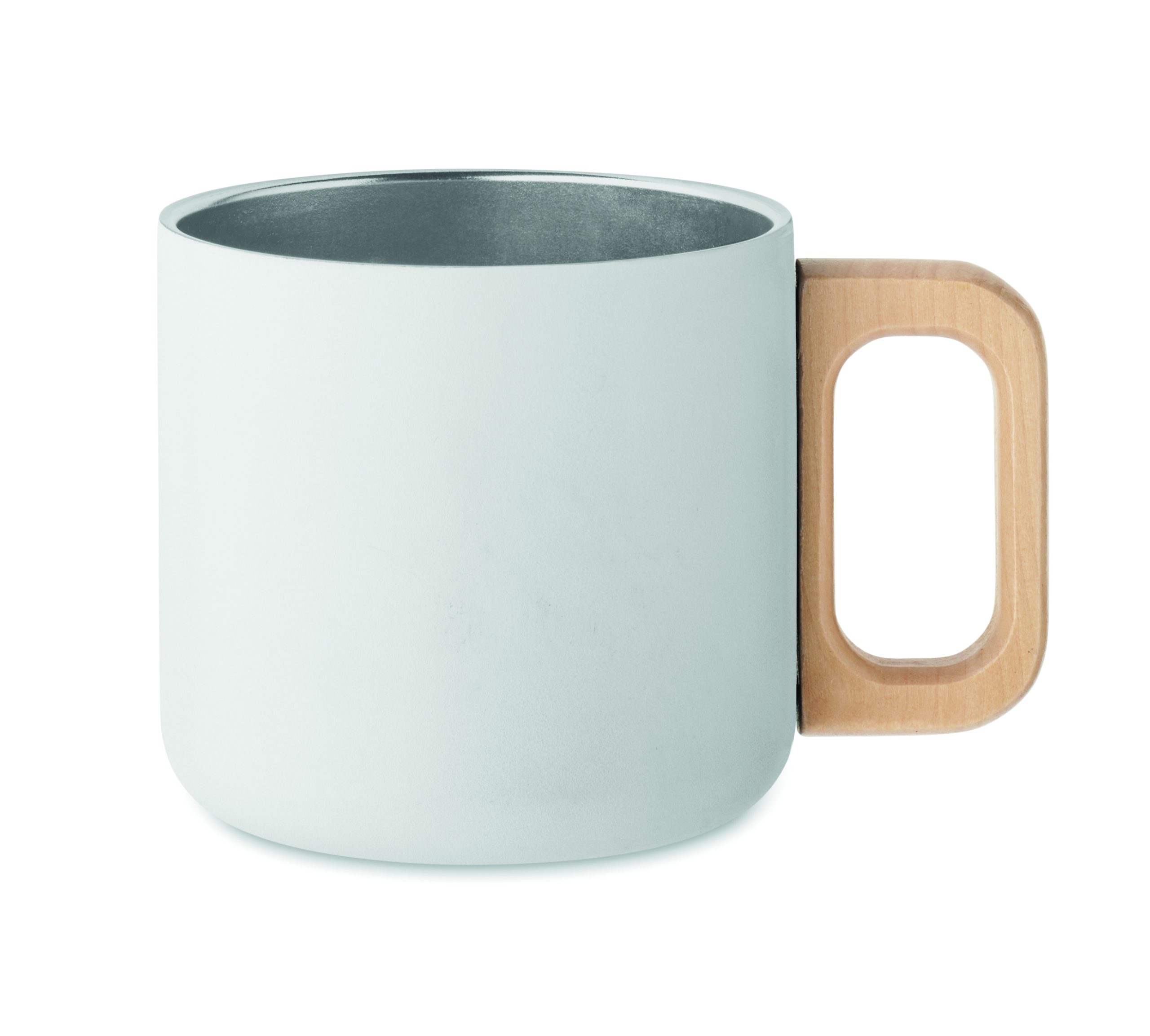 Kubek z podwójnymi ściankami z przetworzonej stali nierdzewnej (90% przetworzonej stali nierdzewnej i 10% stali nierdzewnej) z drewnianym uchwytem. Pojemność: 350 ml.
