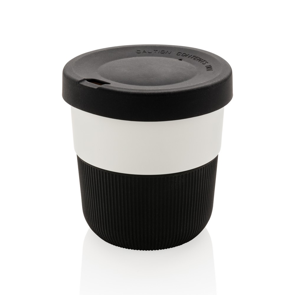 Kubek podróżny 250 ml, wykonany z PLA, silikonowe wieczko i uchwyt, pasuje do większości ekspresów do kawy, nie zawiera melaminy, ślad węglowy produktu: 0,63 kg CO2
