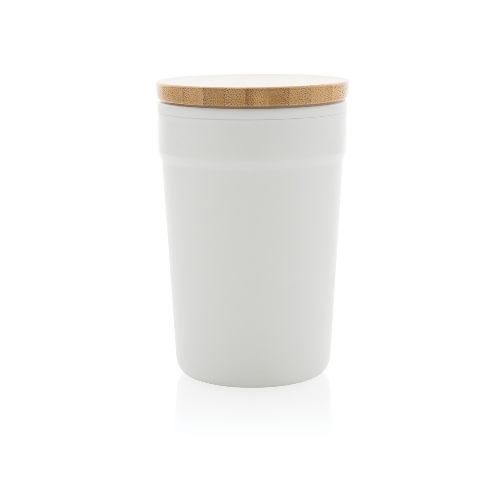 Kubek podróżny 300 ml, bambusowe wieczko, wykonany z PP z recyklingu z certyfikatem GRS, całkowita zawartość materiałów z recyklingu obliczona na podstawie wagi całkowitej przedmiotu: 52%, w ozdobnym pudełku z papieru kraftowego z certyfikatem FSC®, ślad węglowy produktu: 0,39 kg CO2
