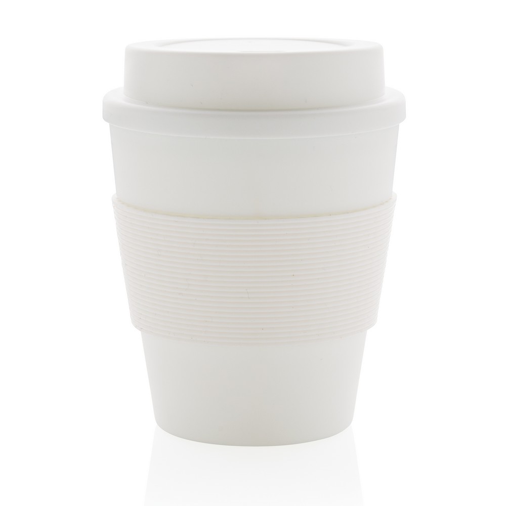 Kubek podróżny 350 ml, lekki, trwały i wielokrotnego użytku, wykonany z nadającego się w 100% do recyklingu materiału PP, silikonowy uchwyt, zakręcane wieczko, odporny na temperaturę do 100 stopni Celsjusza, kubek można myć w zmywarce i używać w kuchence mikrofalowej, ślad węglowy produktu: 0,34 kg CO2
