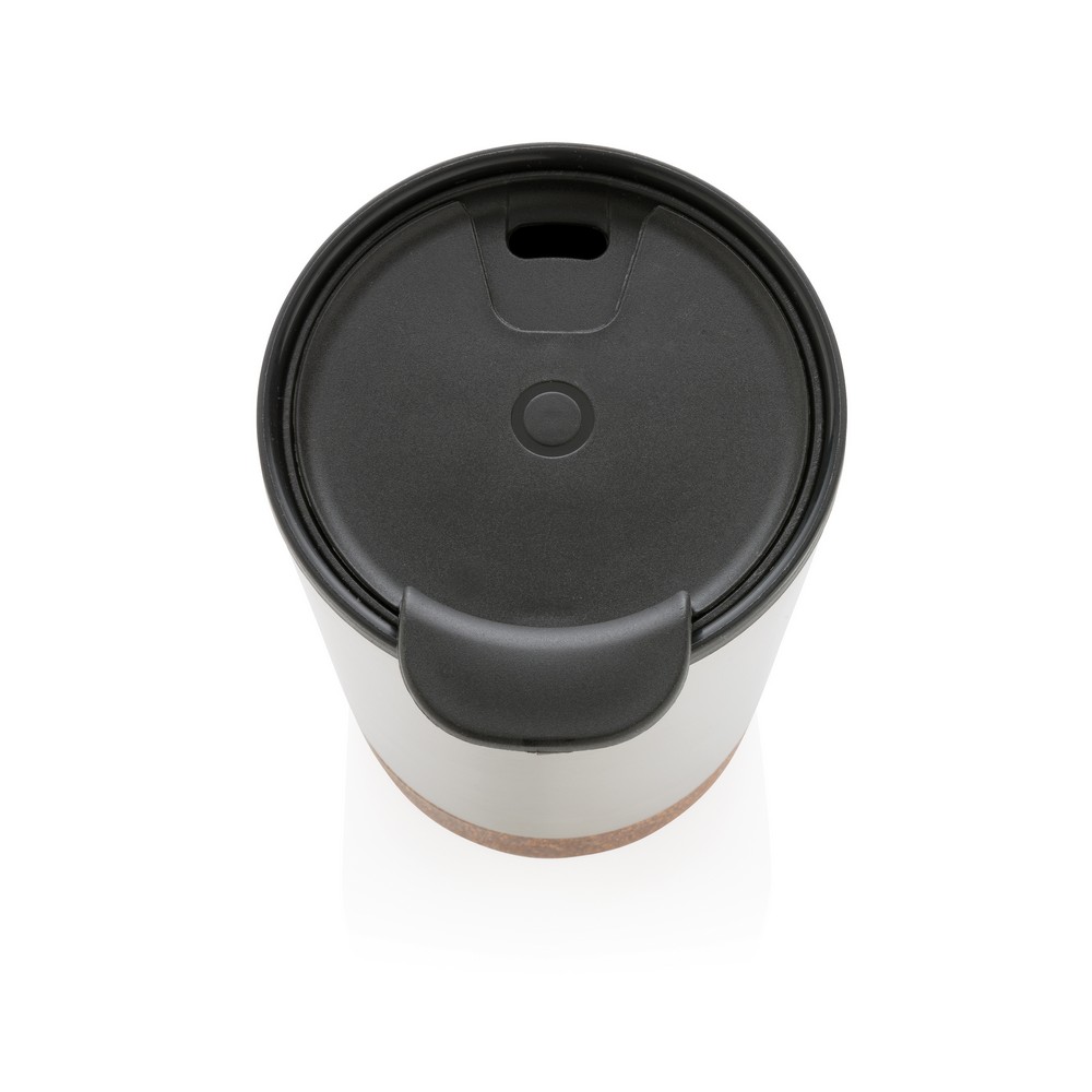 Kubek termiczny 300 ml, podwójne ścianki, wnętrze z PP z recyklingu z certyfikatem GRS, całkowita zawartość materiałów z recyklingu obliczona na podstawie wagi całkowitej produktu: 52%, korkowe elementy na zewnątrz, utrzymuje temperaturę napojów gorących do 4 godzin oraz zimnych do 6 godzin