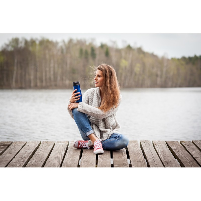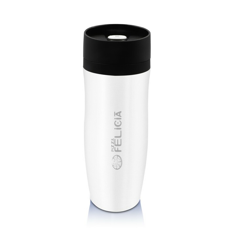 Kubek termiczny 375 ml Air Gifts, posiada podwójne ścianki ze stali nierdzewnej z miedzianą izolacją próżniową, co spowalnia oddawanie temperatury na zewnątrz, zachowując funkcje termosu, plastikowe wieczko z przyciskiem otwarcia/zamknięcia ustnika umożliwiającym obsługę jedną ręką, błyszczące wykończenie, utrzymuje temperaturę napojów gorących do 20 godzin +leakproof