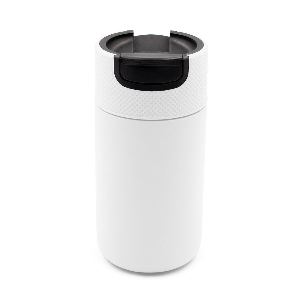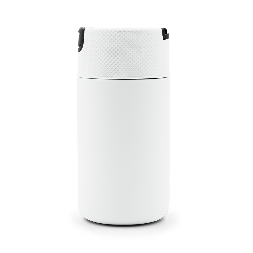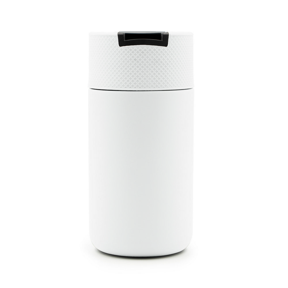 Kubek termiczny 400 ml Air Gifts, posiada podwójne ścianki ze stali nierdzewnej z próżnią między ściankami, co spowalnia oddawanie temperatury na zewnątrz, zachowując funkcje termosu, plastikowe wieczko z zamknięciem umożliwiającym obsługę jedną ręką, matowe wykończenie, utrzymuje temperaturę napojów gorących do 10 godzin +leakproof