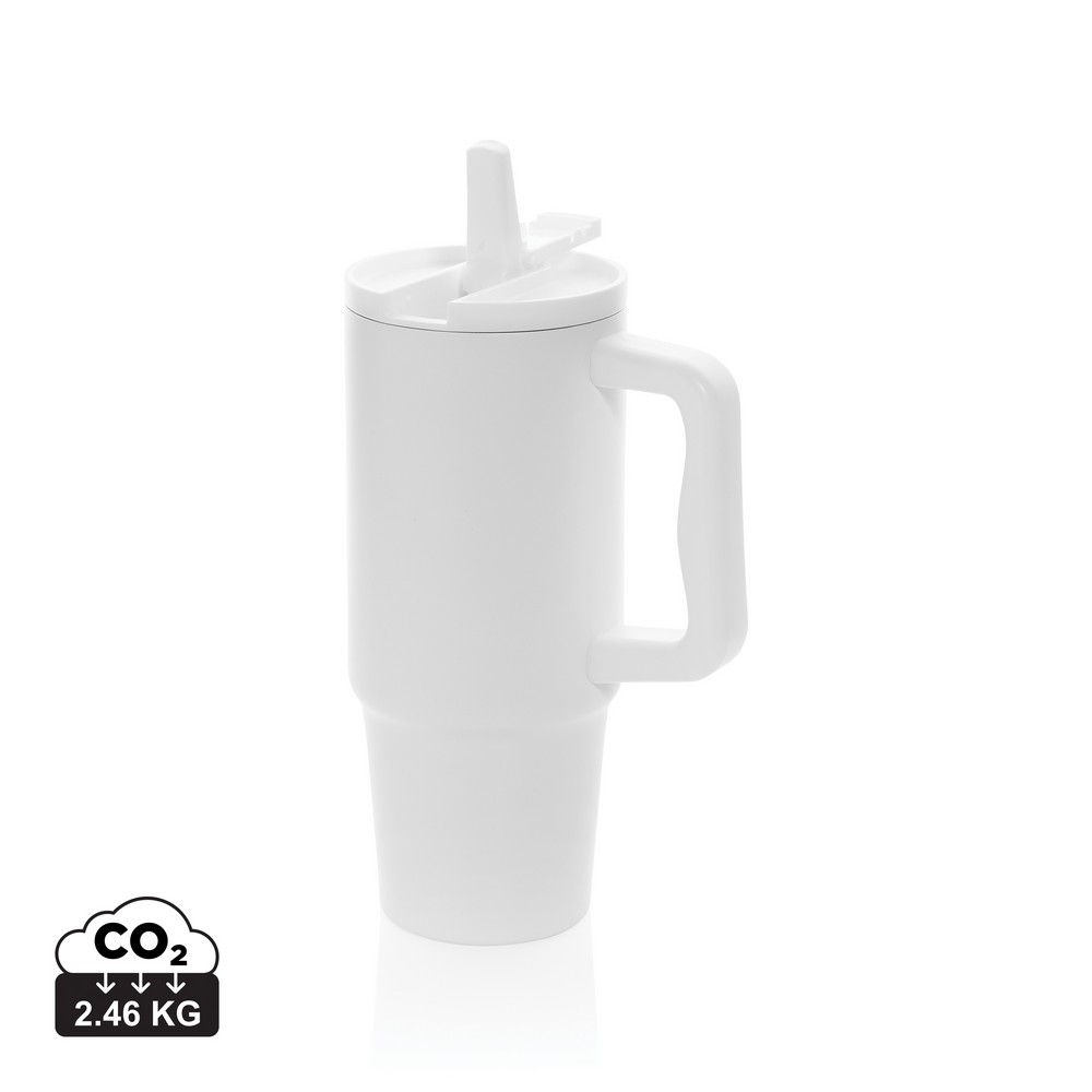 Kubek termiczny 900 ml, podwójne ścianki ze stali nierdzewnej z próżnią pomiędzy, obsługa jedną ręką, szczelne wieczko z dziubkiem i słomką, wyłącznie mycie ręczne, całkowita zawartość materiałów z recyklingu obliczona na podstawie wagi całkowitej przedmiotu: 68%