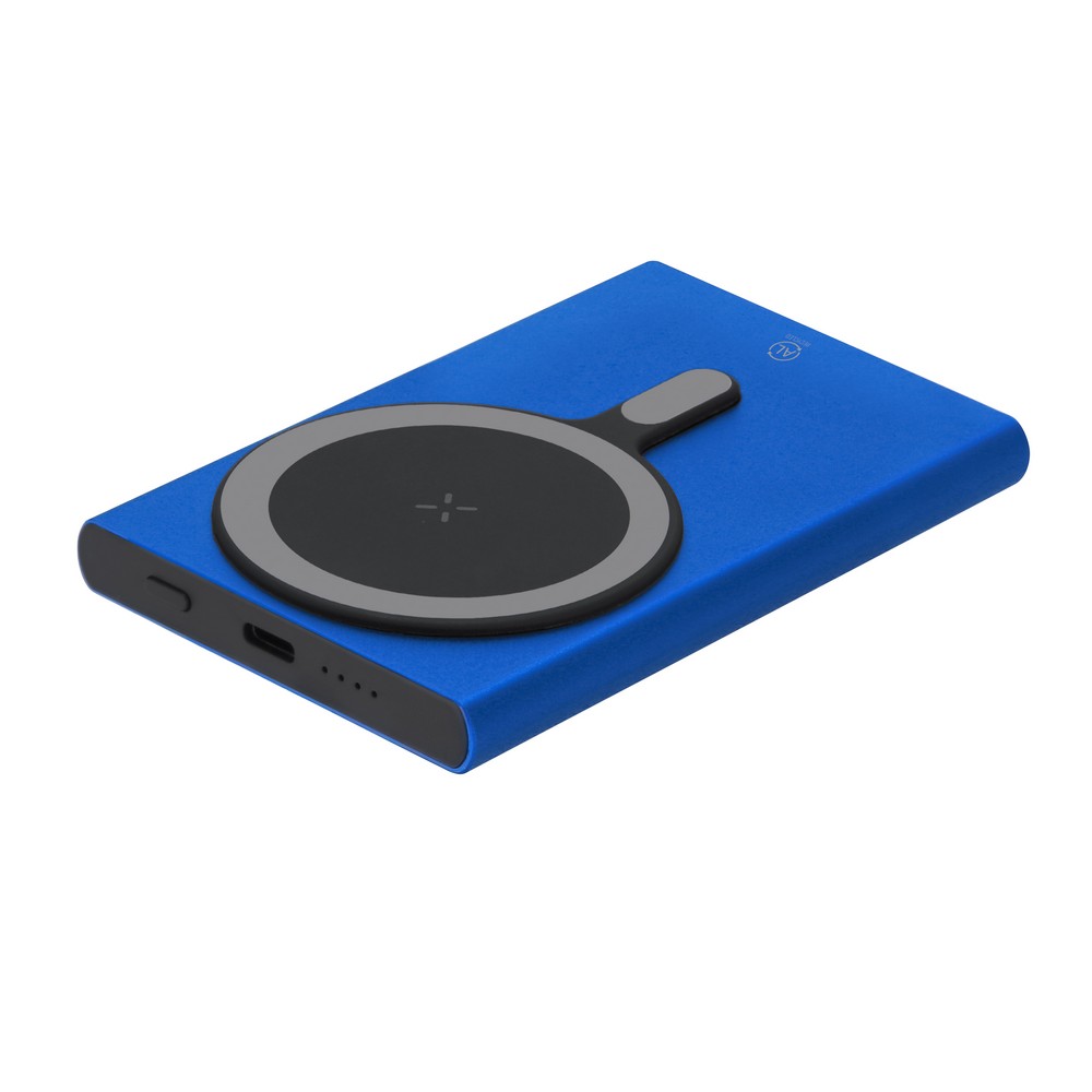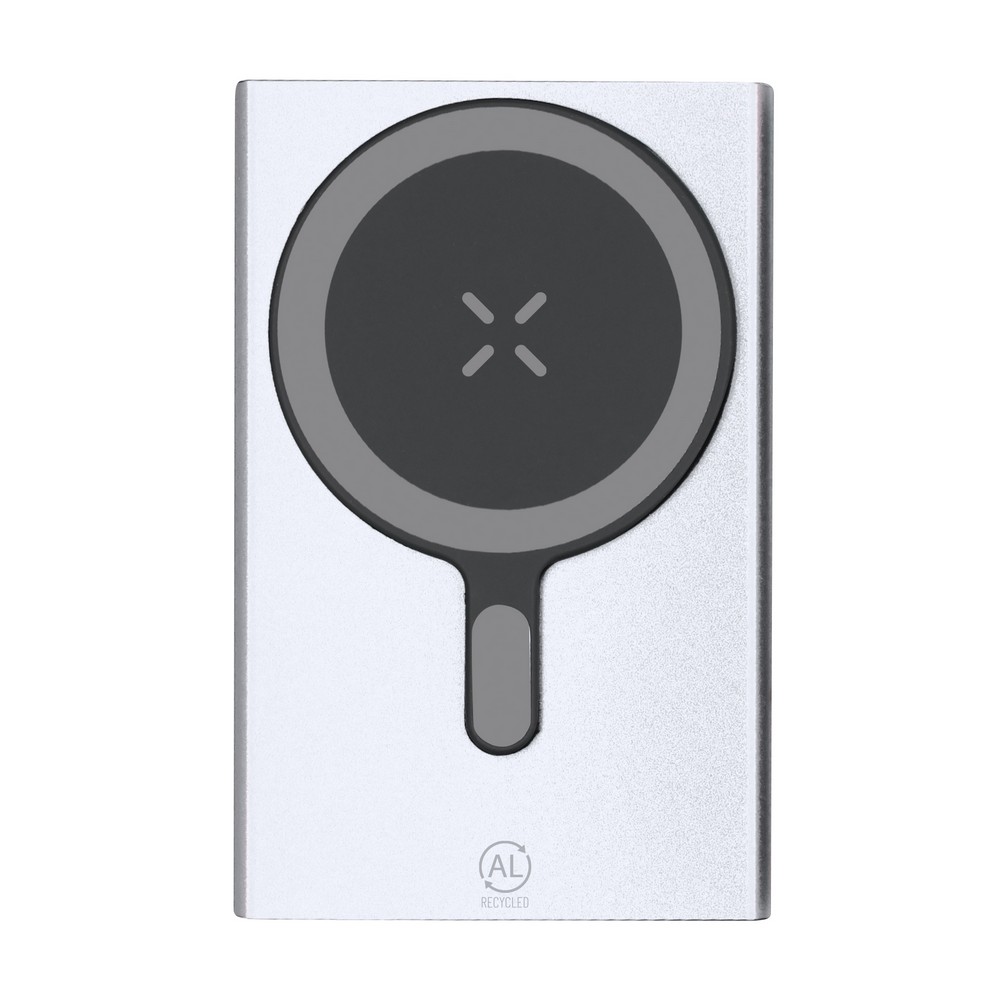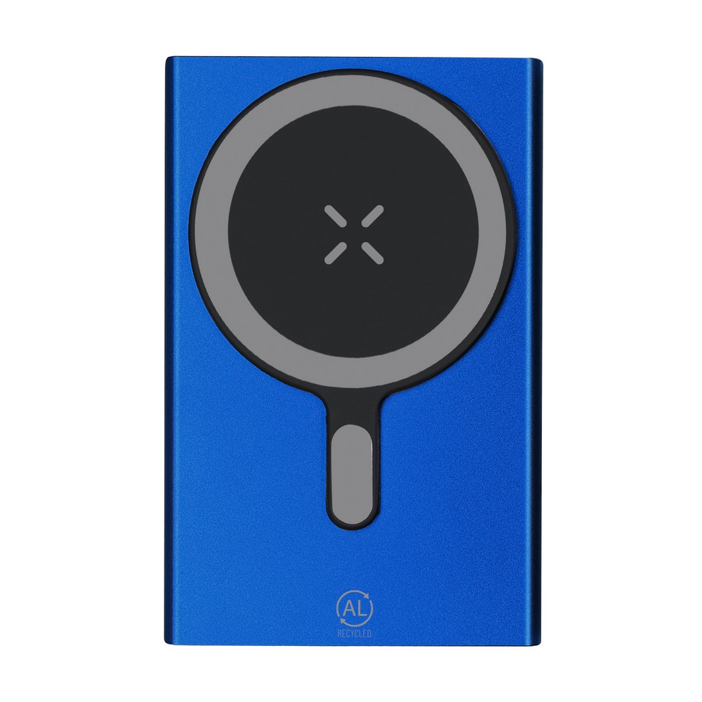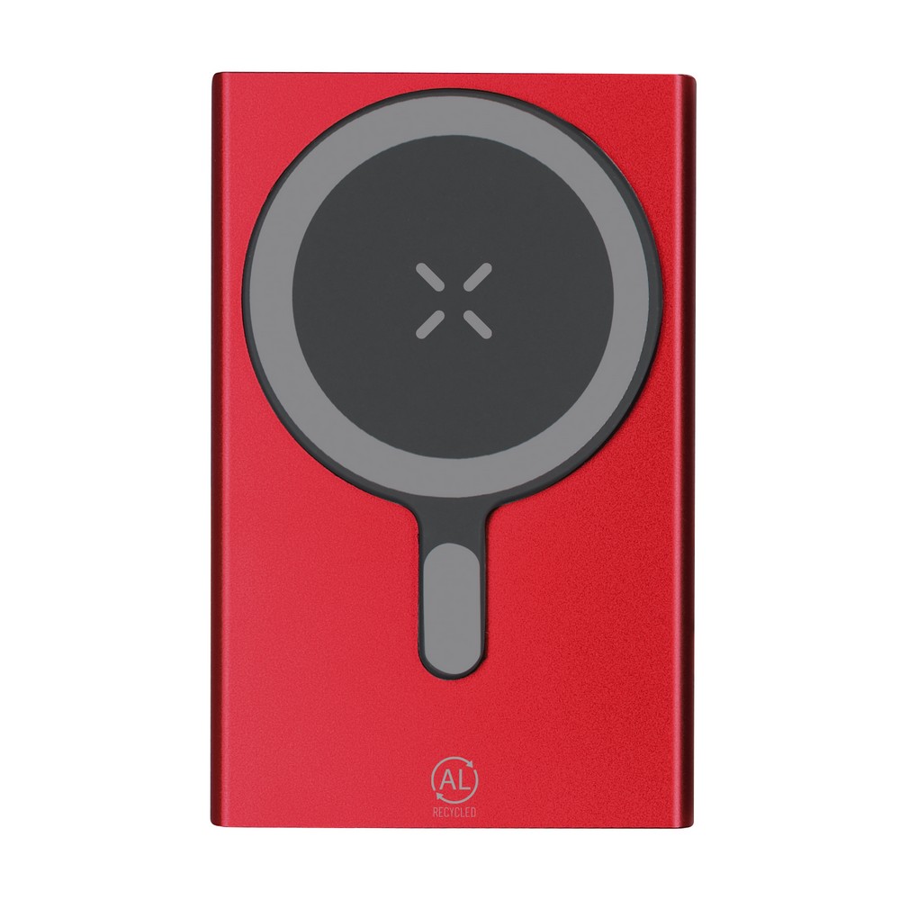 Magnetyczny bezprzewodowy power bank 5000 mAh, ładowarka bezprzewodowa 15W, wejście/wyjście USB-C 5-9V/1-1.67A, działa z urządzeniami posiadającymi możliwość ładowania indukcyjnego, funkcja magnetyczna działa tylko z kompatybilnymi urządzeniami, 4 diody wskazujące poziom naładowania, kabel UBS-C w komplecie, produkt wykonany z aluminium z recyklingu