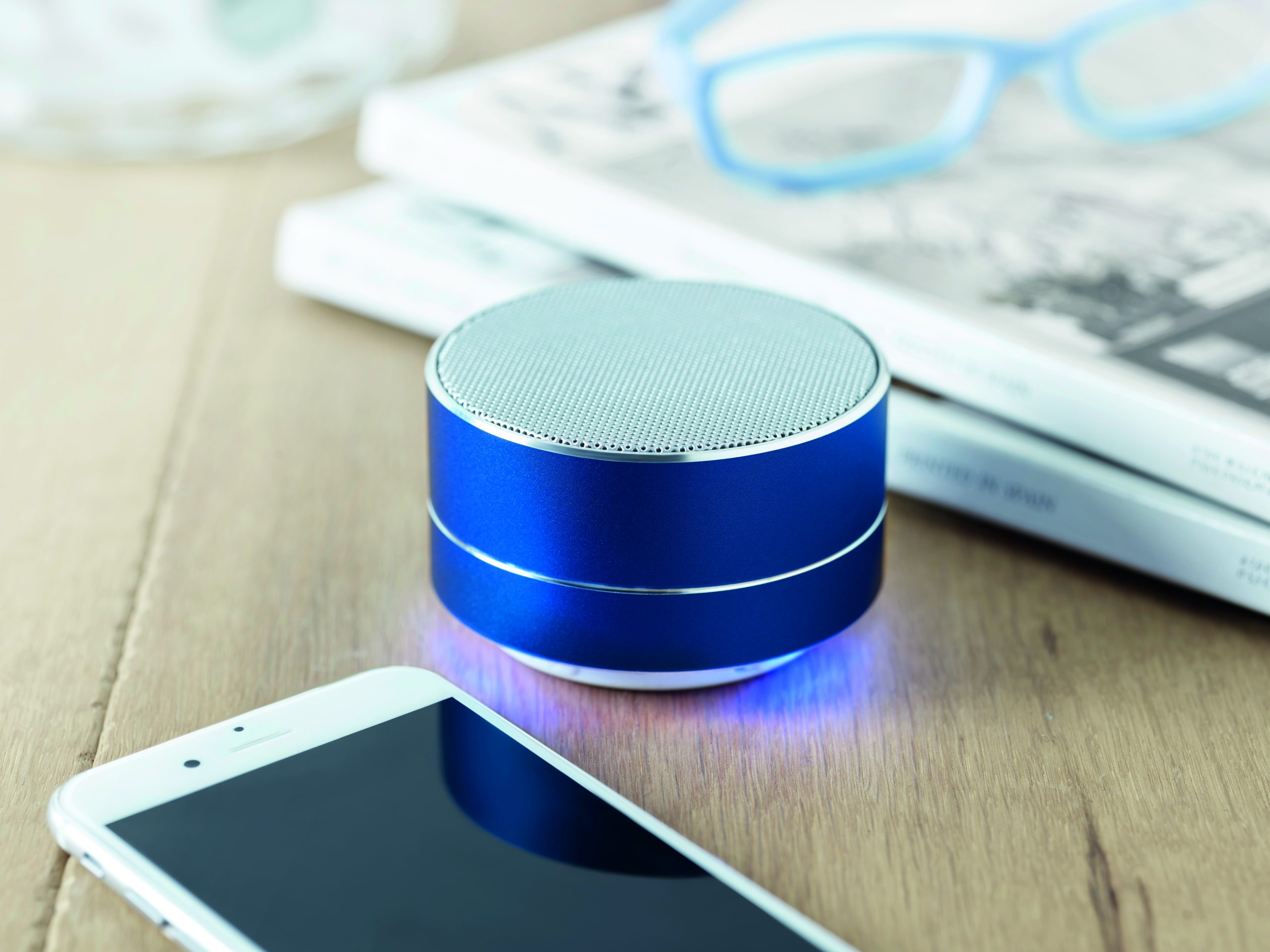 Aluminiowy głośnik bezprzewodowy 2.1 z baterią Li-on 450mAh i lampką umieszczoną w dolnej części. Dane wyjściowe: 3W, 4 Ohm i 5V. W zestawie kabel Micro USB. Czas odtwarzania ok. 3h.