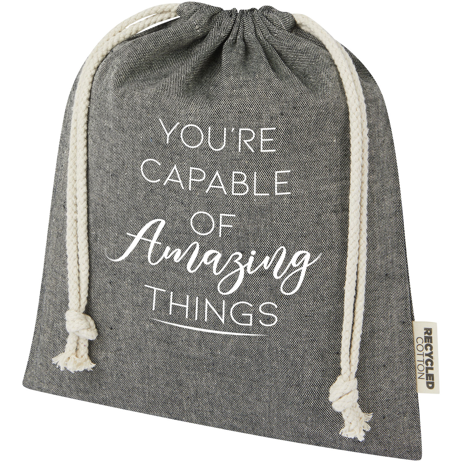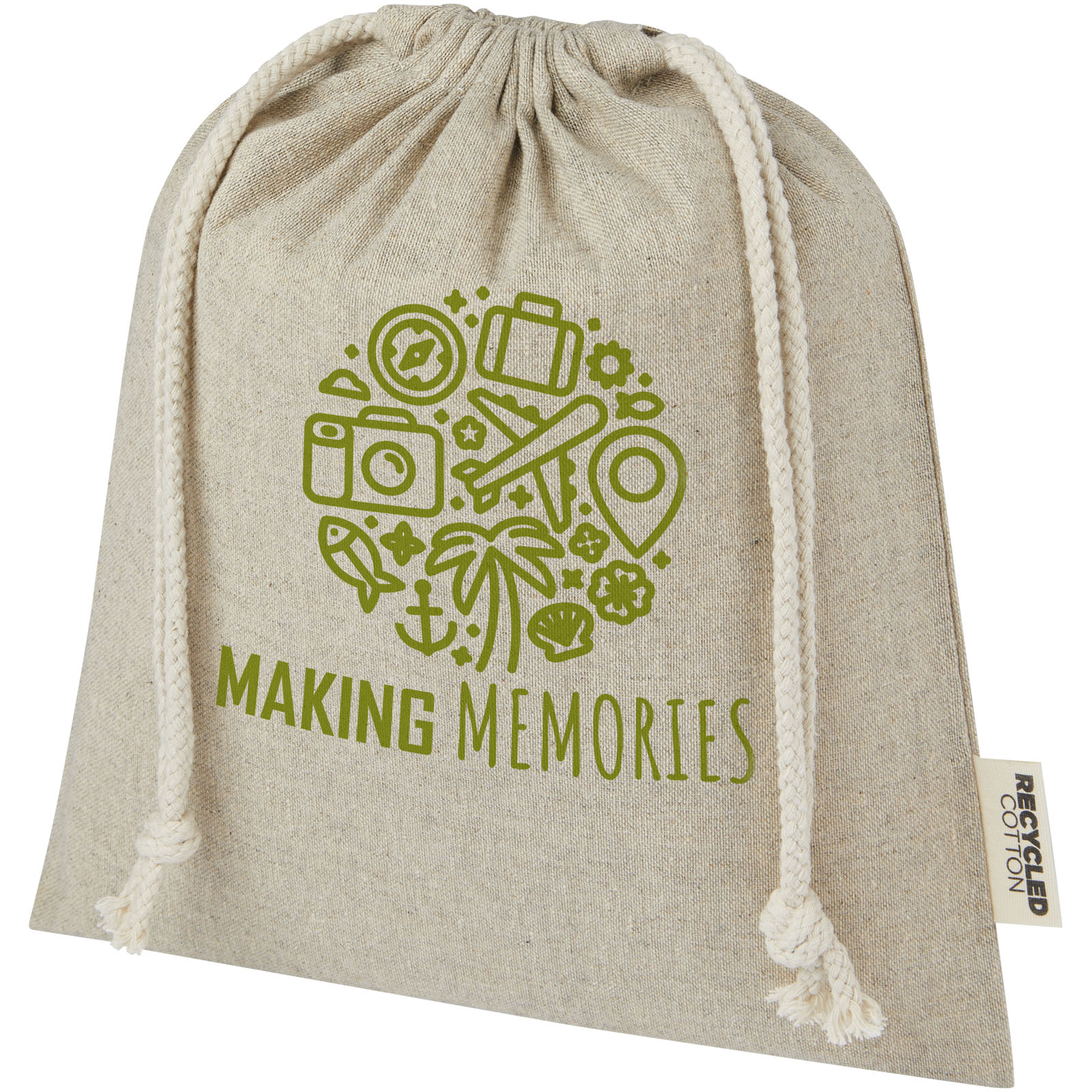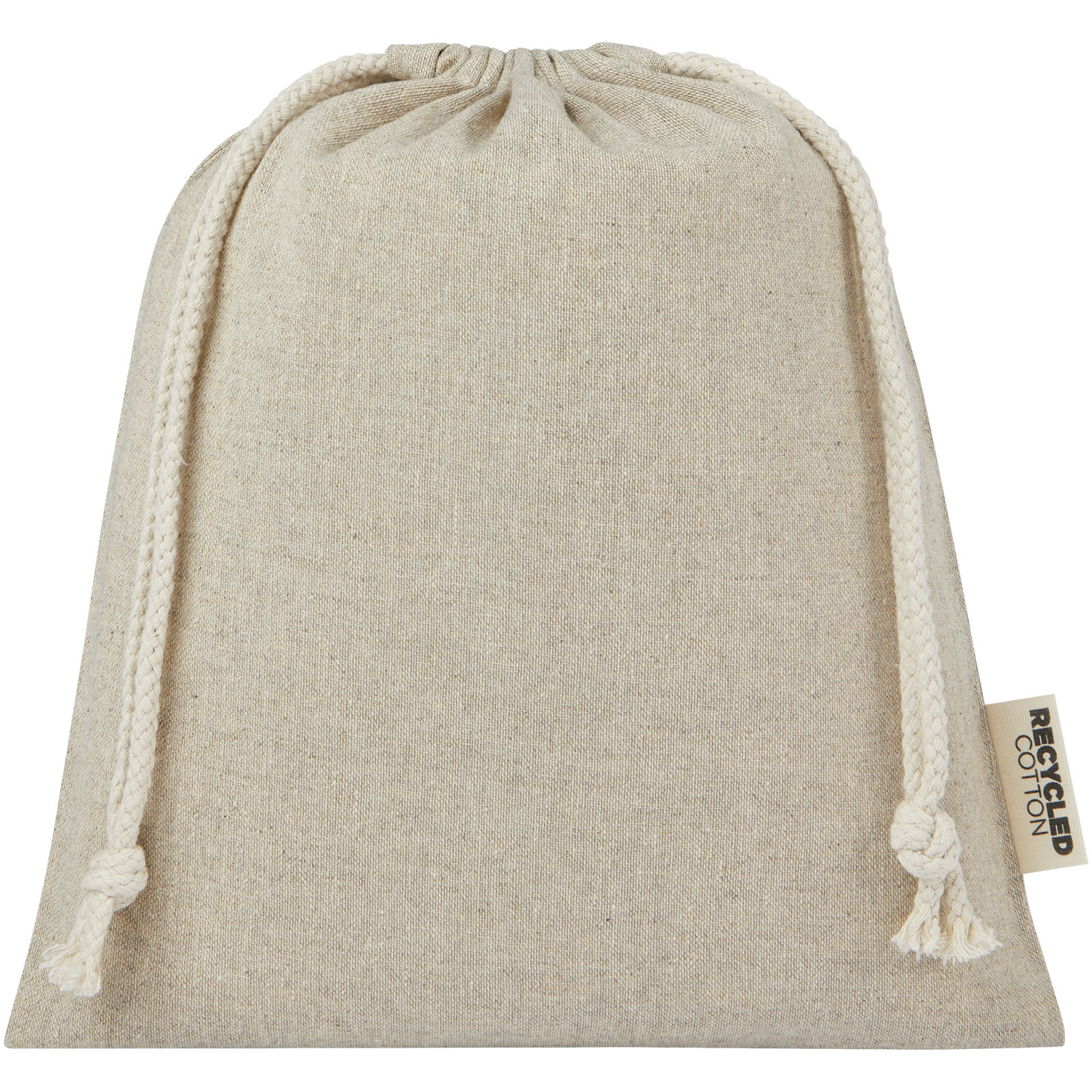Torba upominkowa wykonana z bawełny z recyklingu z certyfikatem GRS z zamknięciem na sznurek bawełniany. Idealna do prezentów lub przechowywania przedmiotów. Wymiary: 25 x 30 cm.