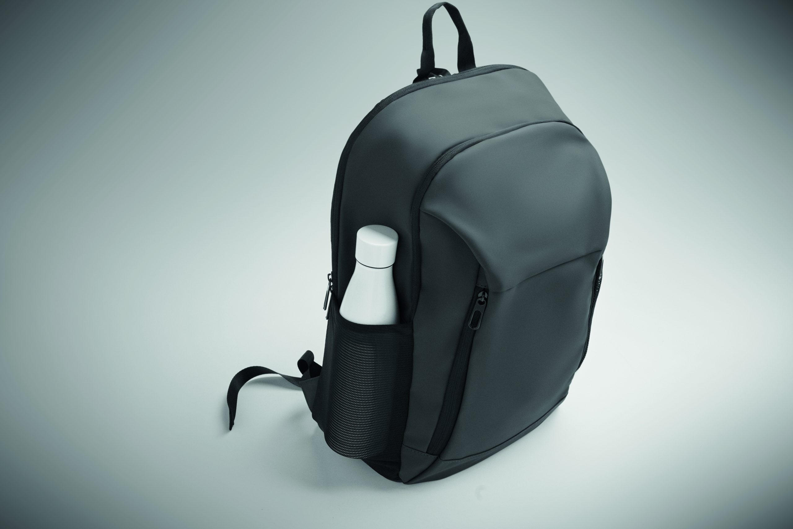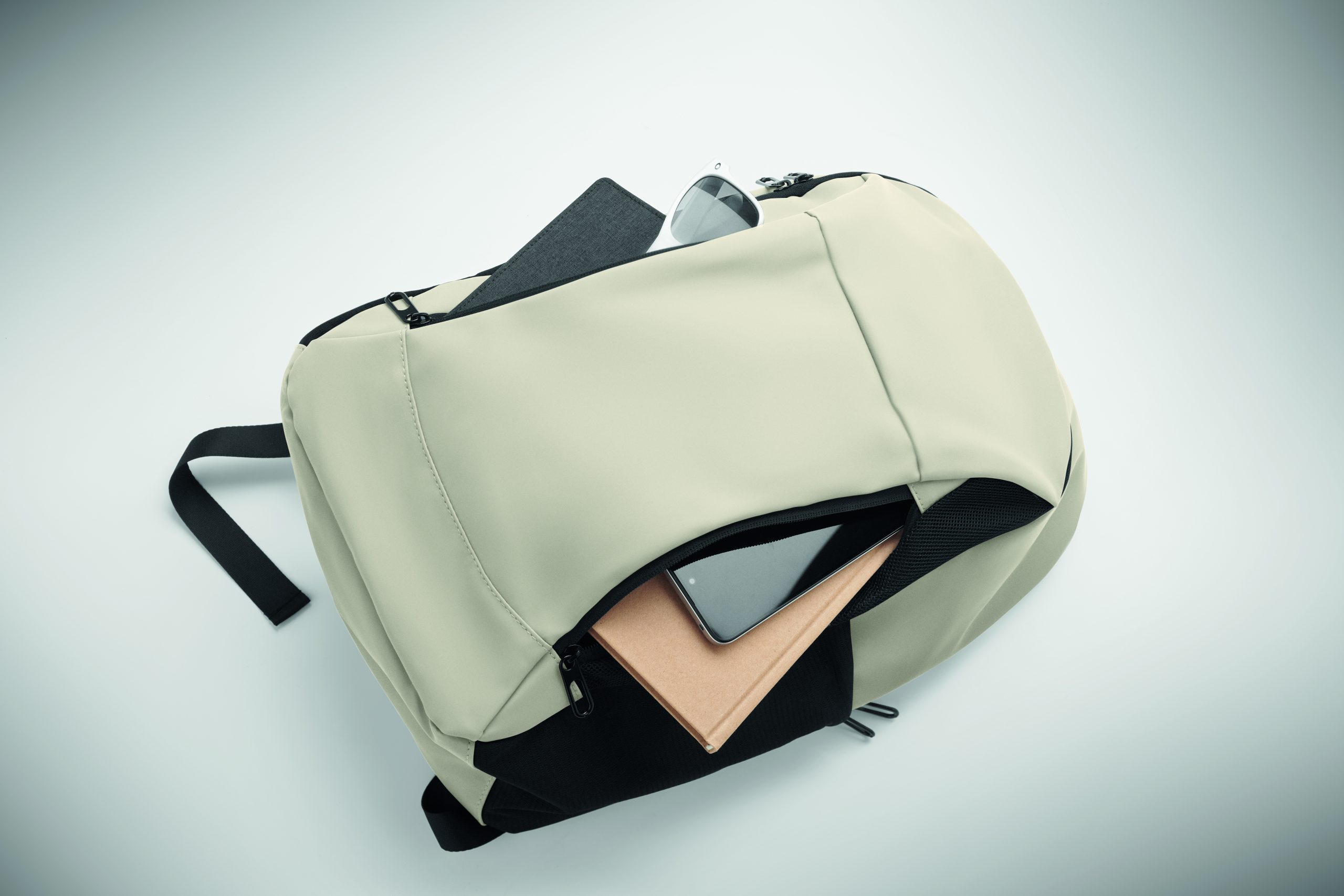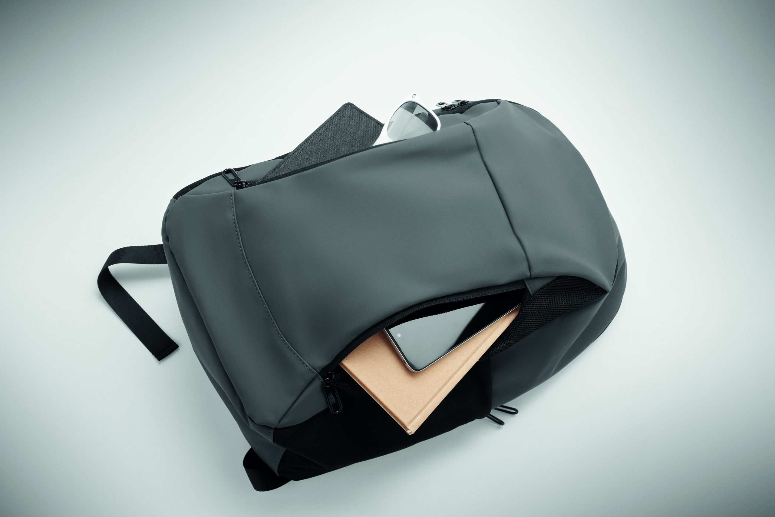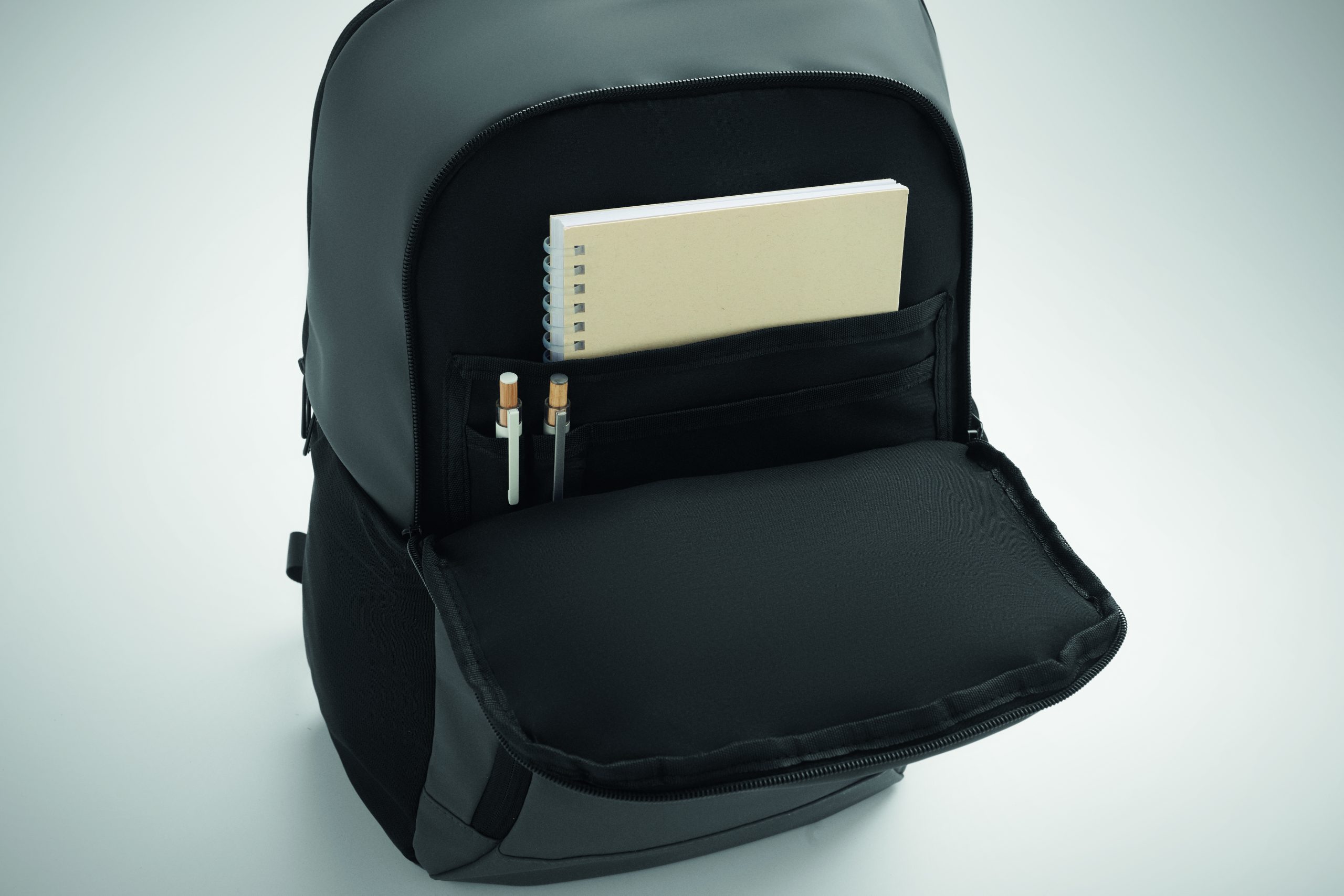 Plecak na laptopa 15 cali z miękkiego PU z wyściełanym tyłem i ukrytą komorą główną zapinaną na zamek. 1 przednia kieszeń zapinana na zamek, 2 przednie boczne kieszenie zapinane na zamek i 2 boczne kieszenie z elastycznej siatki. Podszewka z RPET 210D.