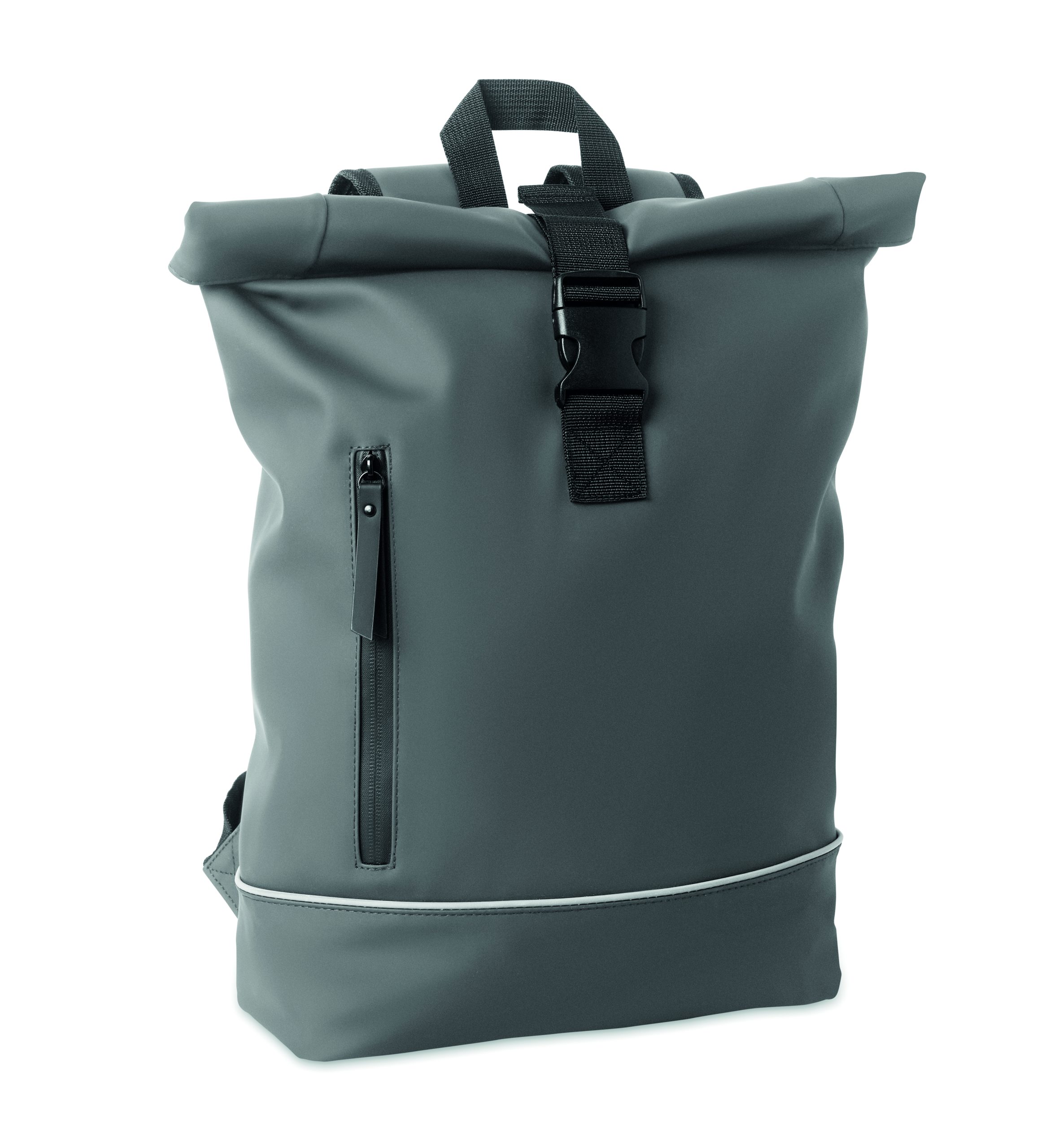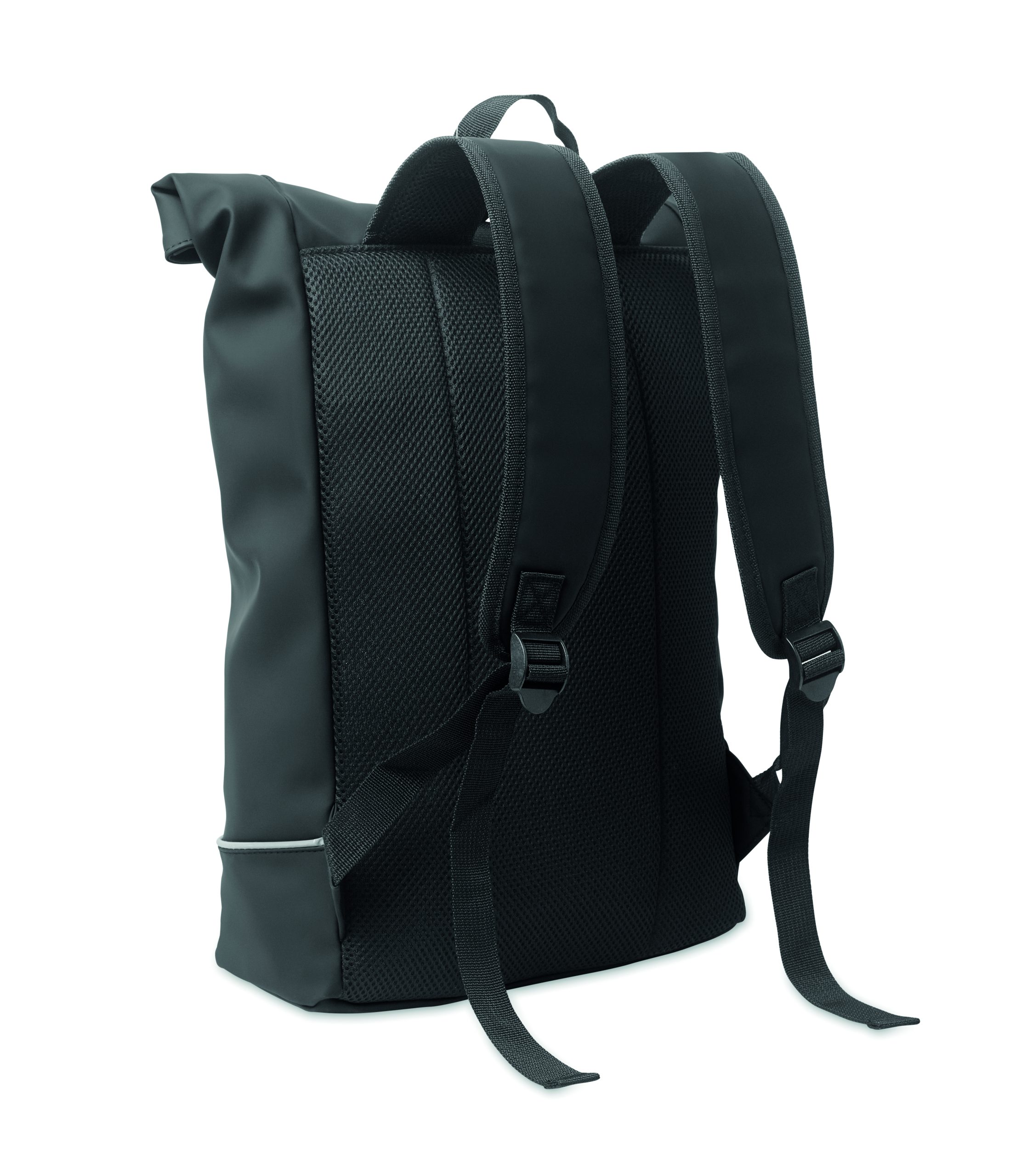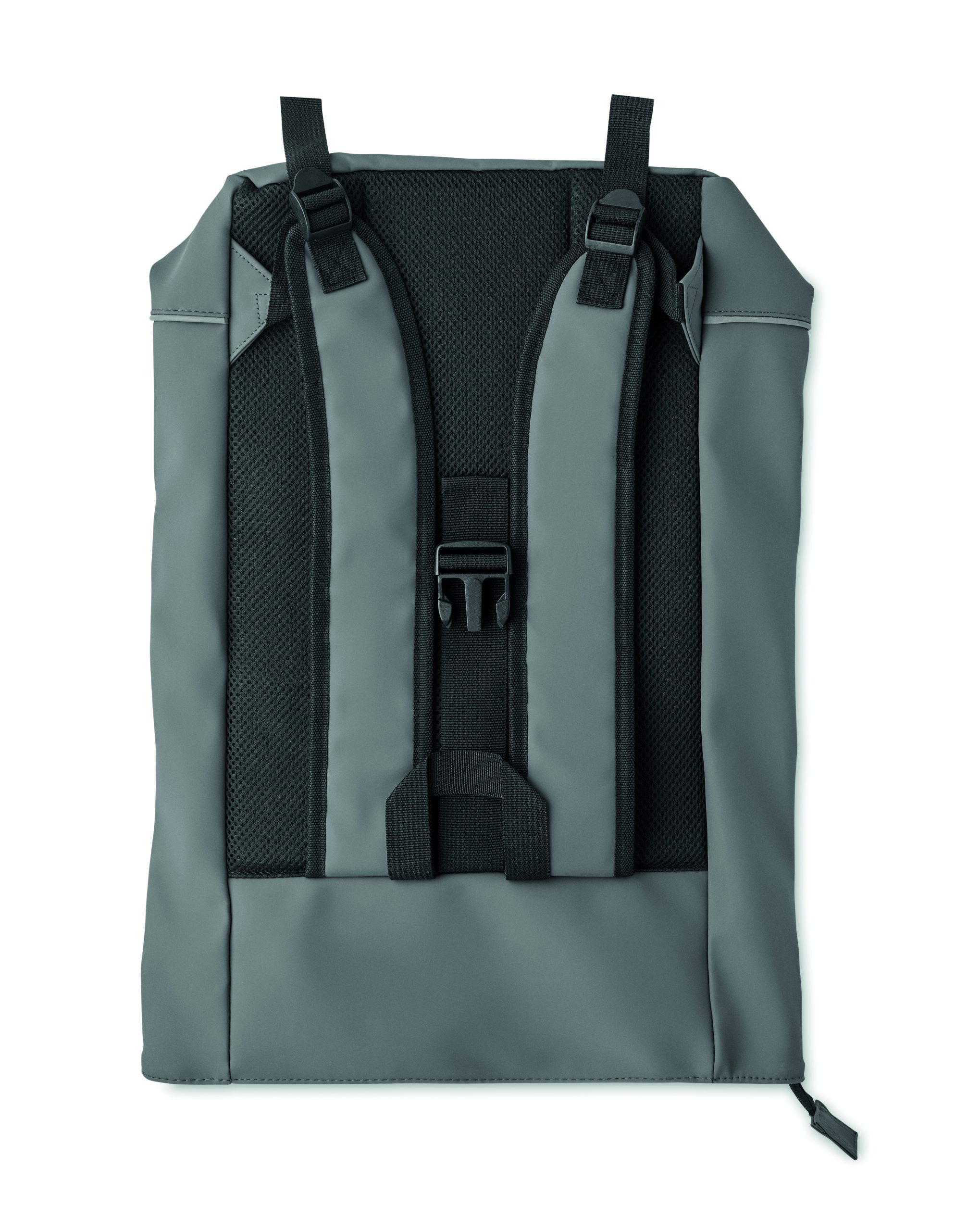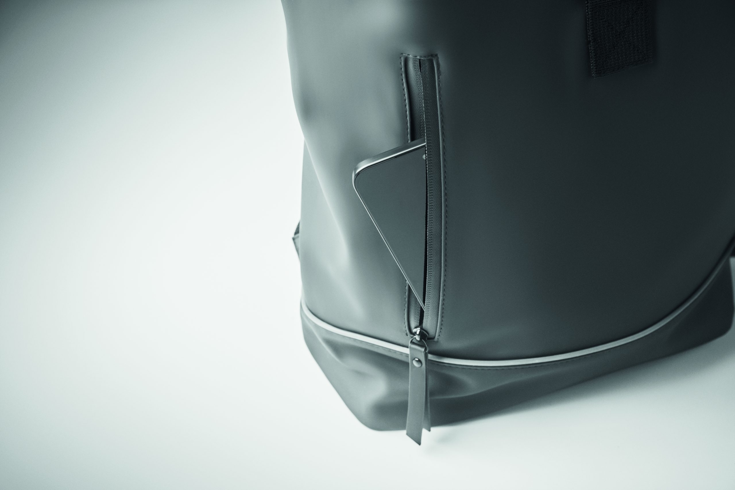 15-calowy plecak na laptopa z miękkiego PU z wyściełanym tyłem i wzmocnieniem podstawy z odblaskowym paskiem. Wodoodporna kieszeń przednia zapinana na zamek. Podszewka z poliestru 210D RPET.