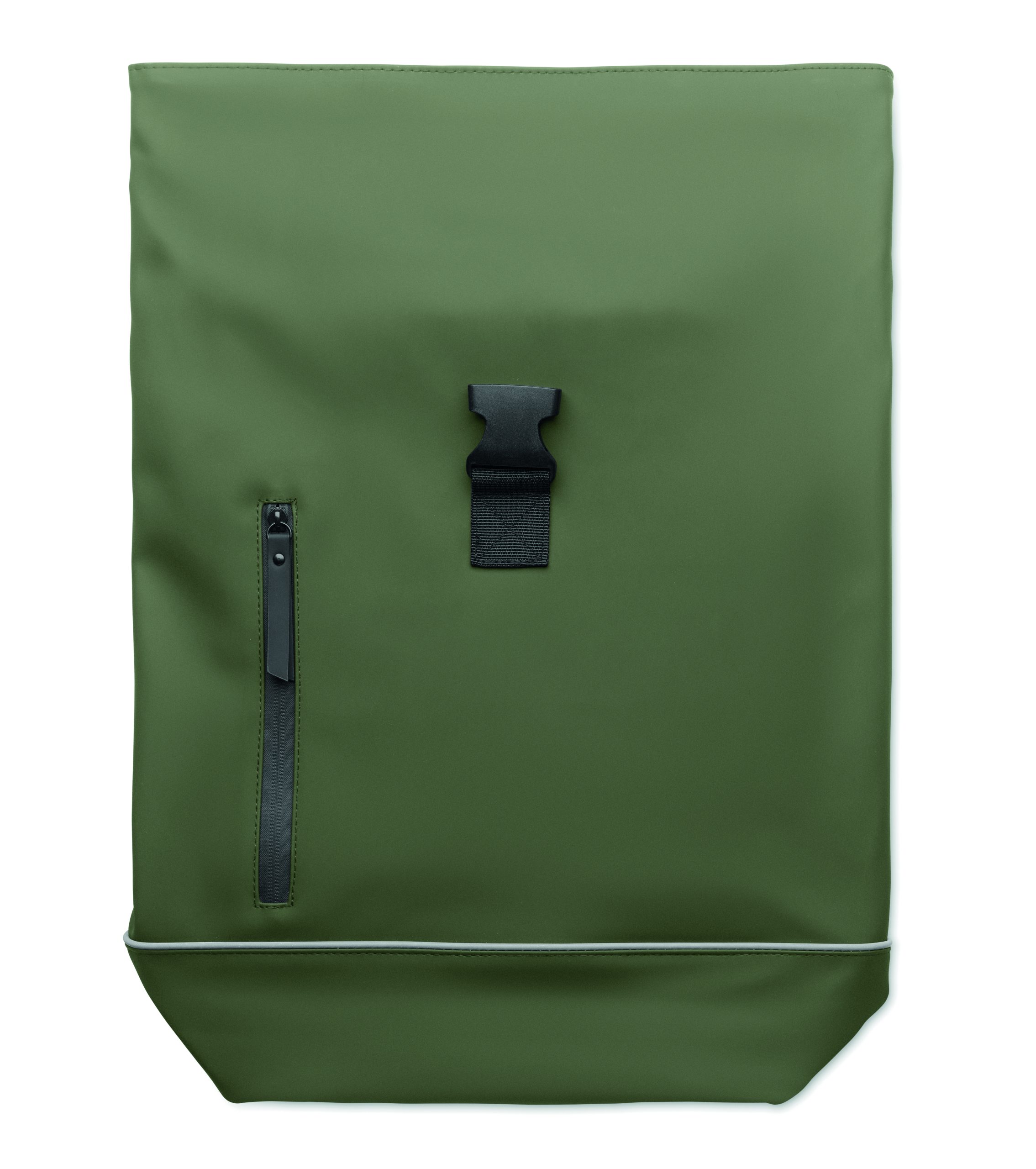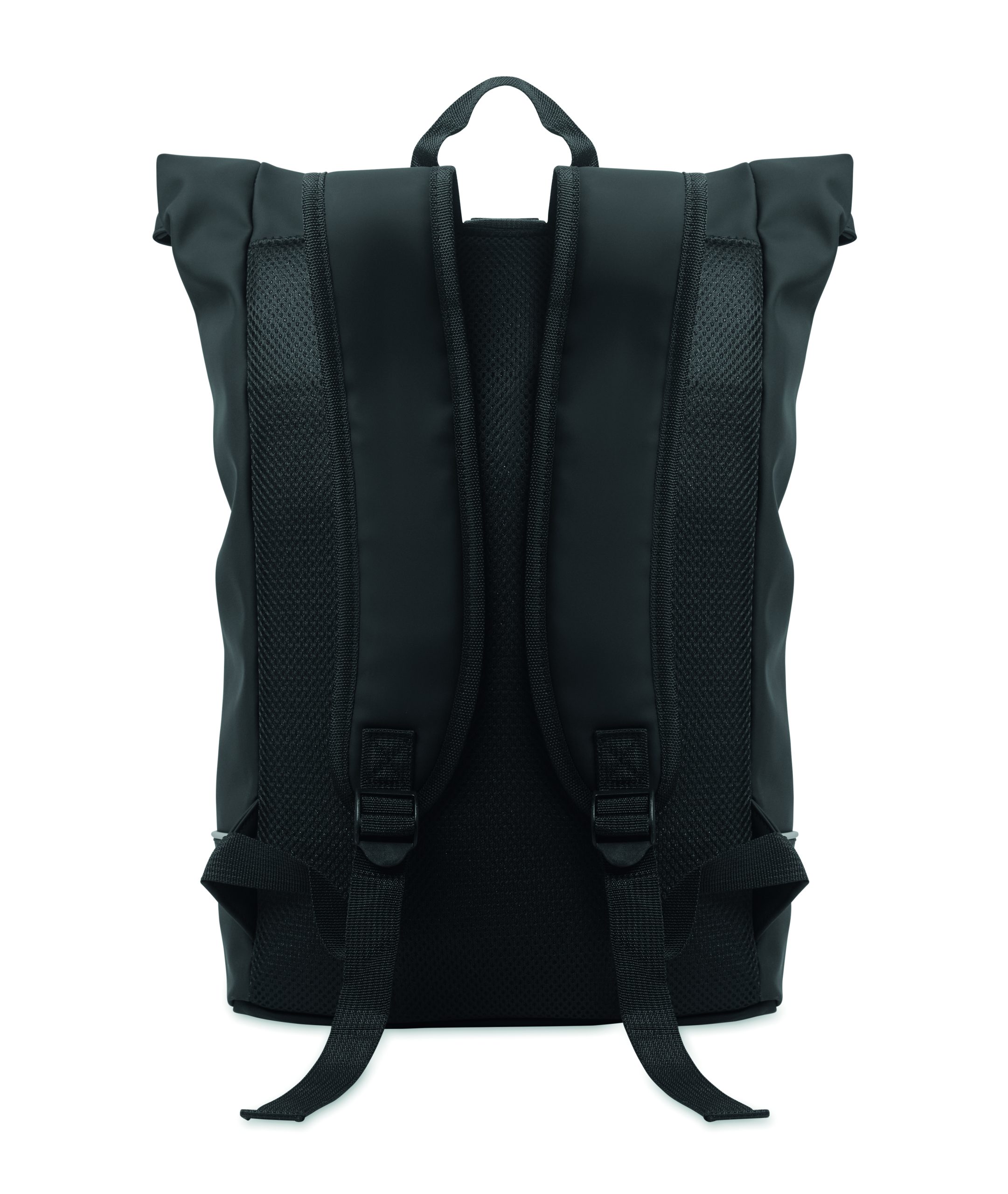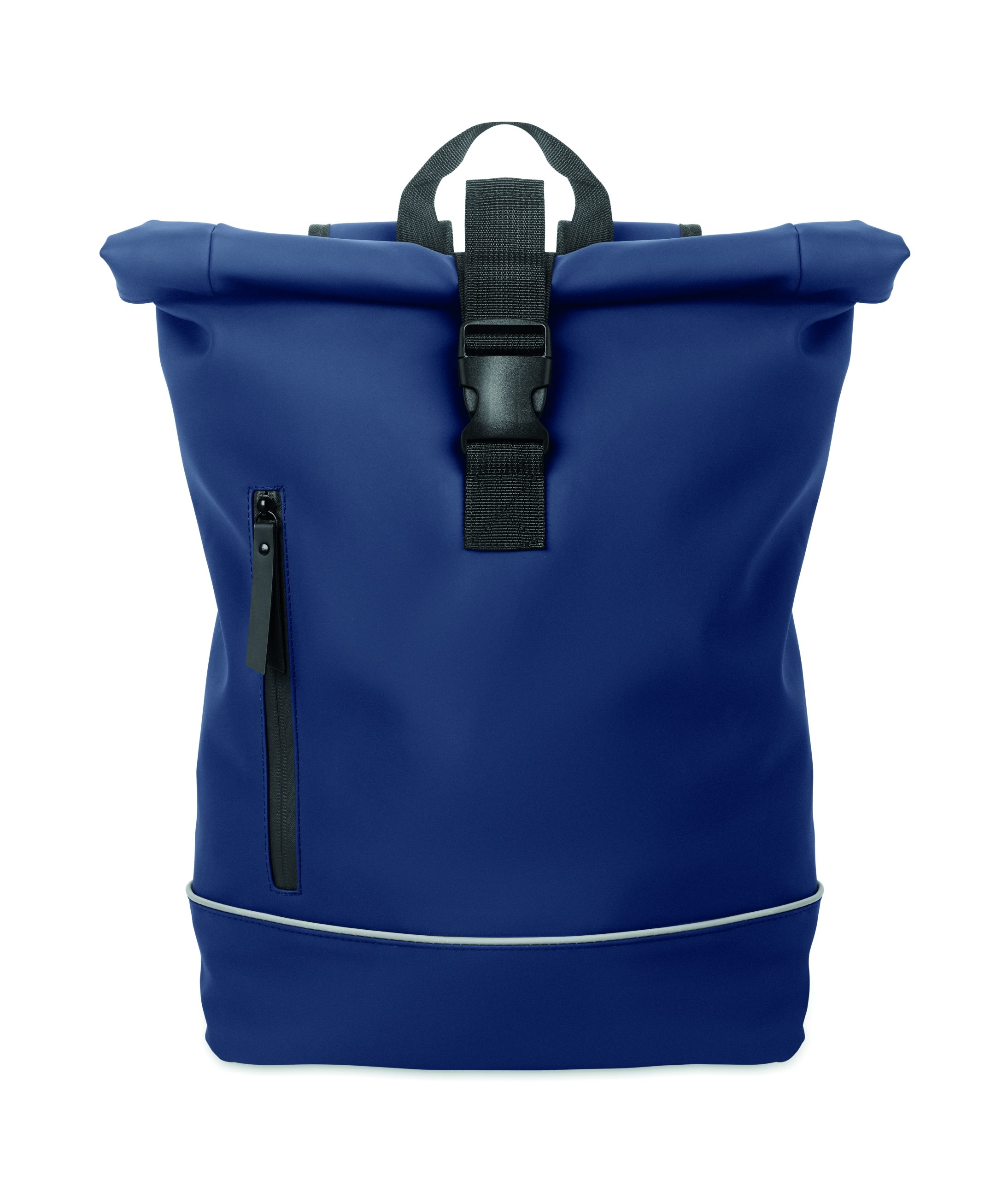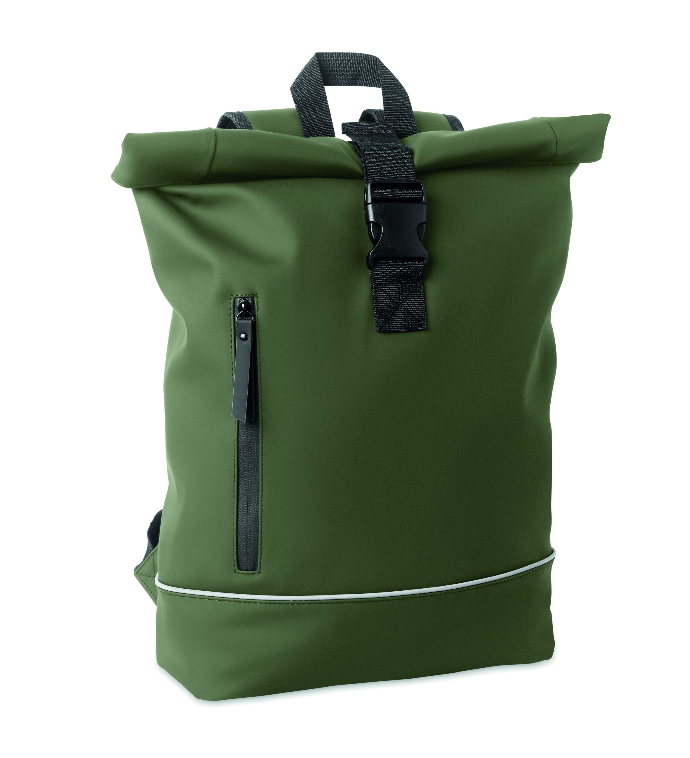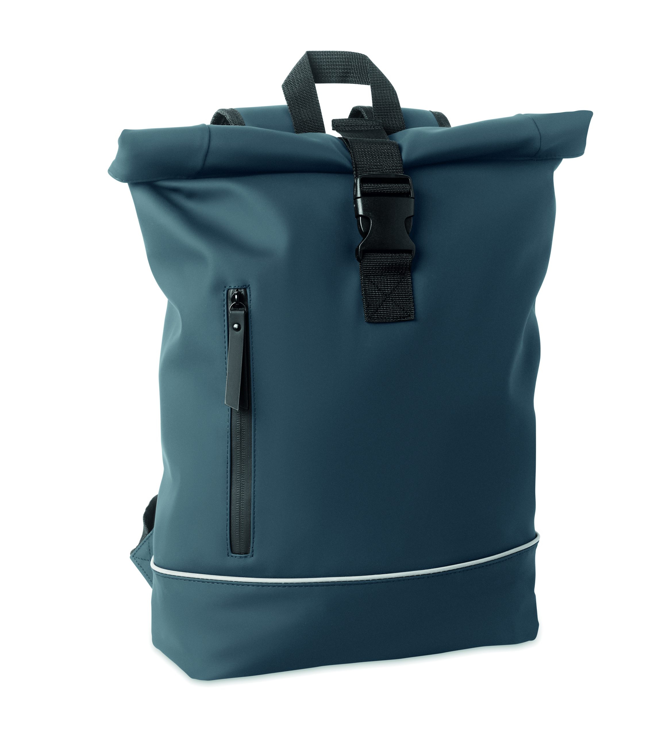 15-calowy plecak na laptopa z miękkiego PU z wyściełanym tyłem i wzmocnieniem podstawy z odblaskowym paskiem. Wodoodporna kieszeń przednia zapinana na zamek. Podszewka z poliestru 210D RPET.