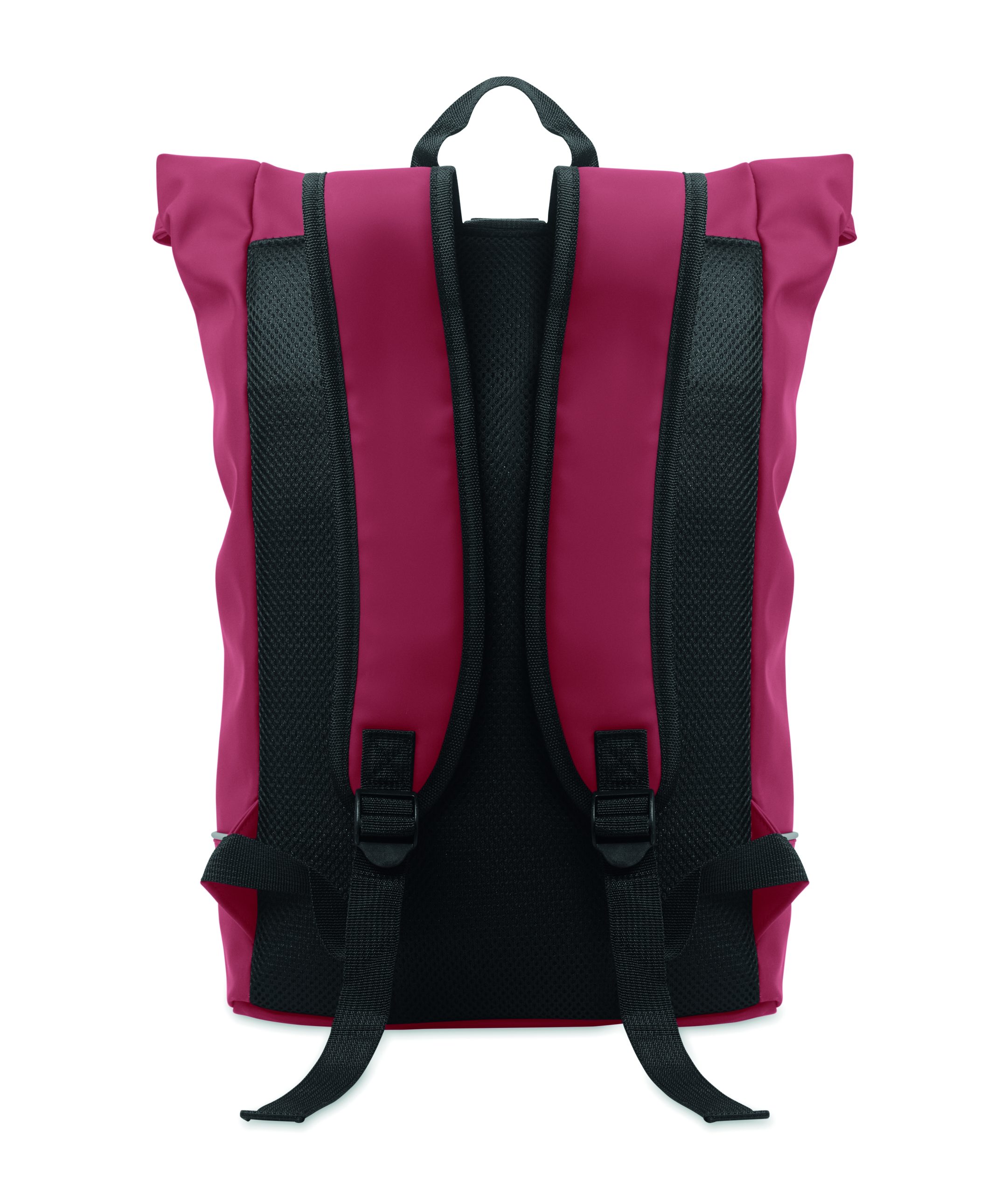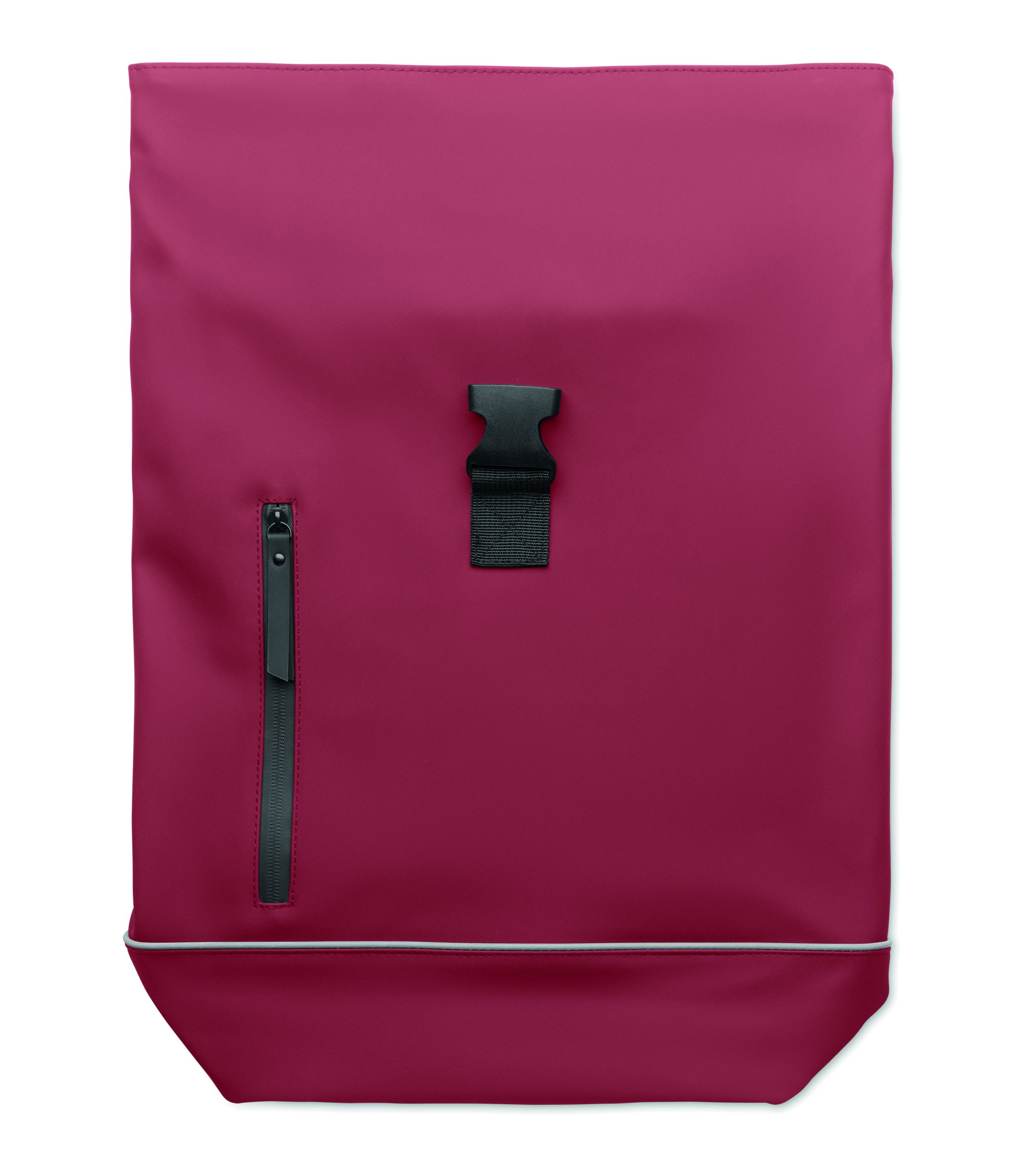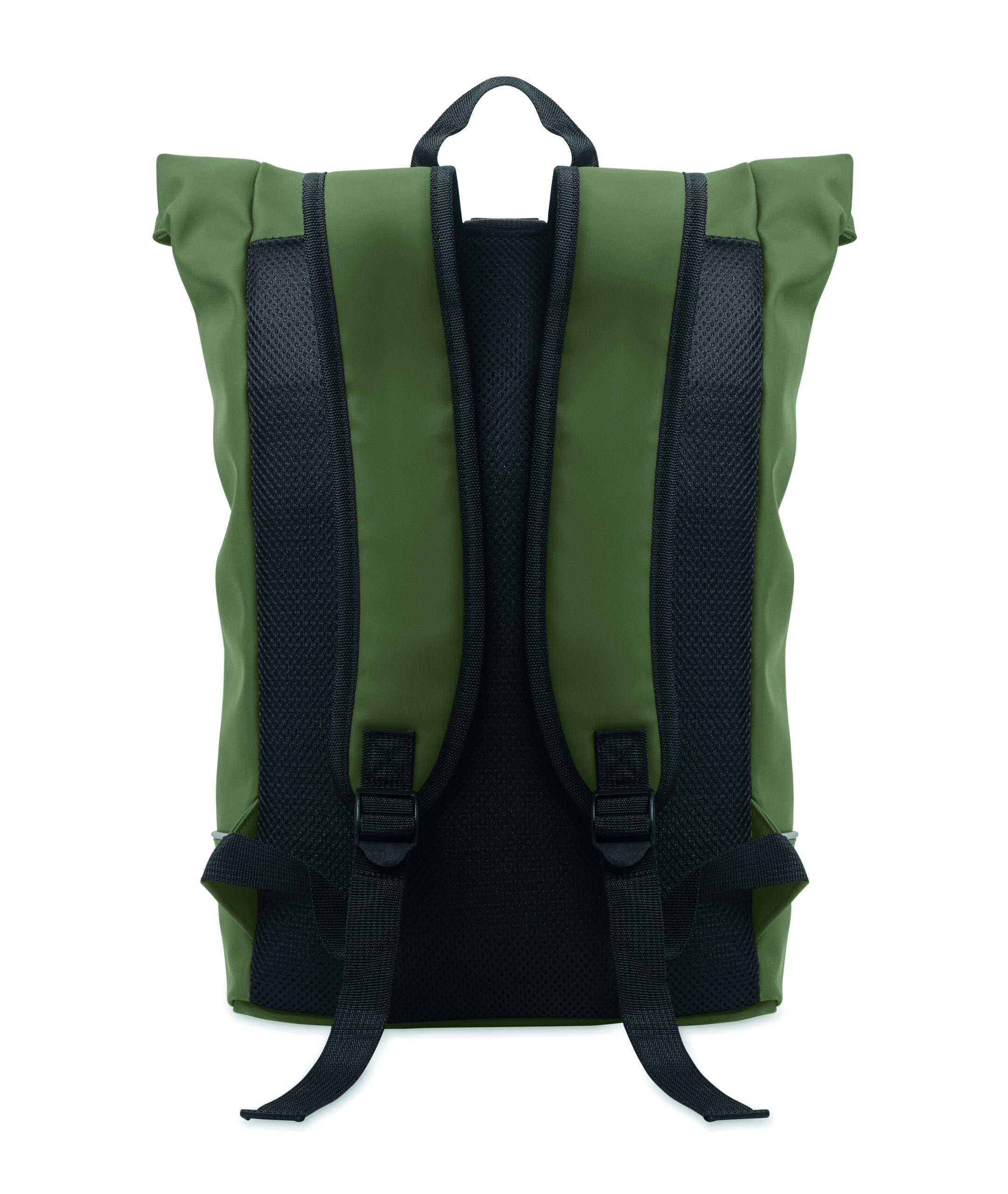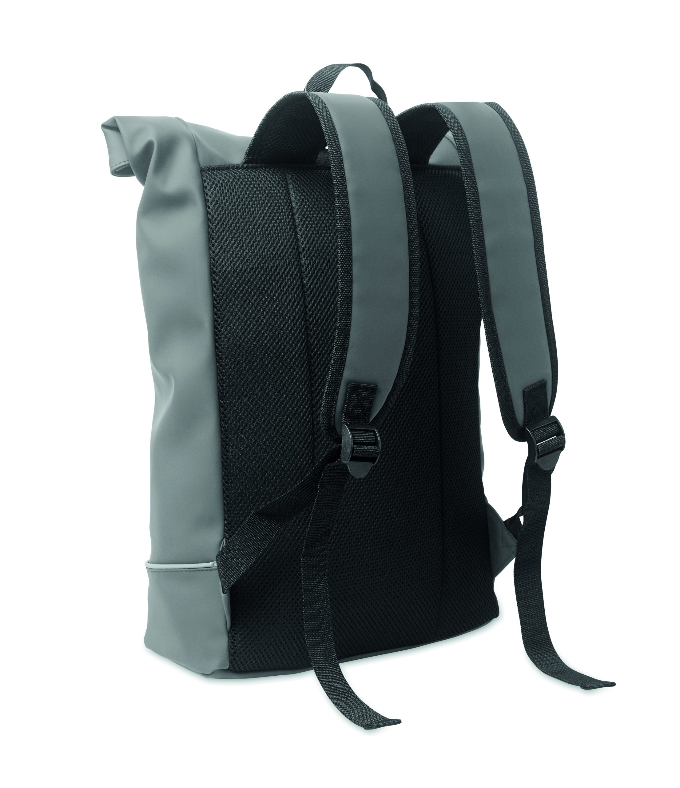 15-calowy plecak na laptopa z miękkiego PU z wyściełanym tyłem i wzmocnieniem podstawy z odblaskowym paskiem. Wodoodporna kieszeń przednia zapinana na zamek. Podszewka z poliestru 210D RPET.