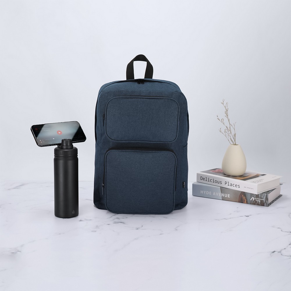 Plecak na laptopa, wyposażony w wyściełaną kieszeń na laptopa 15″ i tablet 10″, miękki tył zwiększający komfort użytkowania i regulowane paski na ramię umożliwiające dopasowanie ich długości do własnych preferencji, idealny do przechowywania sprzętu elektronicznego i codziennego użytku, produkt wykonany z poliestru 600D RPET