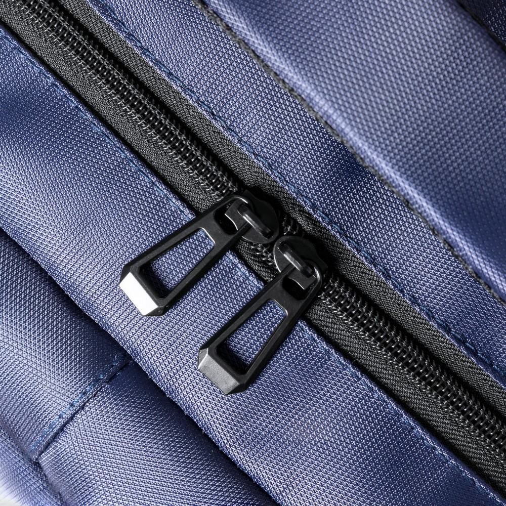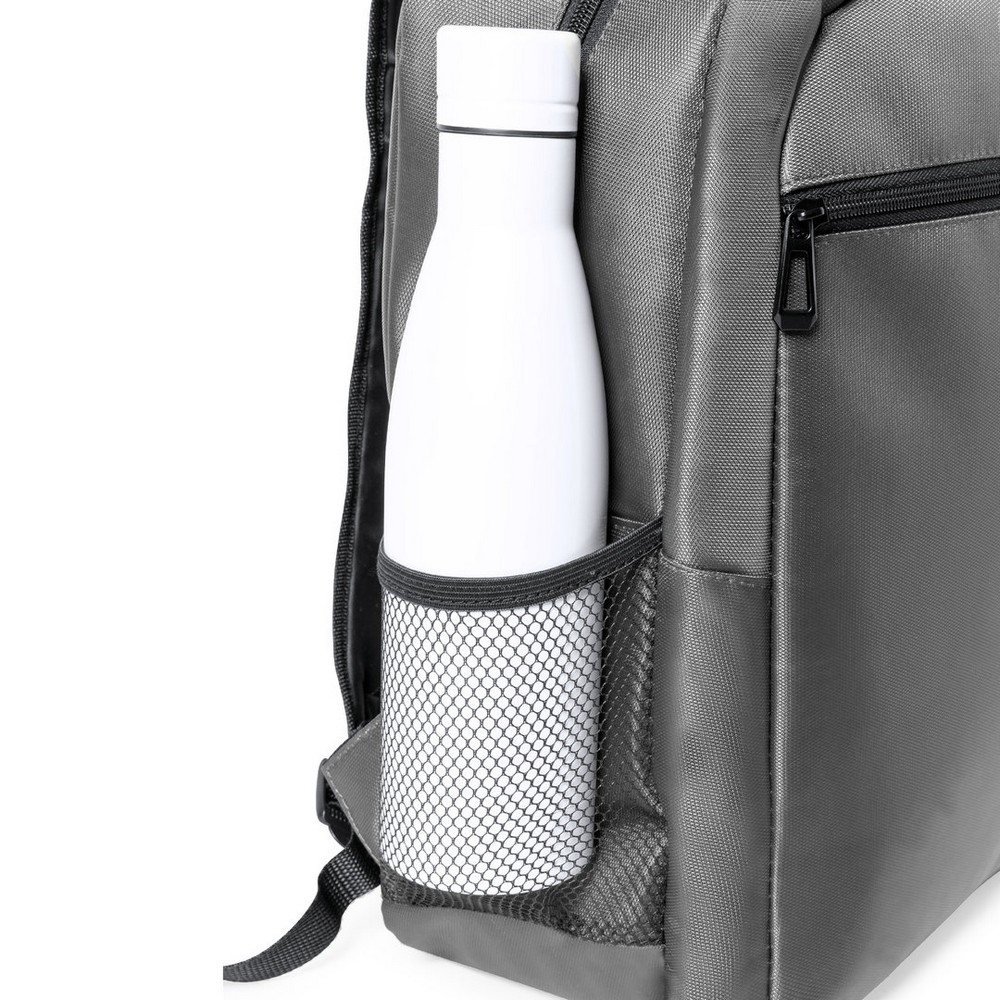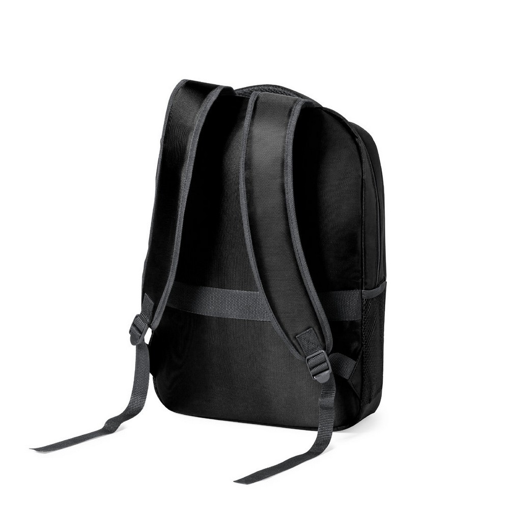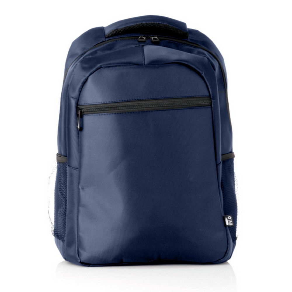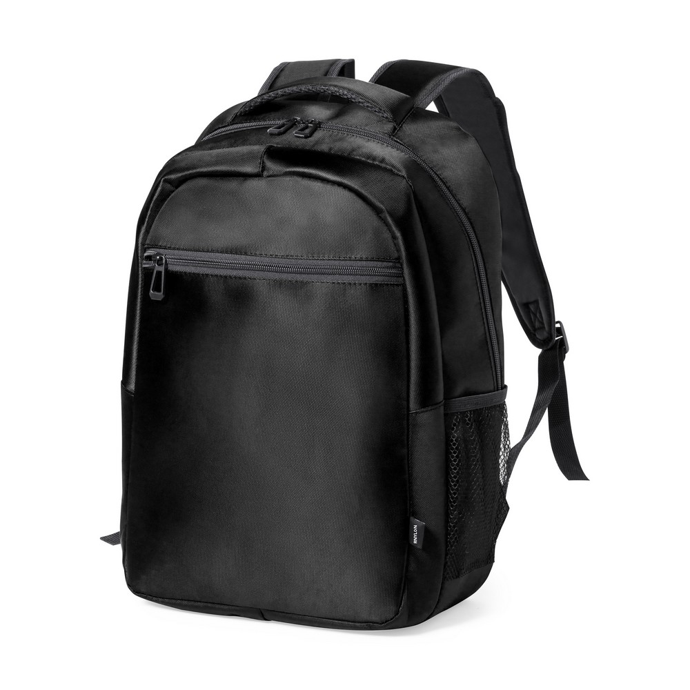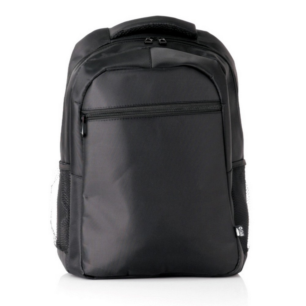 Plecak na laptopa 15″ z nylonu z recyklingu, główna przegroda i kieszeń przednia na zamek błyskawiczny, 2 boczne kieszenie siateczkowe, pasek do zamocowania na torbie podróżnej, miękki tył i regulowane paski na ramię