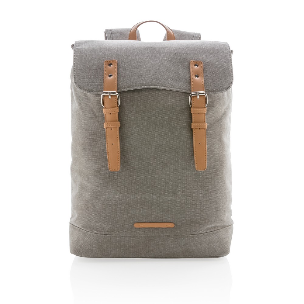 Plecak z miękką przegrodą na laptopa 15,6″, wykonany z wytrzymałego płótna, pokrywa górna zamykana na paski z magnetycznymi klamrami, nie zawiera PVC, ślad węglowy produktu: 8,47 kg CO2
