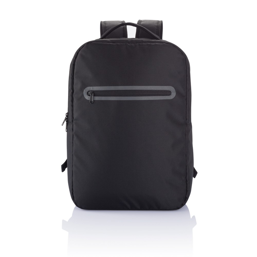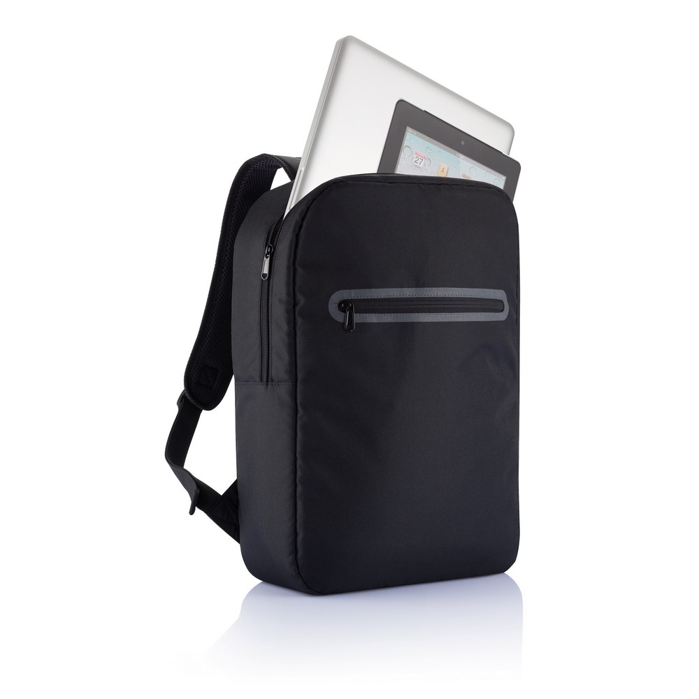 Plecak na laptopa 15,6″, wykonany z poliestru 300D, 1 przegroda główna z kieszenią na tablet oraz organizer, nie zawiera PVC, ślad węglowy produktu: 3,45 kg CO2