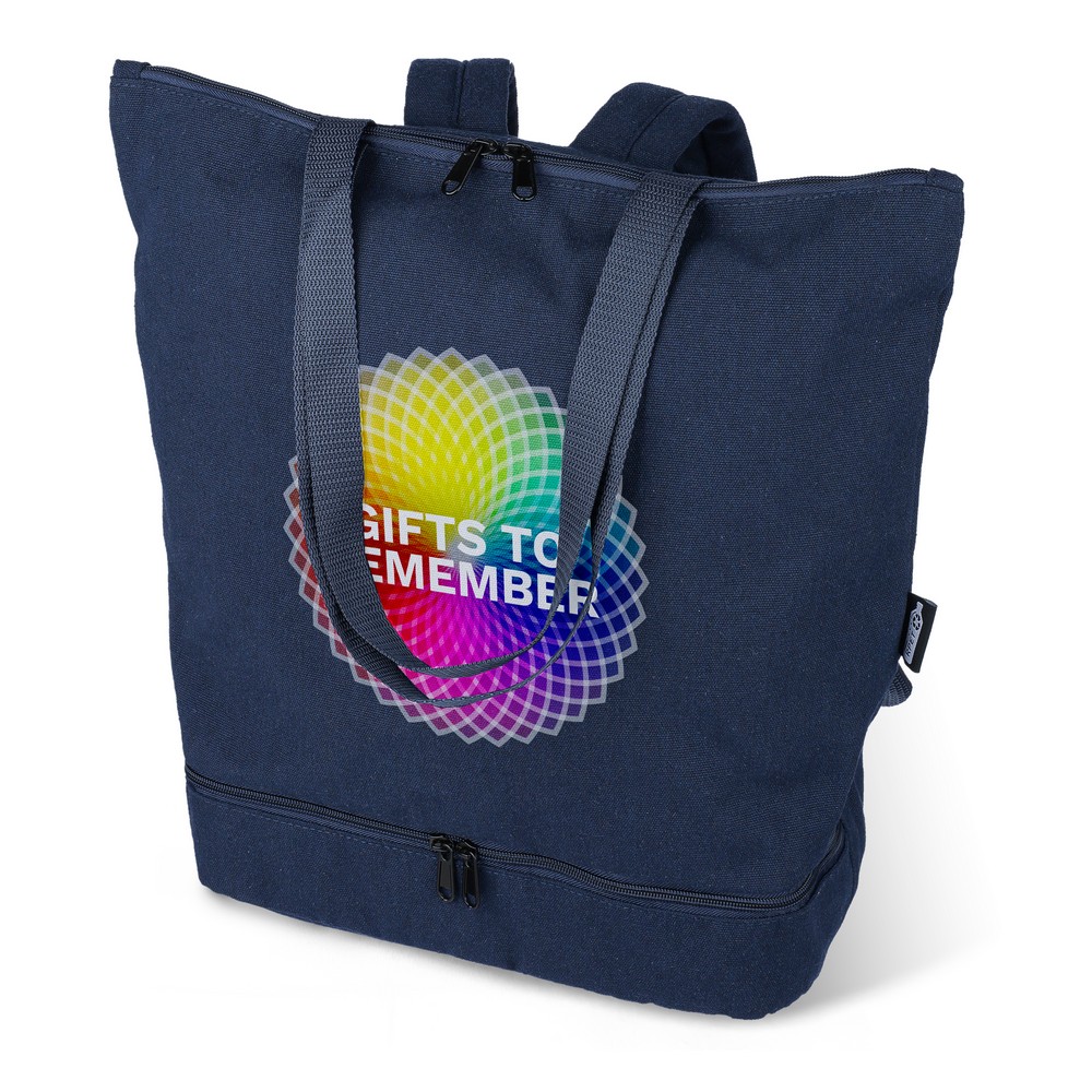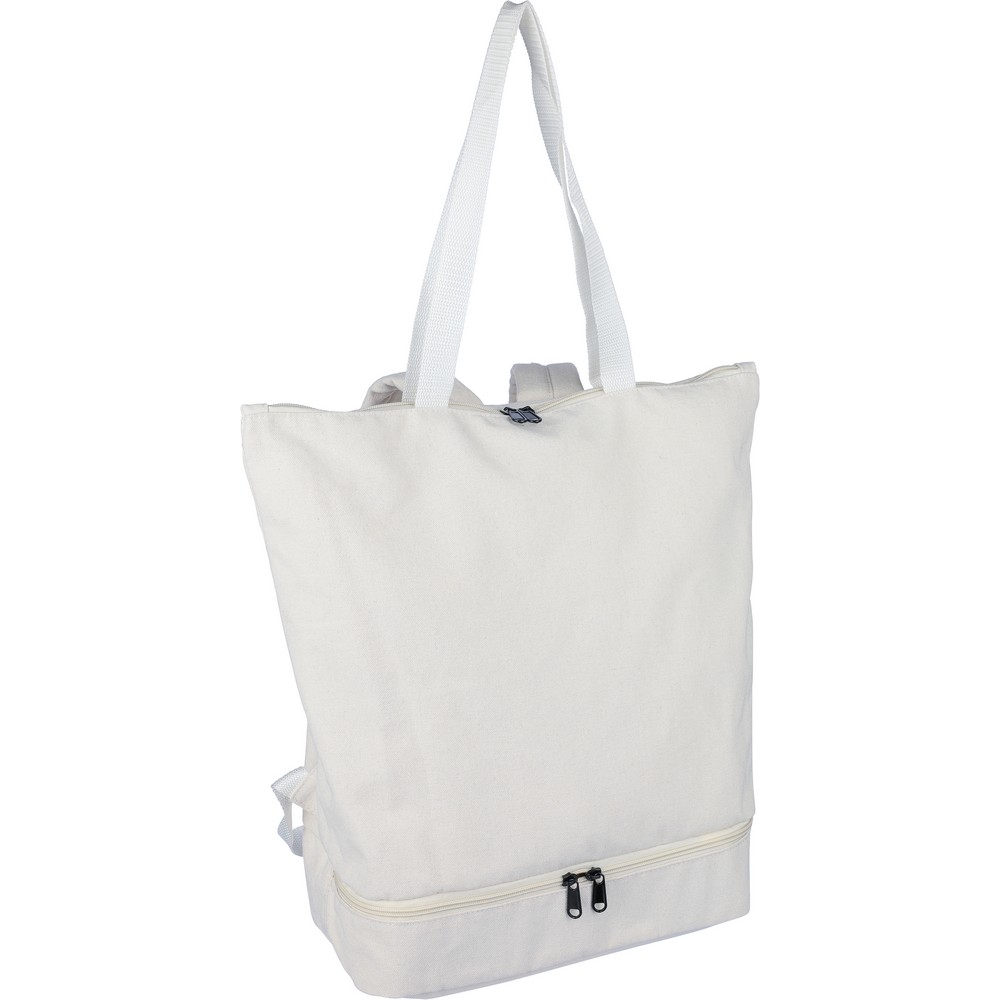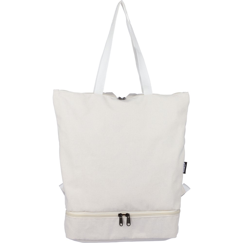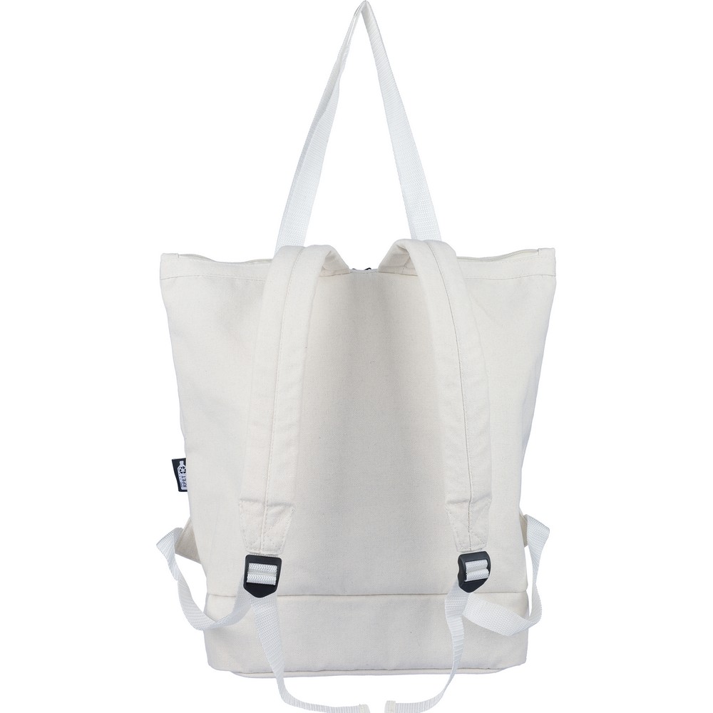 Plecak z funkcją torby na ramię, posiada dużą komorę zapinaną na zamek na górze, komorę zapinaną na zamek na dole, przegrodę na laptopa 15″, dwie kieszenie wewnętrzne oraz jedną zewnętrzną kieszeń na zamek, konstrukcja obejmuje długie uchwyty do noszenia, wyściełane, regulowane szelki, pojemność: 30L, maksymalne obciążenie: 15 kg, produkt wykonany polibawełny z recyklingu (330 g/m²), podszewka z poliestru 210D